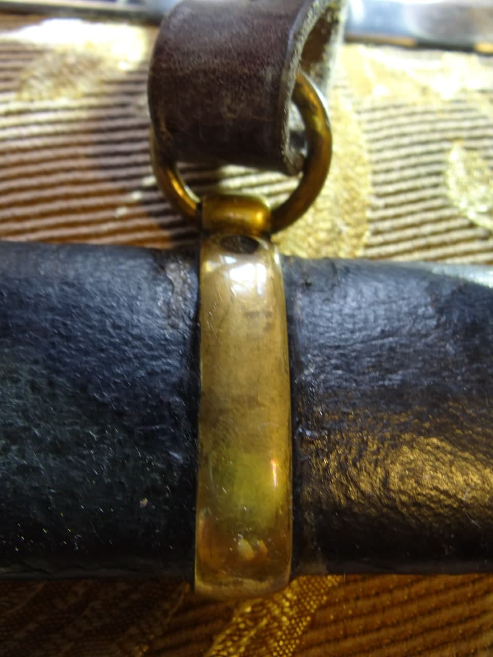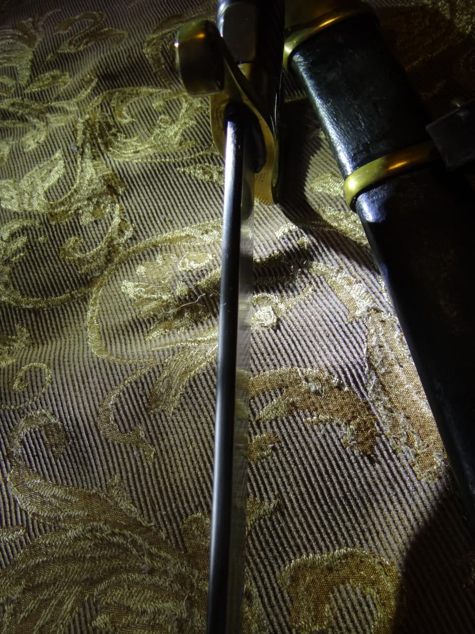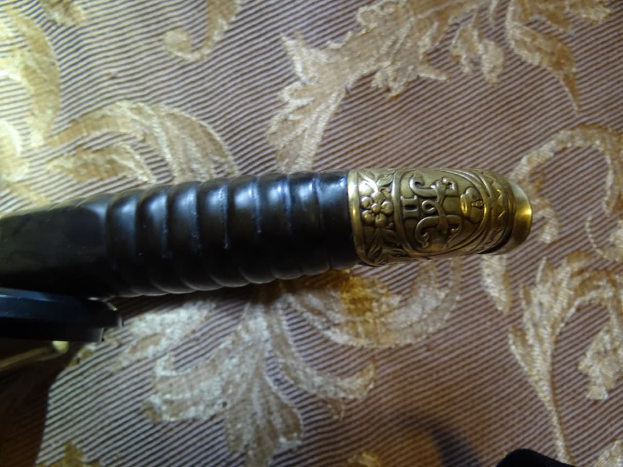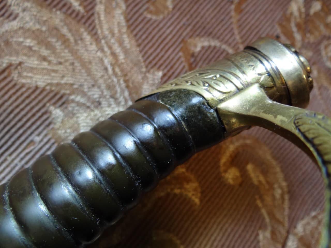 Реставрация скола на бекелите рукояти, реставрация наконечника ножен (все на фото).