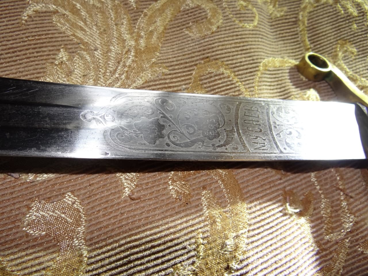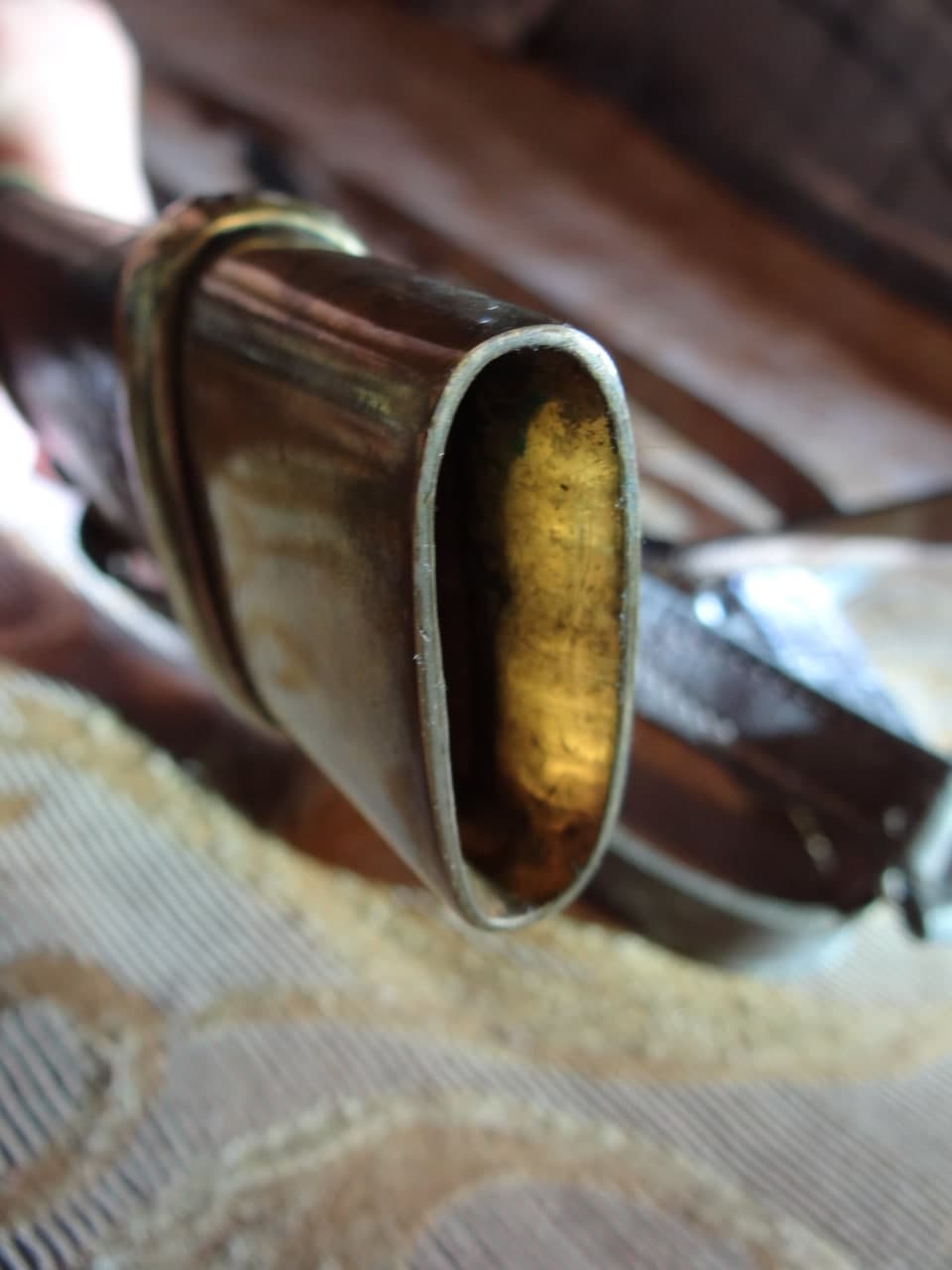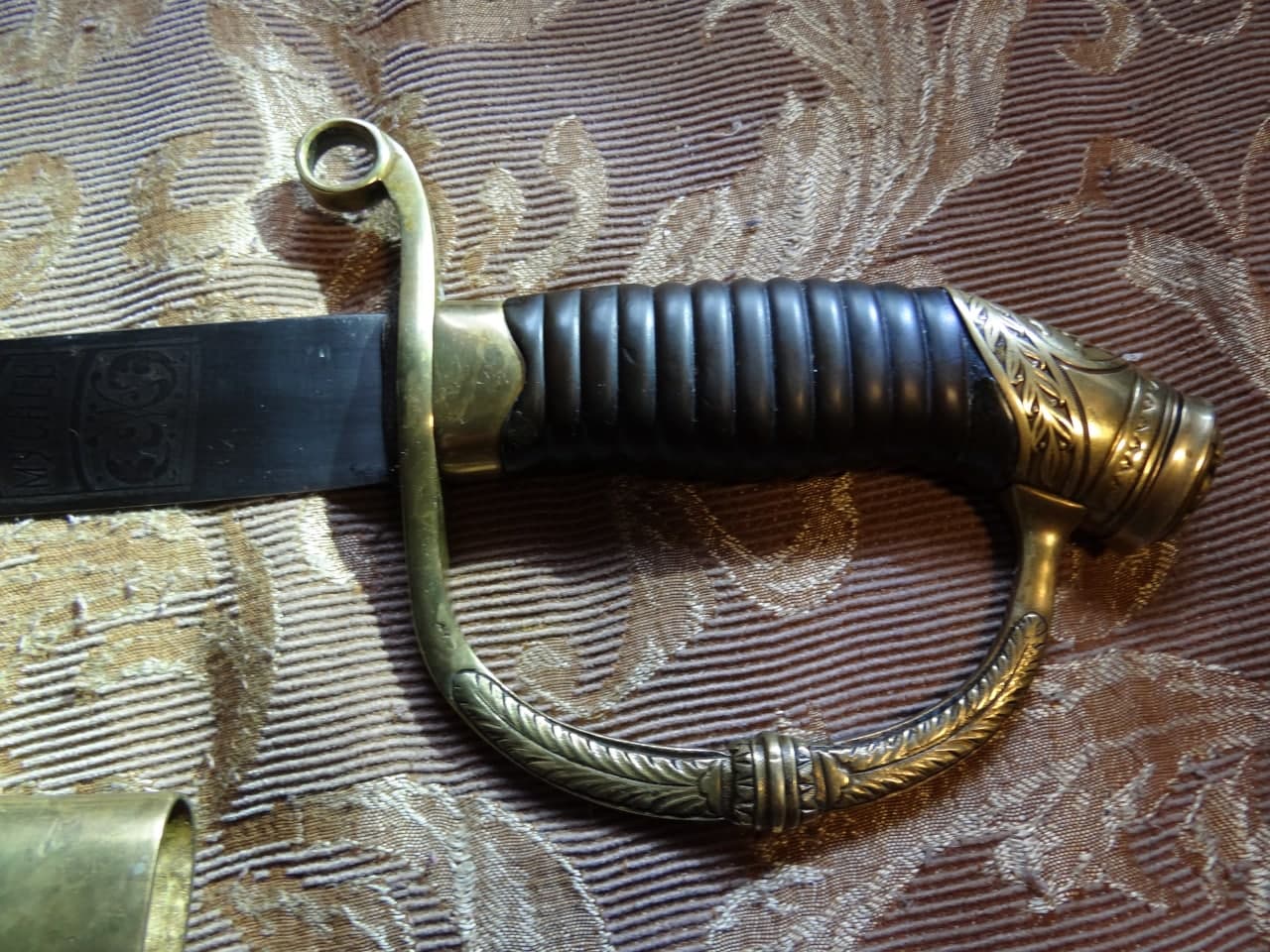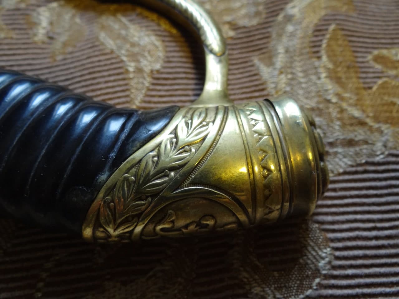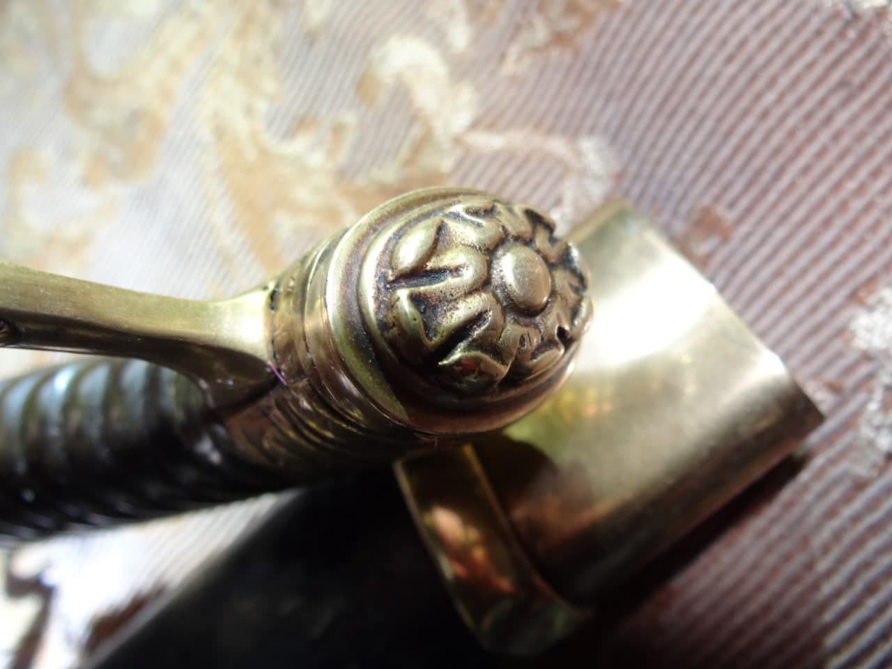 Реставрация скола на бекелите рукояти, реставрация наконечника ножен (все на фото).