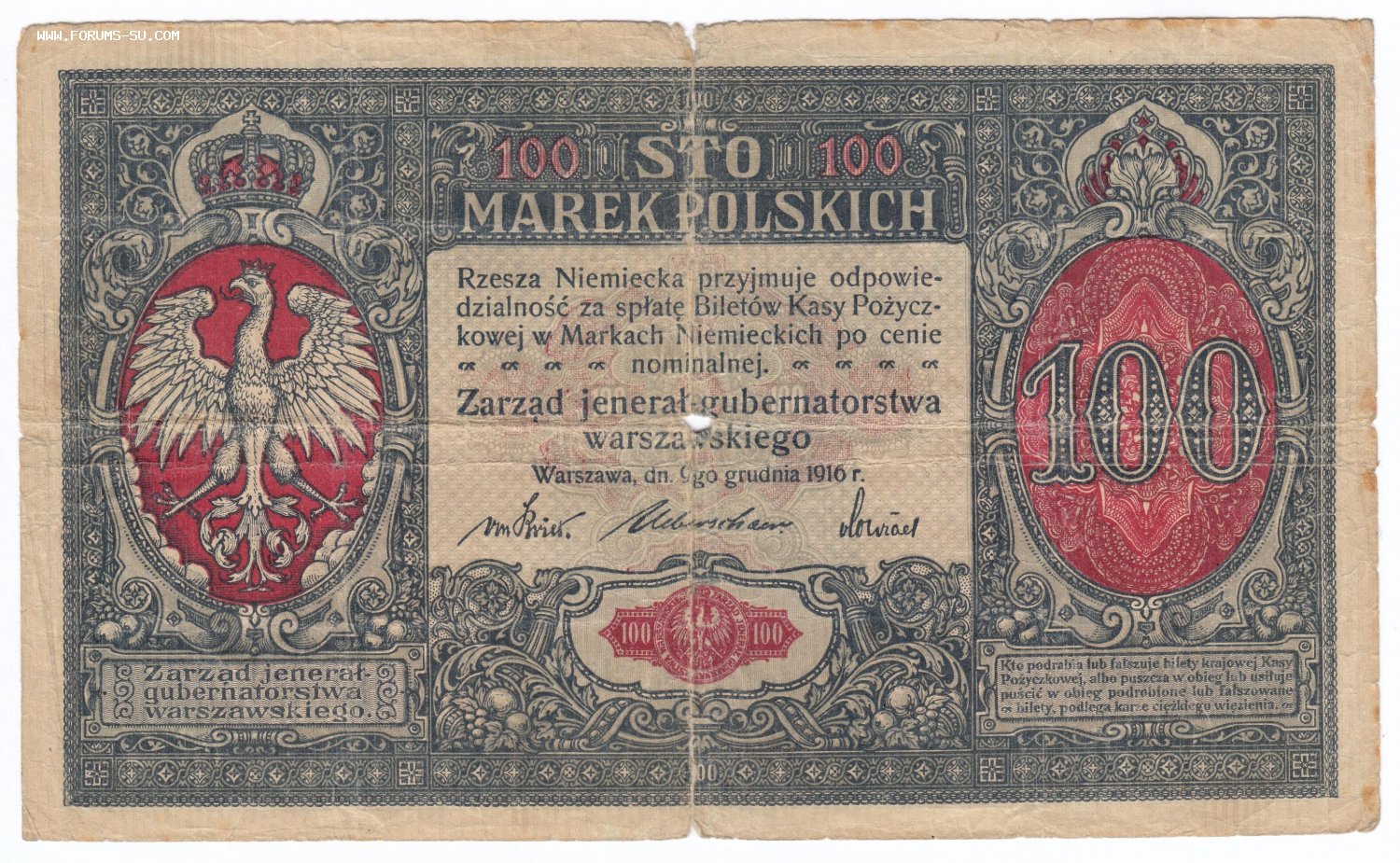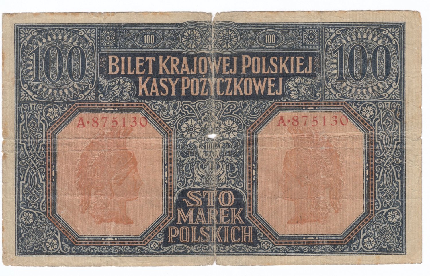 100 марок польских. Польша 1916 год, серия А.