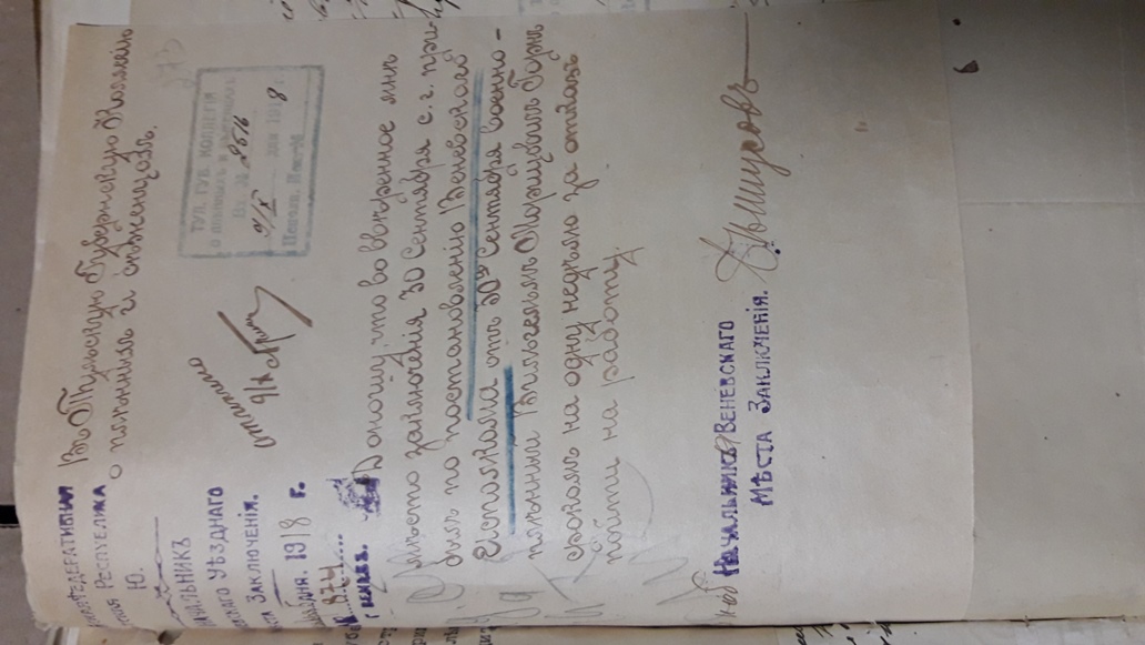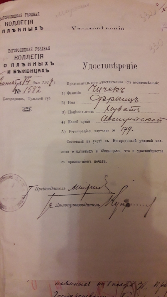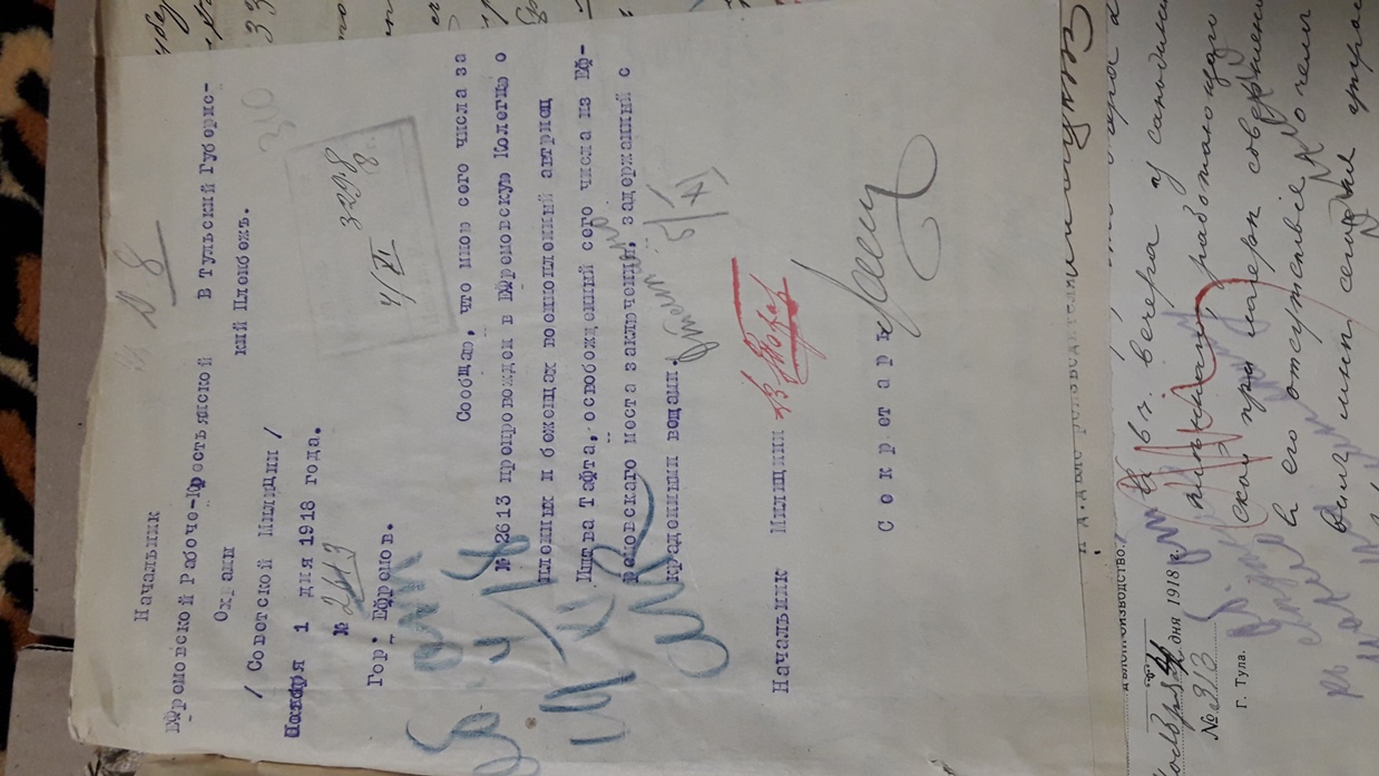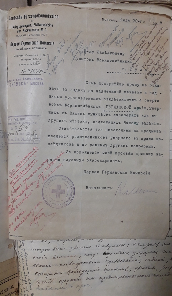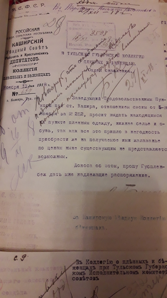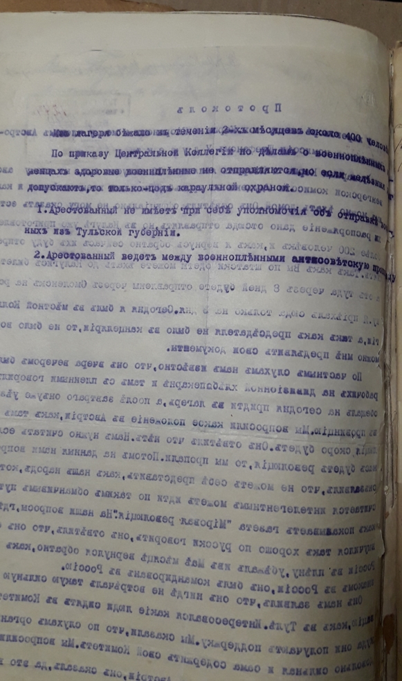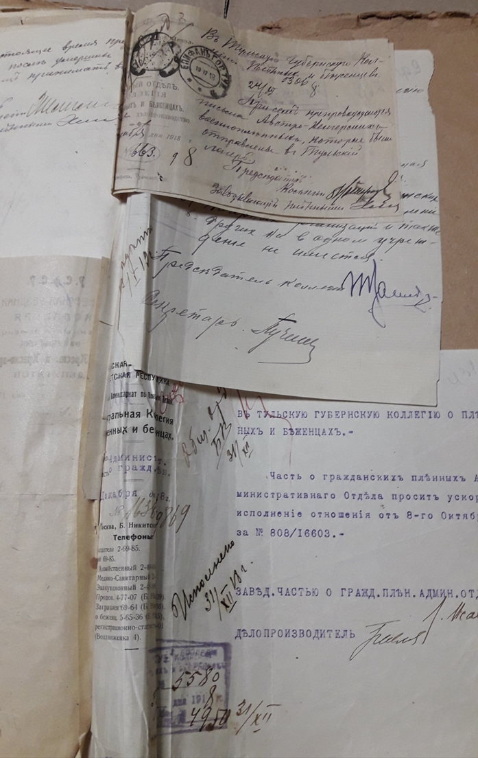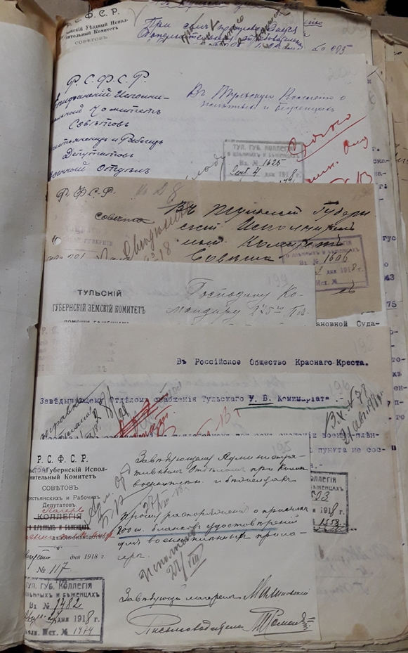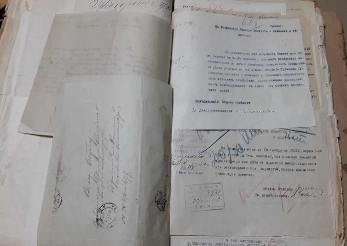 Подшивка документов (переписка) Тульской коллегии о пленных и беженцах за весь 1918 год. Все уездные коллегии Тульской губернии. Запросы Германской, Австро-Венгерской комиссий по делам военнопленных, Шведской королевской миссии, ответы из ЧК, удостоверения военнопленных, план лагеря военнопленных, информация о ведении военнопленными антисоветской пропаганды, удостоверения на право следования на родину и многое другое. Всего 431 лист.
