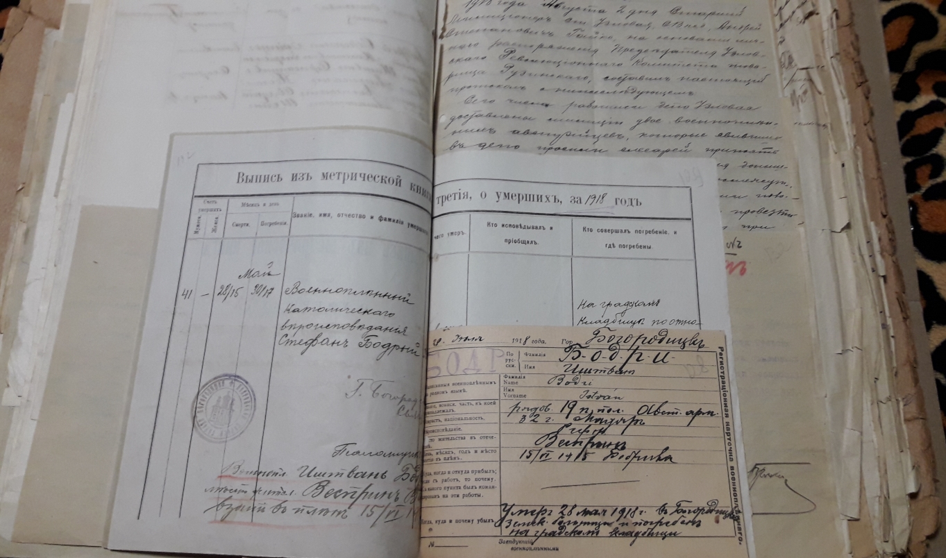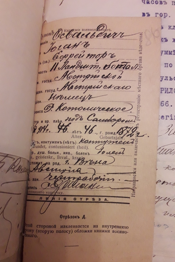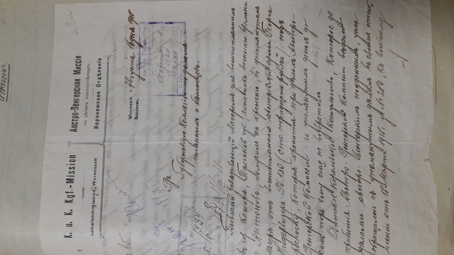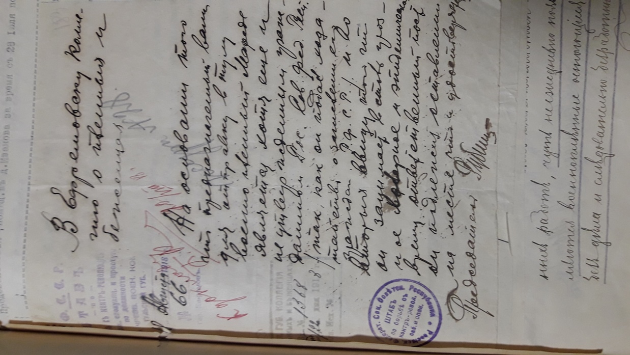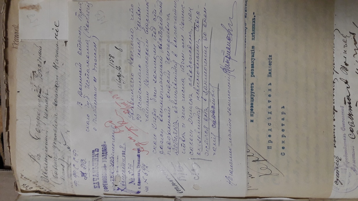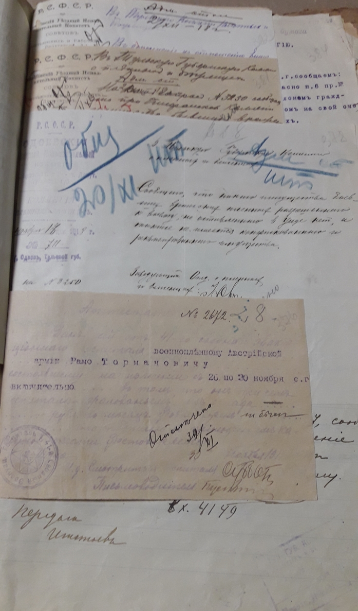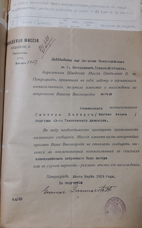 Подшивка документов (переписка) Тульской коллегии о пленных и беженцах за весь 1918 год. Все уездные коллегии Тульской губернии. Запросы Германской, Австро-Венгерской комиссий по делам военнопленных, Шведской королевской миссии, ответы из ЧК, удостоверения военнопленных, план лагеря военнопленных, информация о ведении военнопленными антисоветской пропаганды, удостоверения на право следования на родину и многое другое. Всего 431 лист.