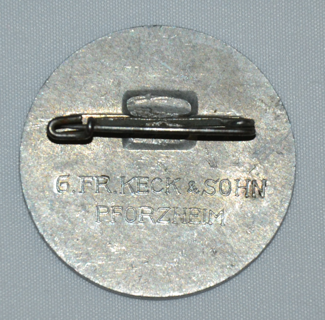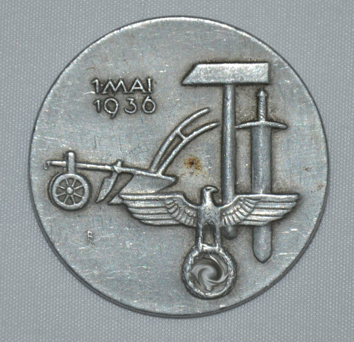 Значок пропагандистский (агитационный) посвященный празднику труда 1 мая 1936 года. Германия, 3 Рейх (1933-1945 гг.). Производственное изготовление фирмы Эрнста Мюллера города Пфорцхайма. Сплав металлов на основе цинка.