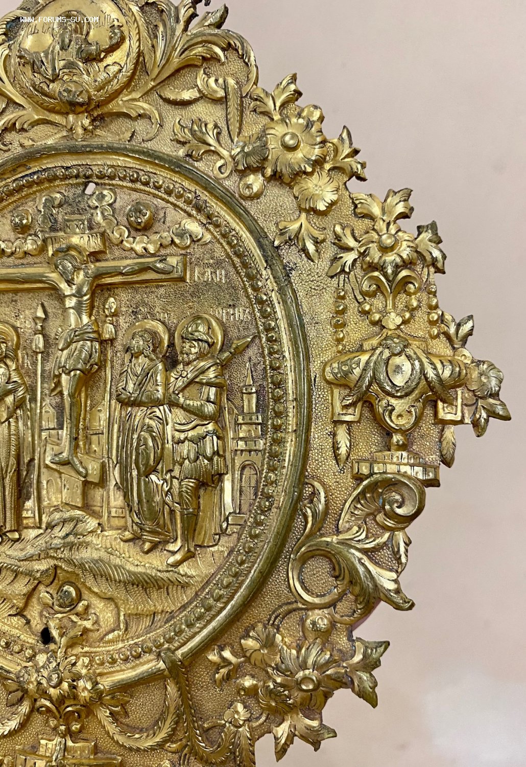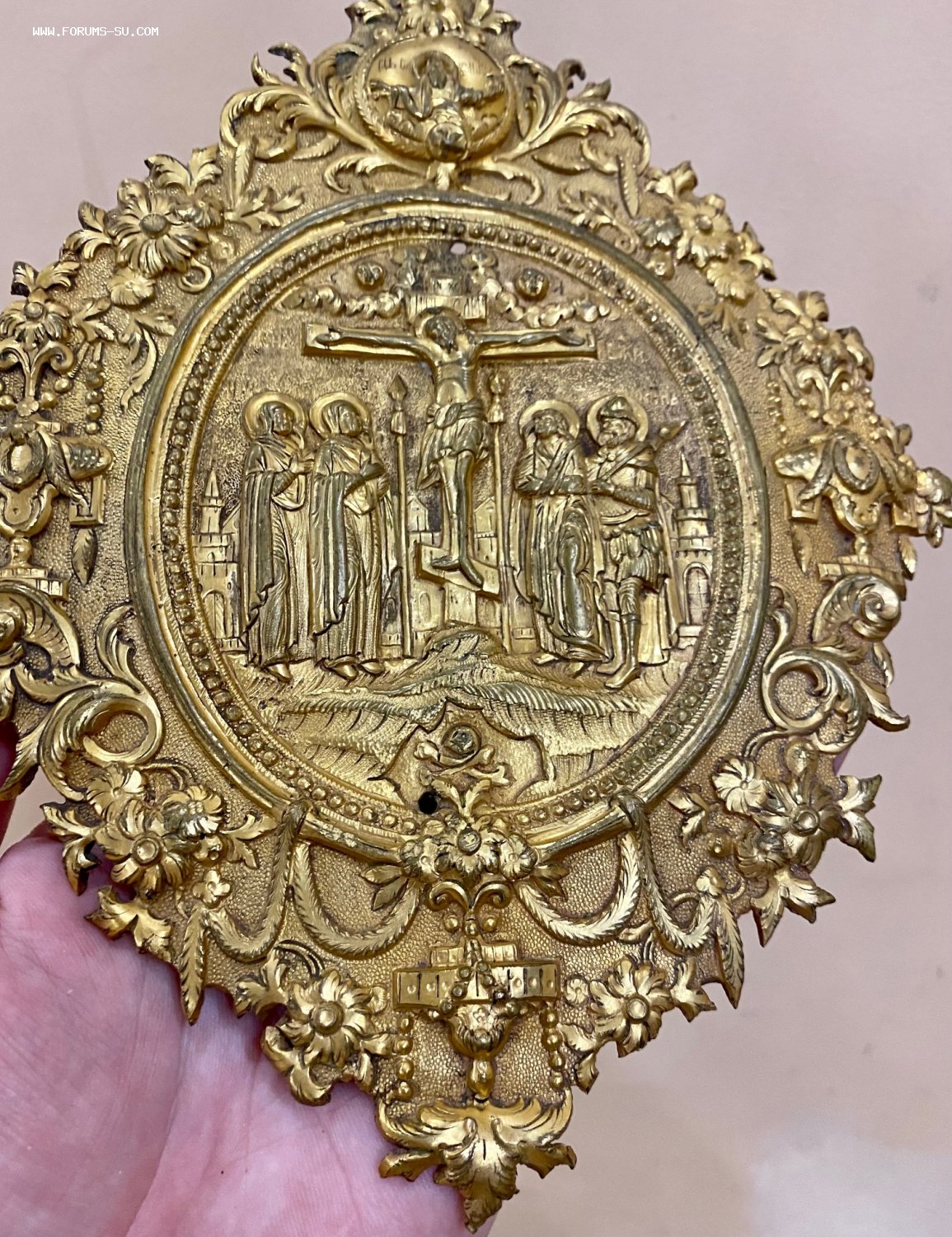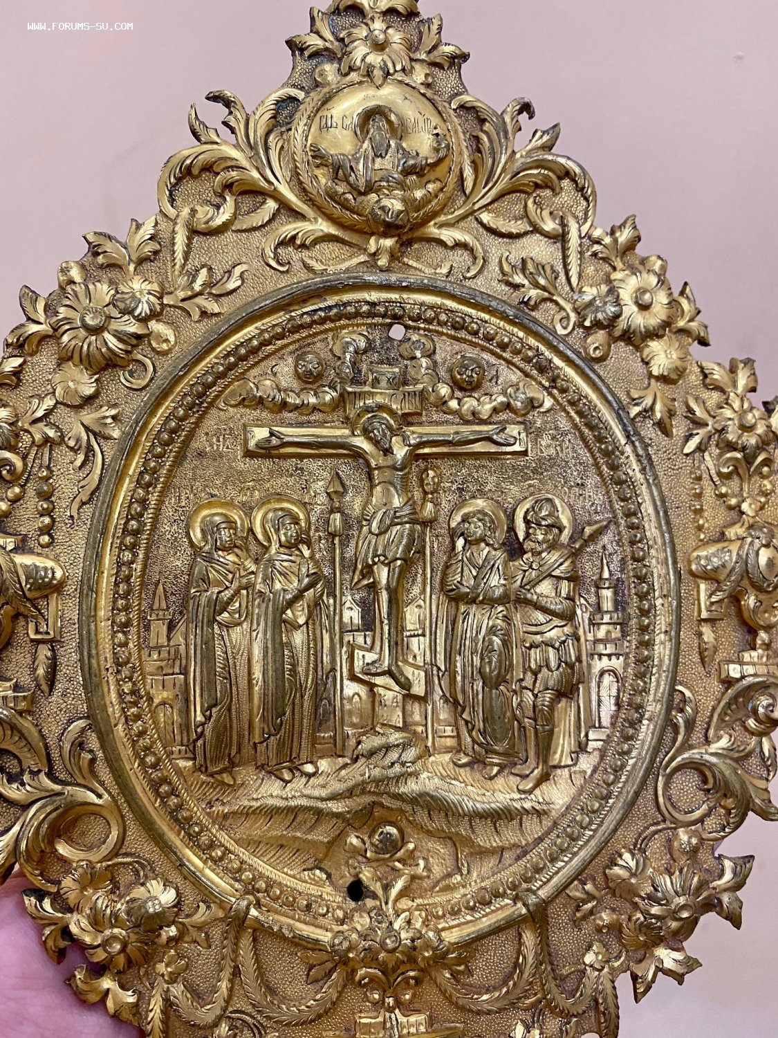 Большая рельефная накладка на книгу со сценой Распятия Христова. Золочение. Размер 21,5 х 17 см.