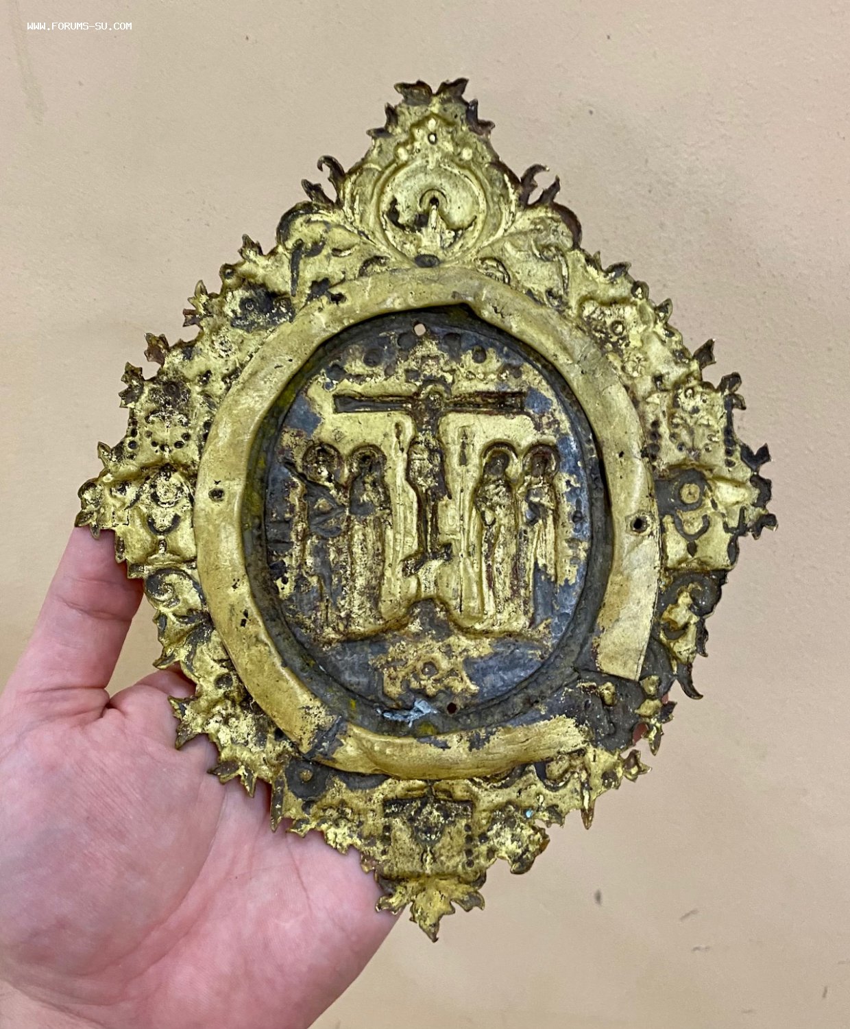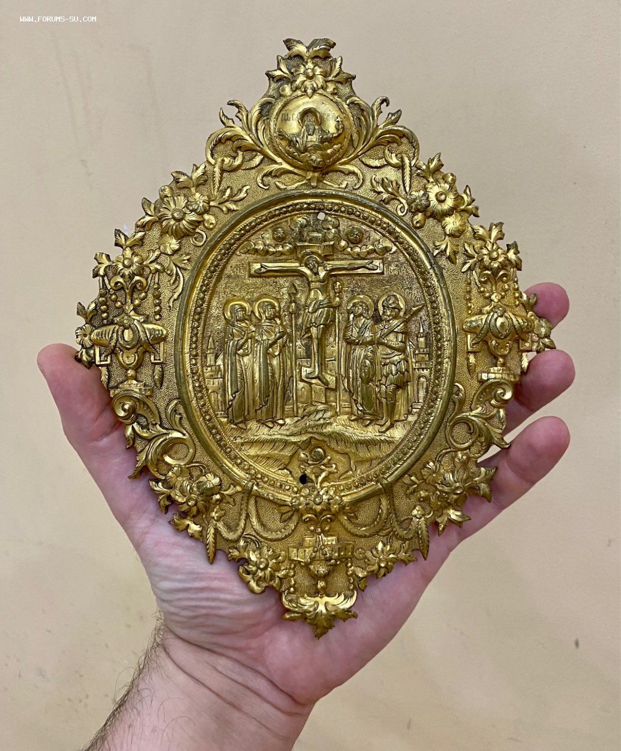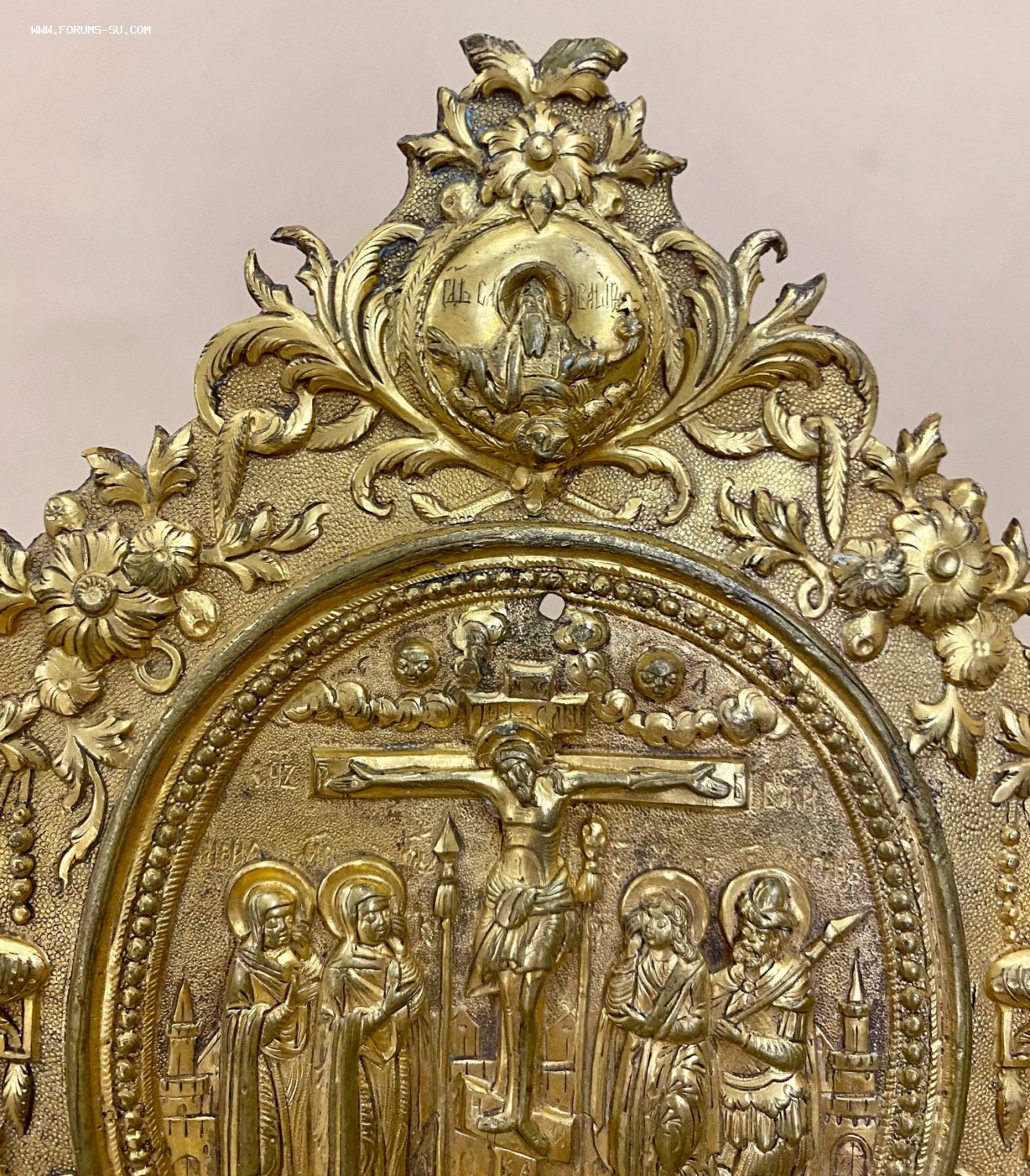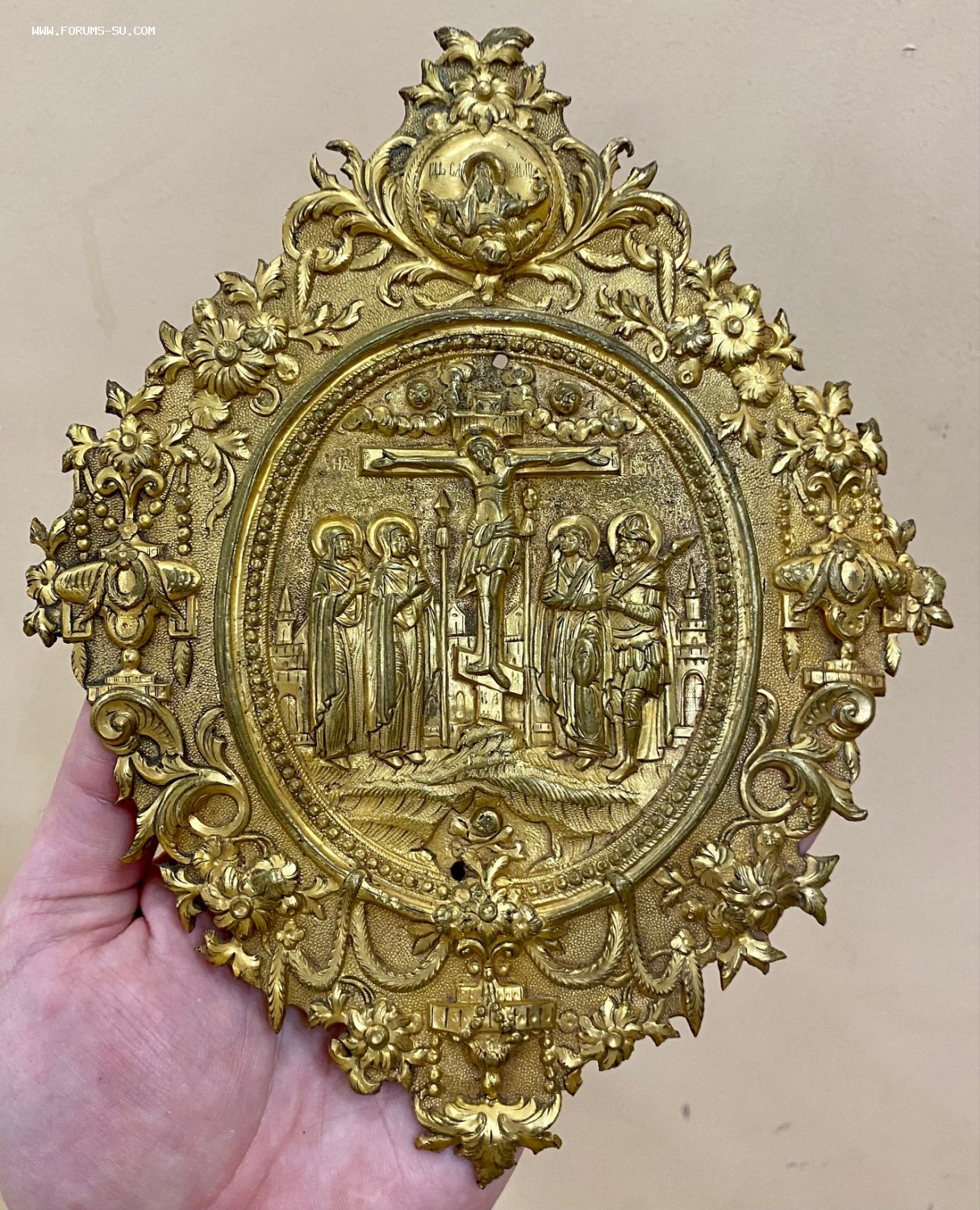 Большая рельефная накладка на книгу со сценой Распятия Христова. Золочение. Размер 21,5 х 17 см.