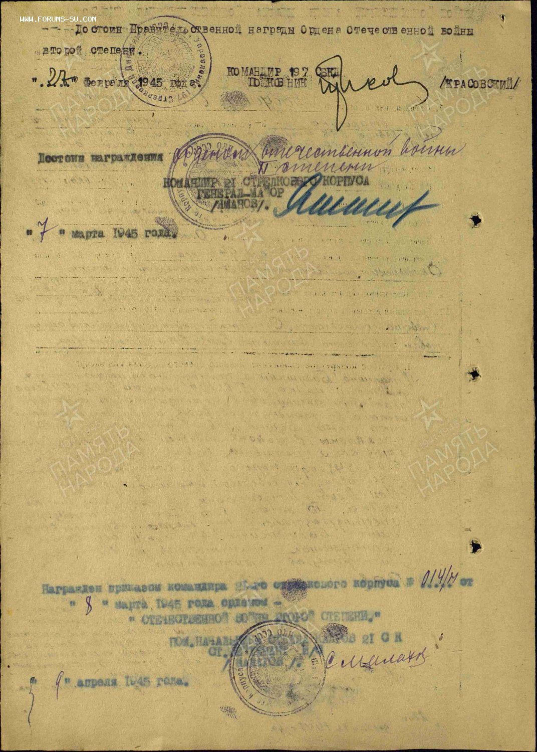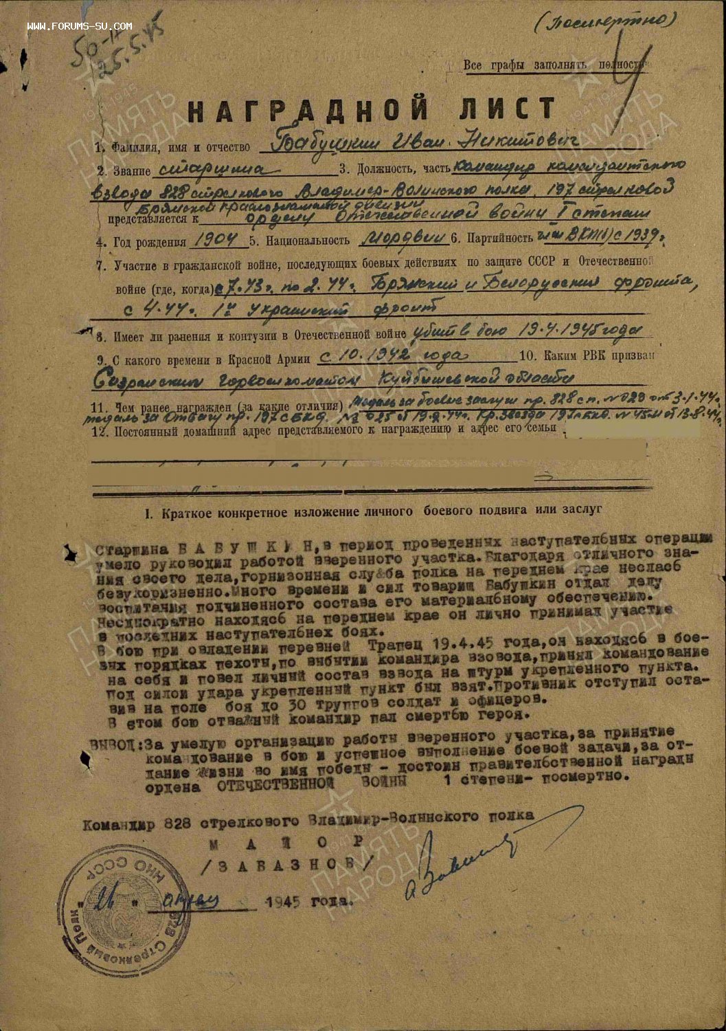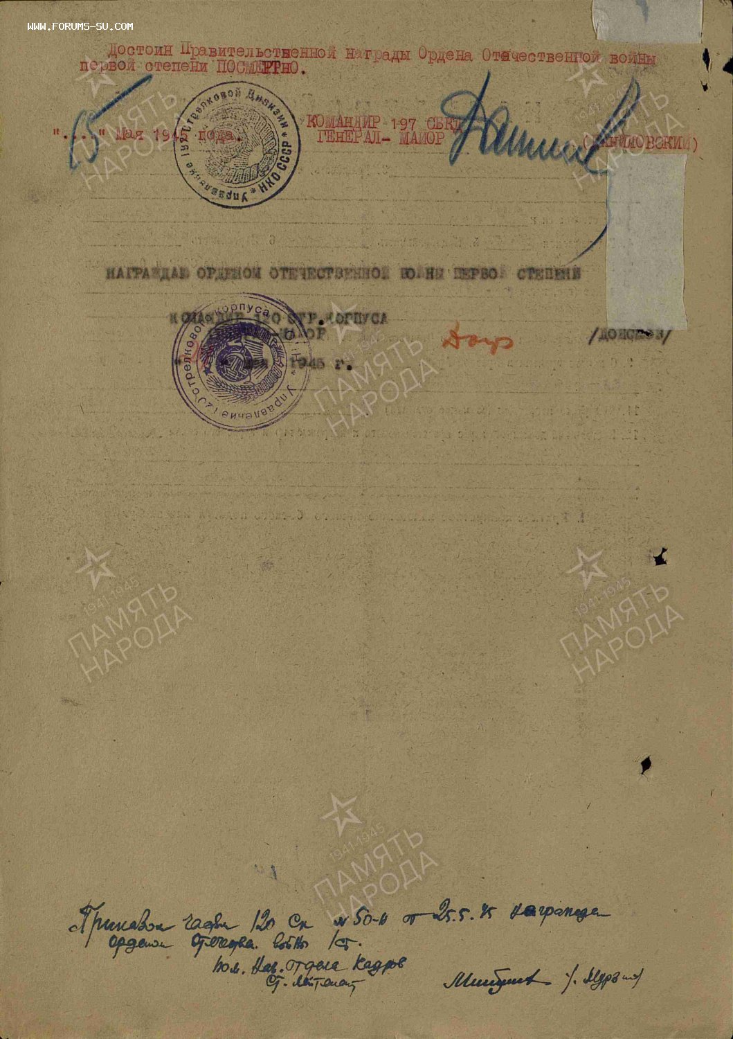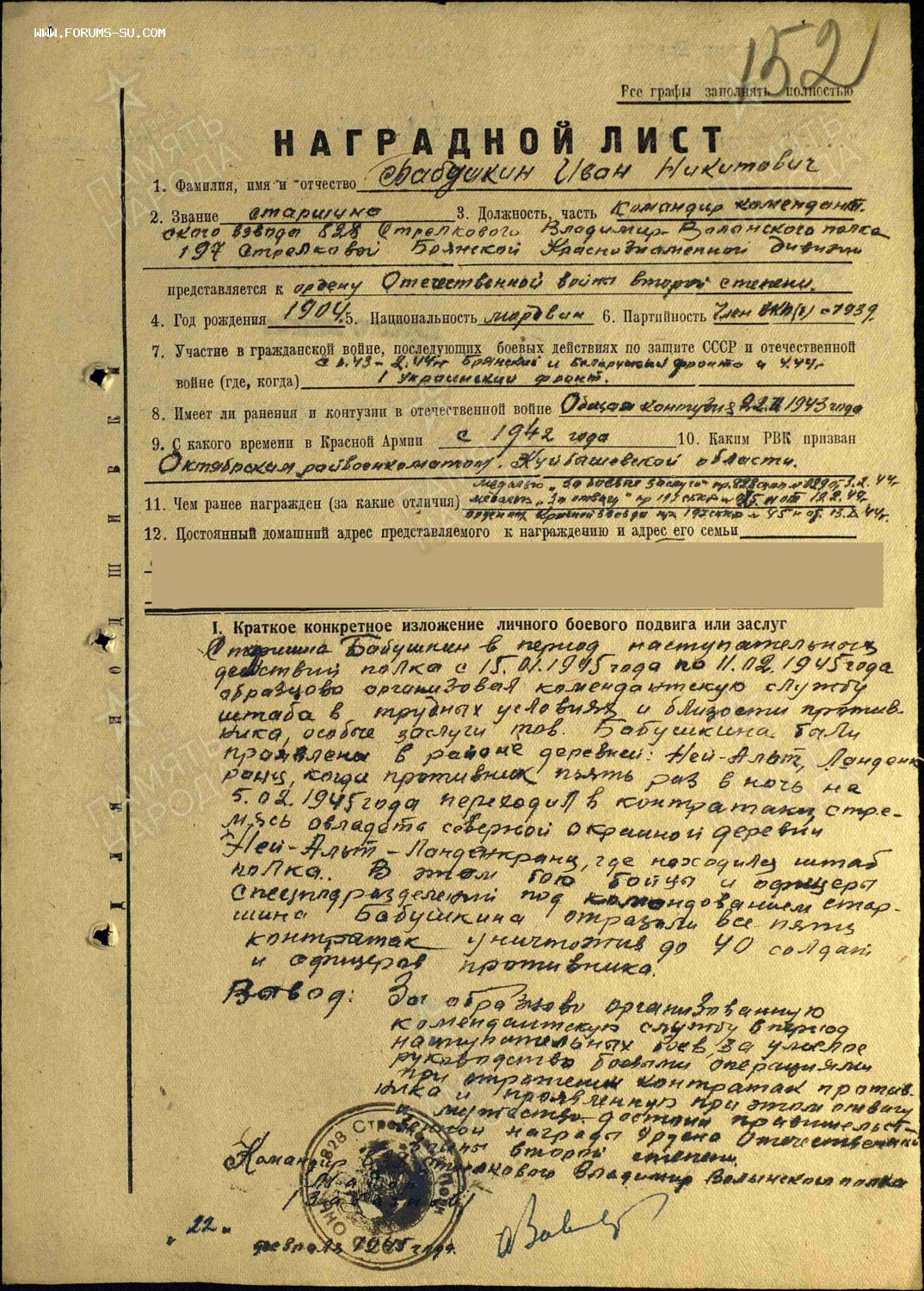 ОРДЕНА ОВ 1 ст и 2 ст на старшину комендантского взвода. Геройские наградные. ОВ 1ст. -посмертно. Состояние наград -люкс. Документ.