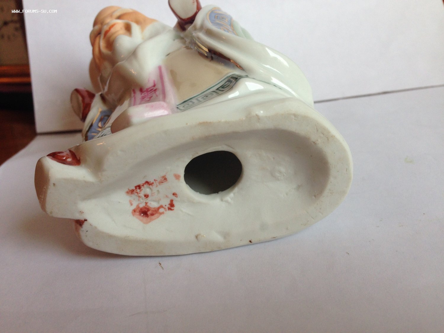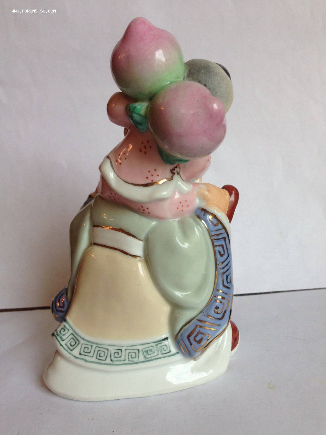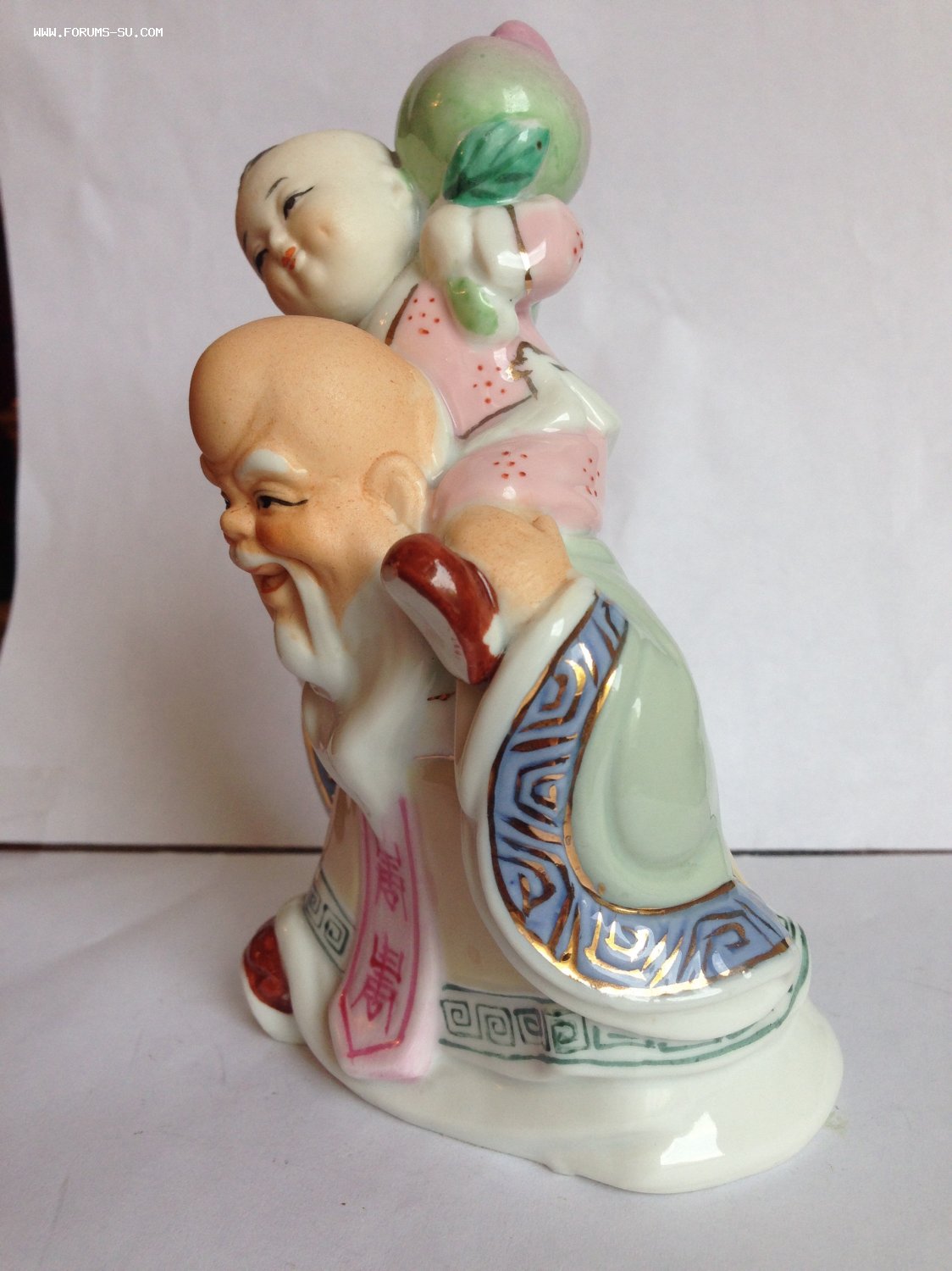 Китай , 20 век, 13 см, изображение персонажей из даосизма: бога бессмертия Шоусина и бессмертного Золотого отрока. Очень редкая статуэтка: обычно эти персонажи представлены в статуэтках по отдельности, вдвоём в одной статуэтке встречаются редко. Имеются 2 клейма: одно вдавлено в тесто и сверху на него нанесено еще красное клеймо. Состояние идеальное.