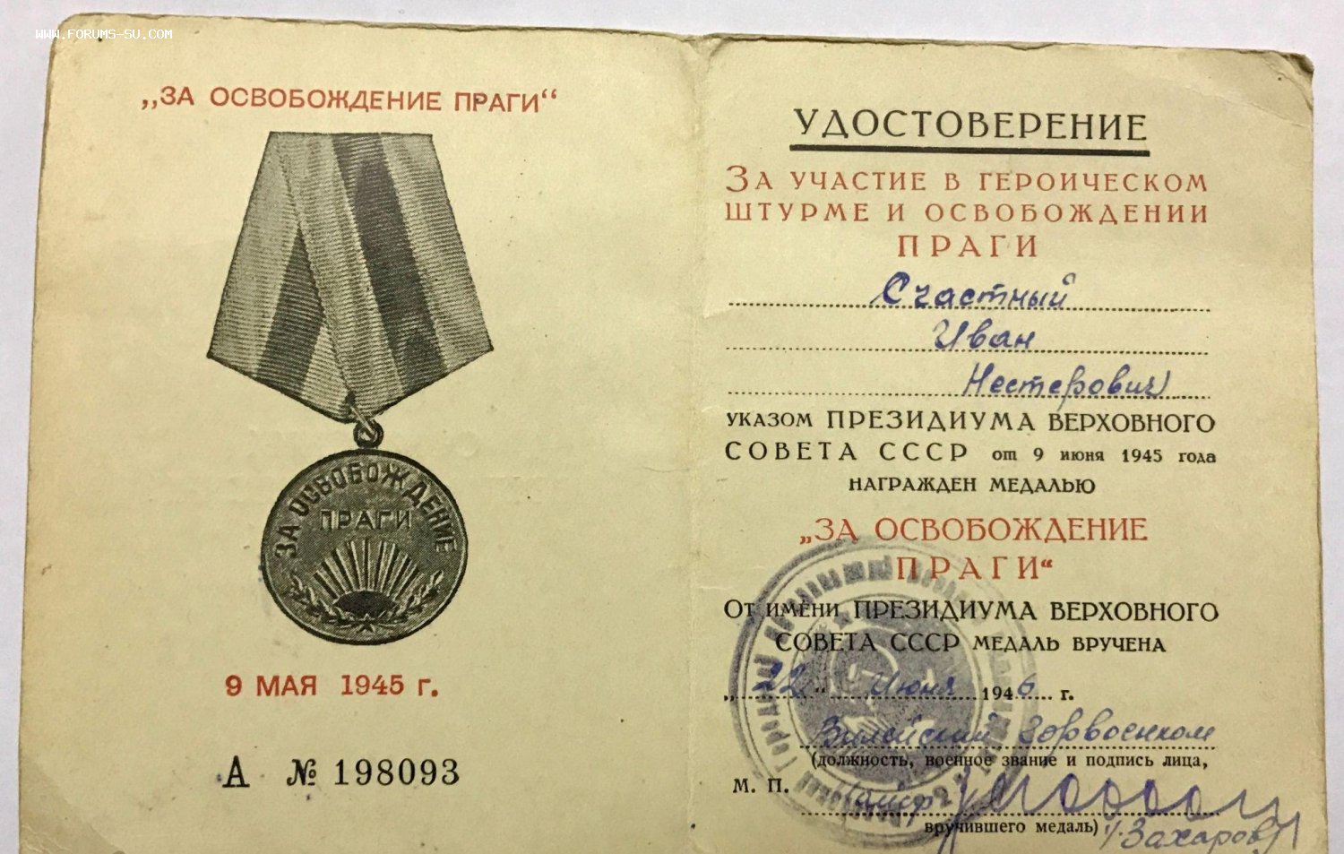 Документ к медали ЗА ОСВОБОЖДЕНИЕ ПРАГИ. Серия А