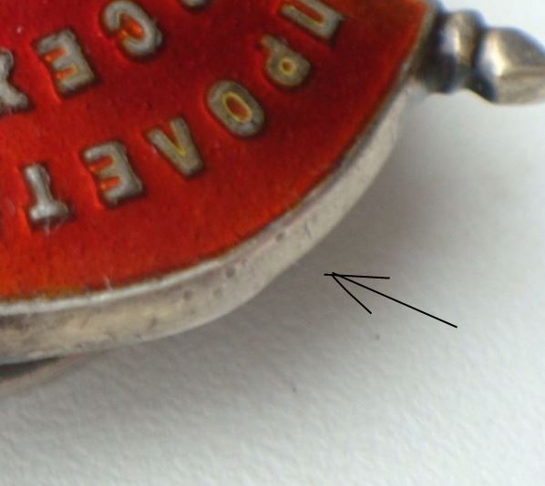 Если посмотреть на реверс, то вокруг винта видны многочисленные следы ударов, которых на винтовом знаке вокруг винта в принципе не могло возникнуть. Это переделка из подвесного с перерезкой номера, левым винтом и красивой искусственной химической патиной.
