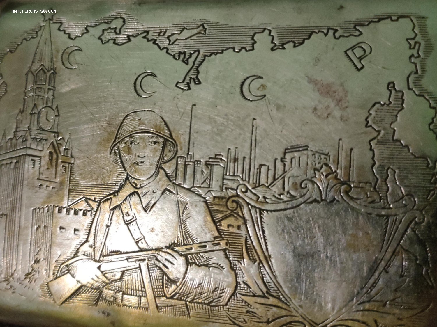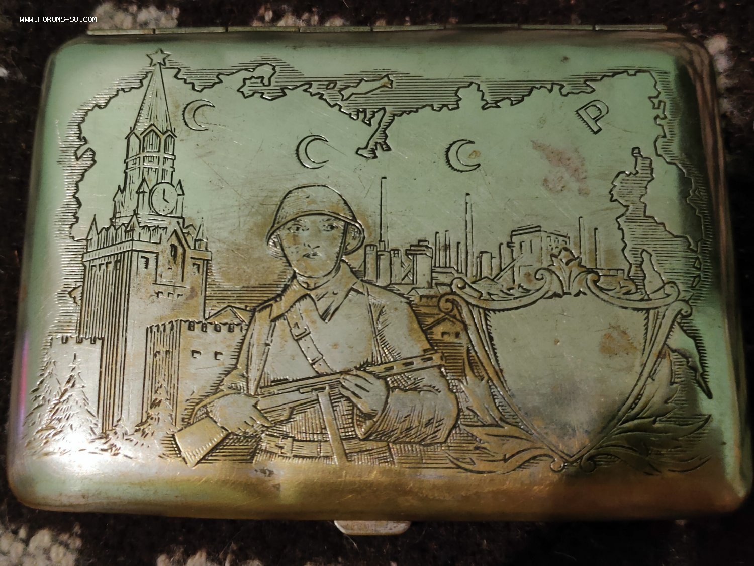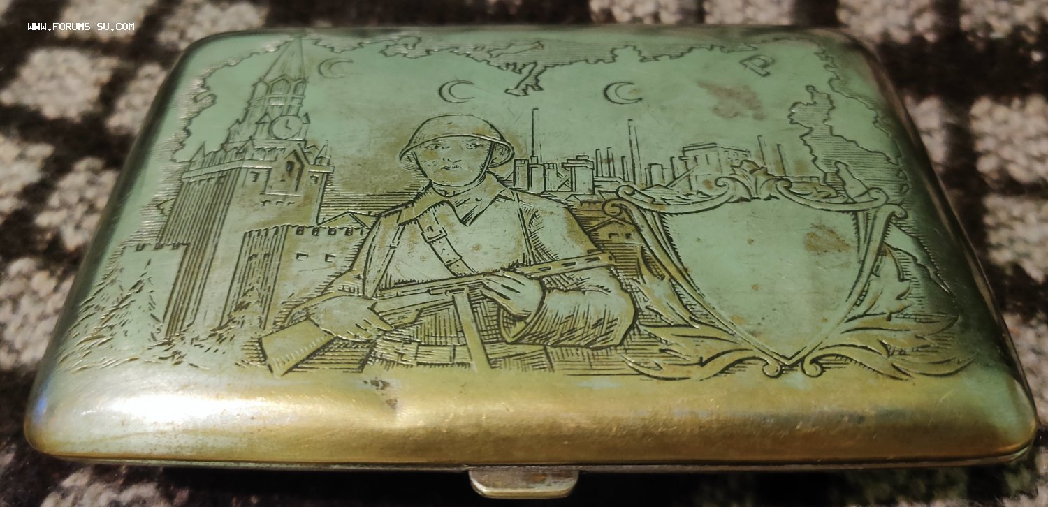 Портсигар пропаганда солдат с ППД ,Кремль , карта СССР. Заводской полностью (не окопное творчество) с обеих сторон ,и сюжет, и гильоше. Латунь серебрение. Выпущен,думаю, между 44 и 47 гг.