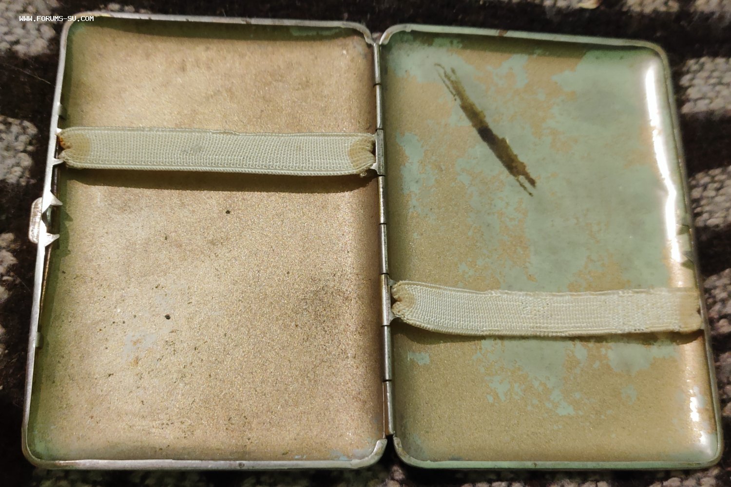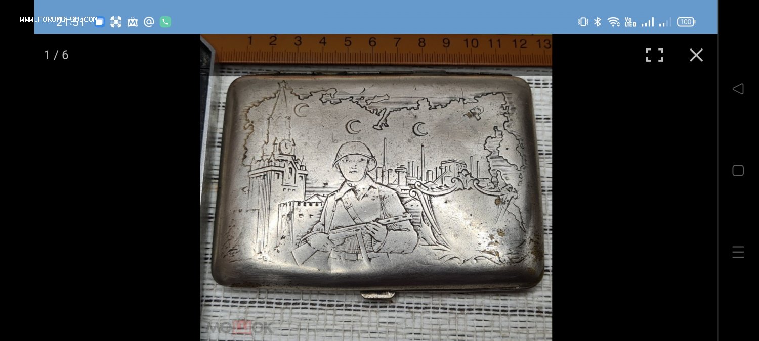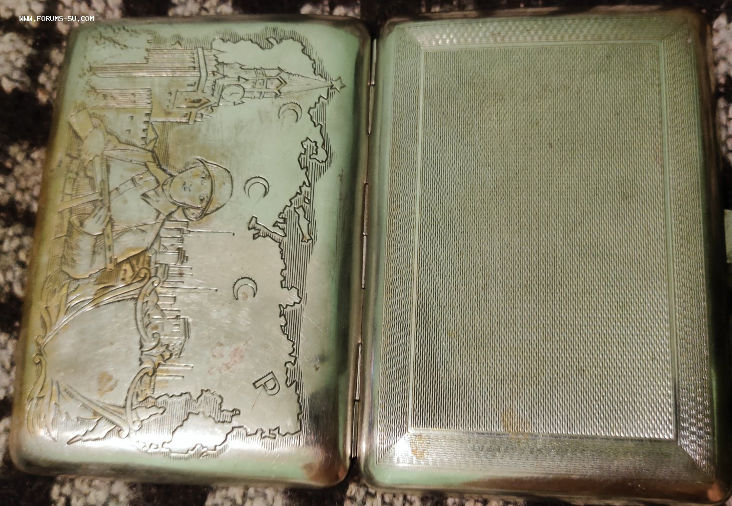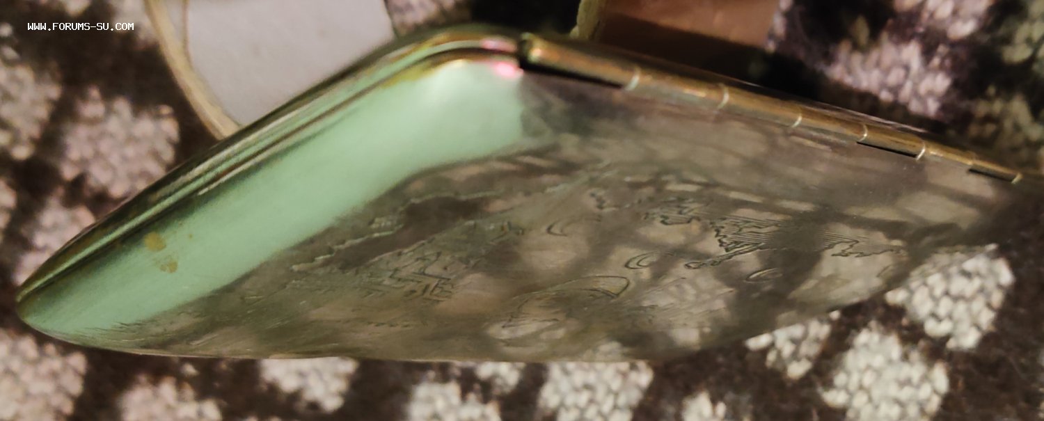 Портсигар пропаганда солдат с ППД ,Кремль , карта СССР. Заводской полностью (не окопное творчество) с обеих сторон ,и сюжет, и гильоше. Латунь серебрение. Выпущен,думаю, между 44 и 47 гг.