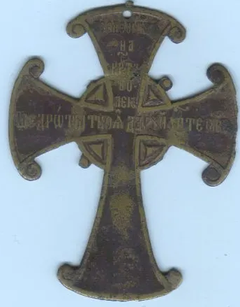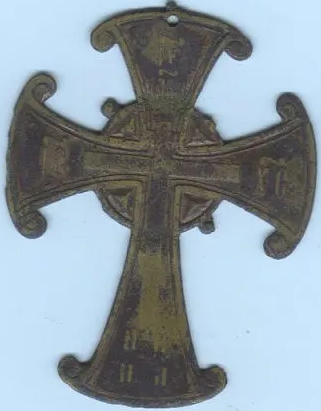 В семье хранился данный крест. Пытался найти подобный крест и не нашел на просторах интернета ничего похожего. Может быть кто-то встречал подобные кресты. Буду благодарен за любую информацию, поскольку информация от родственников противоречива. По одной версии это крест предков, а по другой найден на старой рязанской дороге на месте где когда-то было кладбище наполионовской армии и соответственно там были захоронены и наши воины в том же районе.