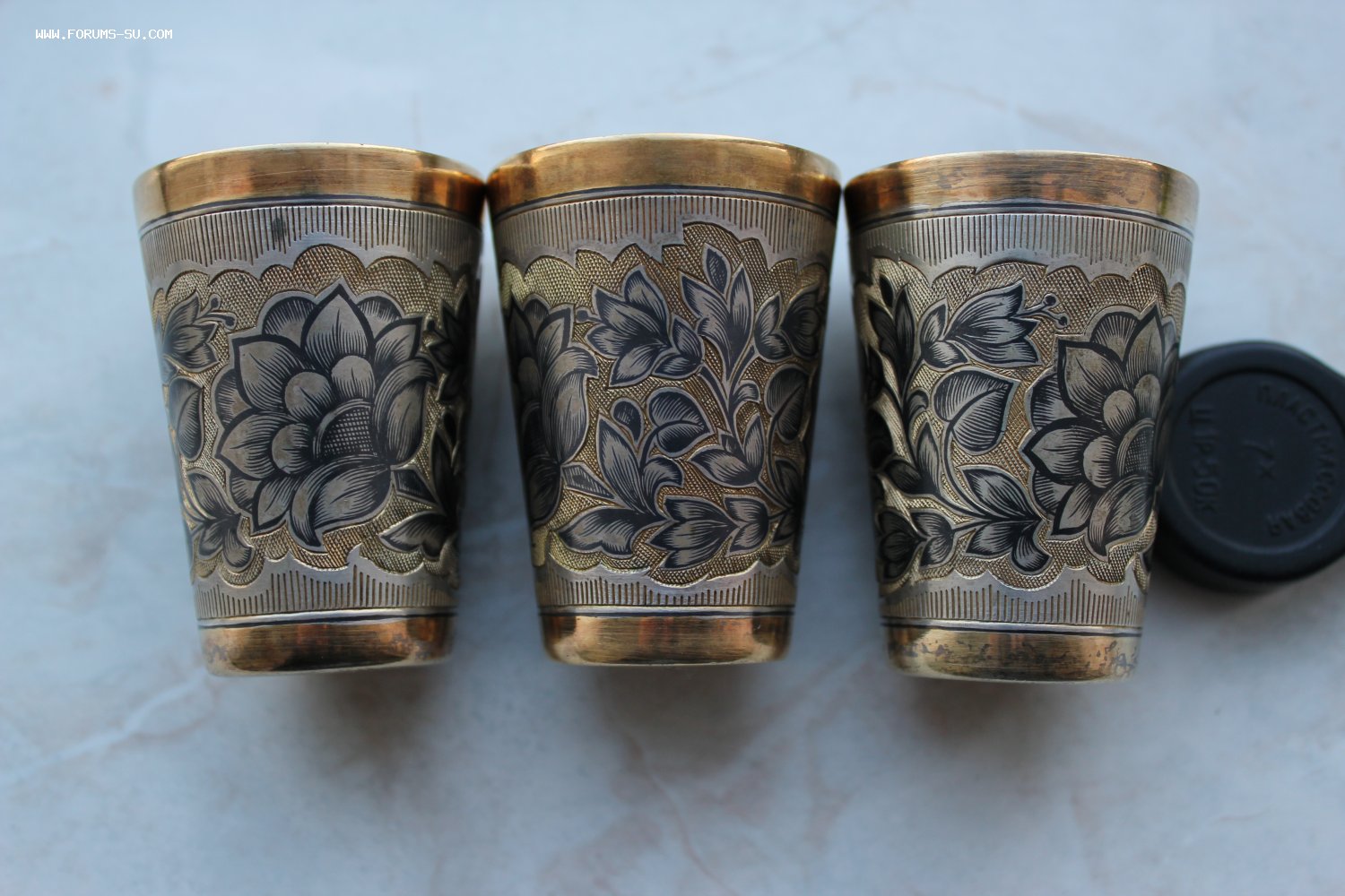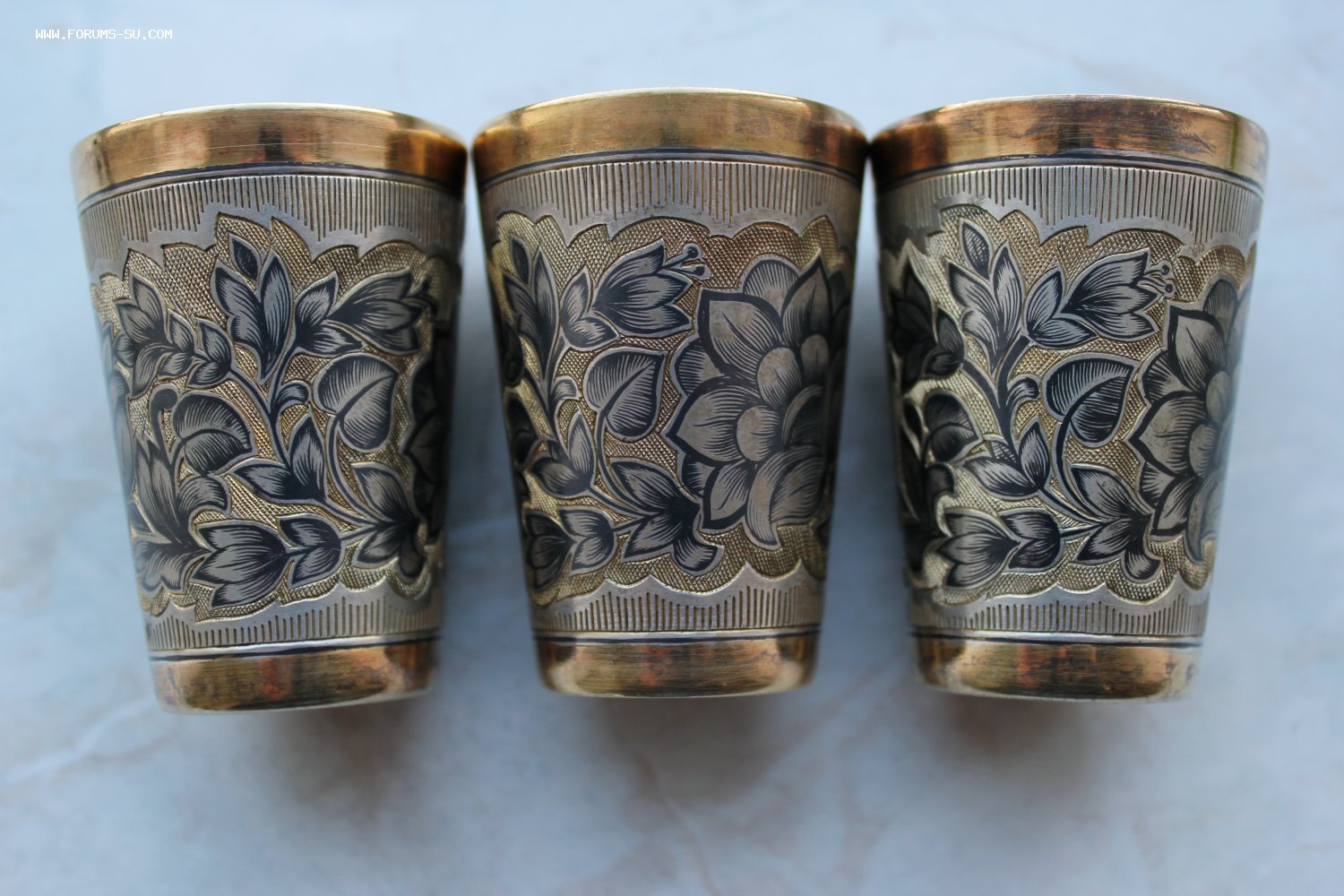 3 стопки. Серебро, позолота, чернь. Красивая работа. Проба-875. Звезда. Клеймо - 6СЧ. Великоустюгский в ювелирный завод «Северная чернь». Год 1976. Пробирная инспекция - Ленинградская. Высота - 5,7 см. Диаметр- 4,2 см. Вес - 112 г. Объём - 40 мл.