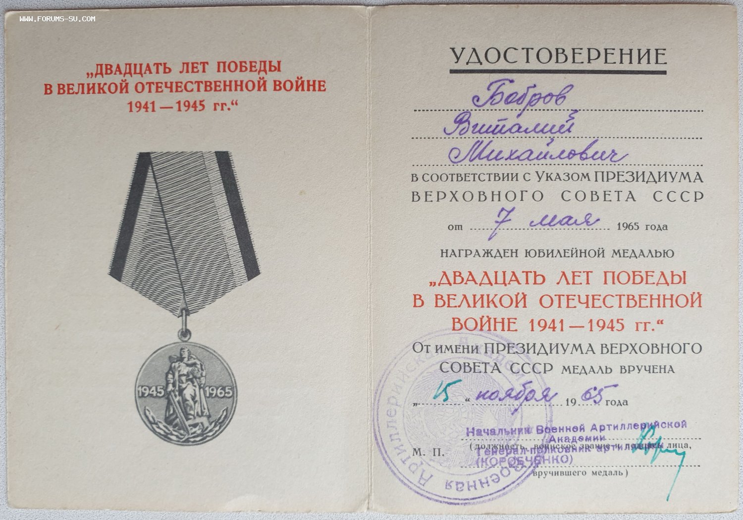 20 лет Победы от генерала-полковника артиллерии Коробченко Василия Стратоновича https://ru.wikipedia.org/wiki/%D0%9A%D0 ... 0%B8%D1%87 = фикс 30 $ + почта