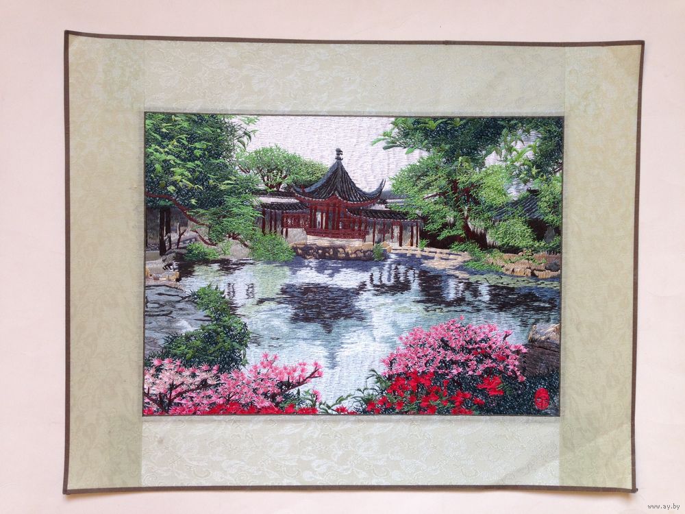 Китай, 20 век, вся поверность картины вышита шелковой нитью. Гобеленовое паспорту. Общий размер 49см Х 39см, размер по паспорту 36см Х 26см
