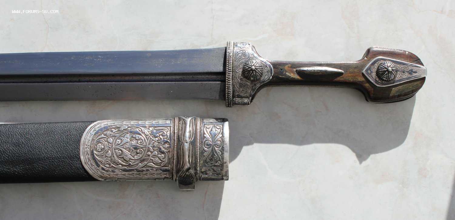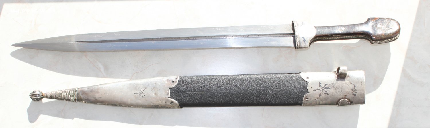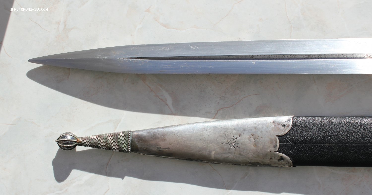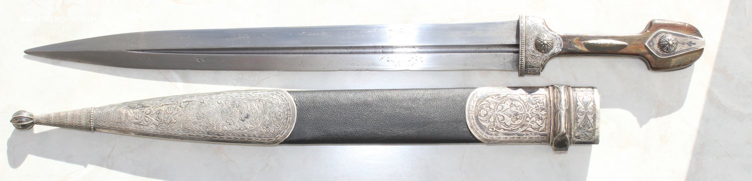 Очень большой кинжал, детали из серебра, Закавказье. Общая длина 63 см, длина клинка 41 см, ширина клинка 4,2 см.