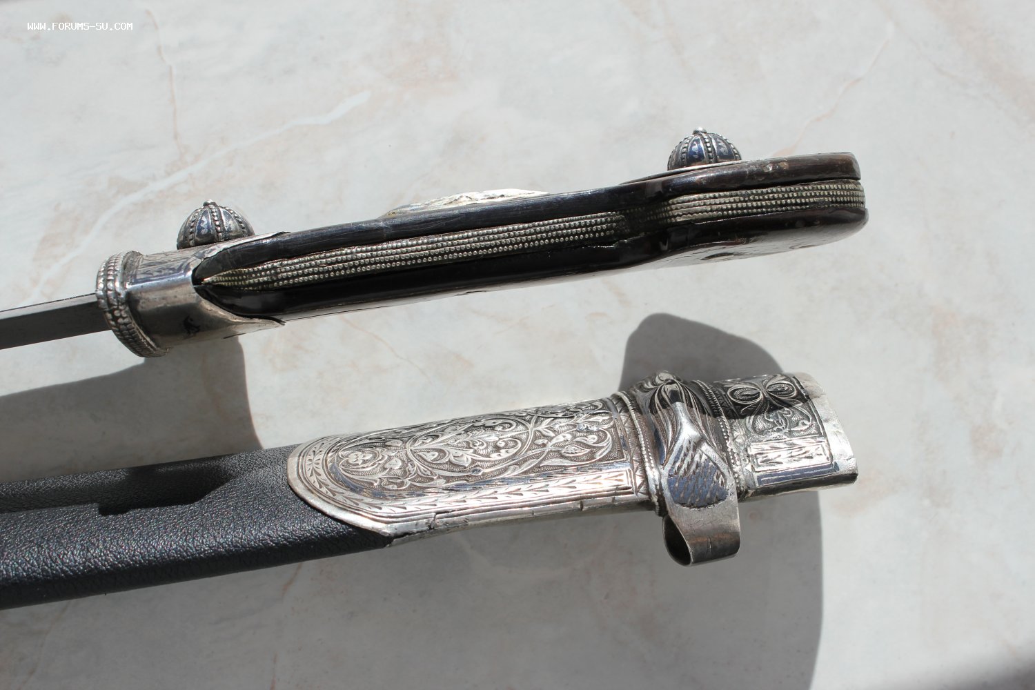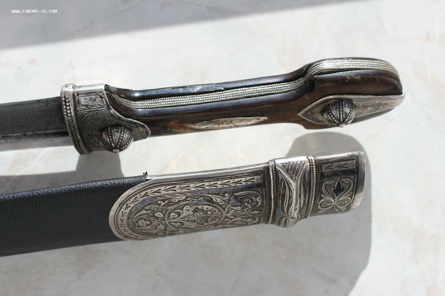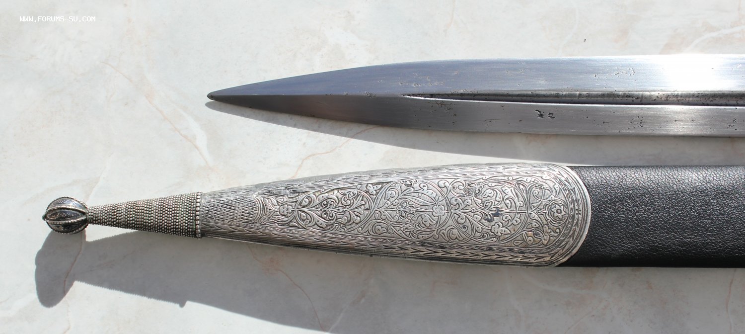 Очень большой кинжал, детали из серебра, Закавказье. Общая длина 63 см, длина клинка 41 см, ширина клинка 4,2 см.