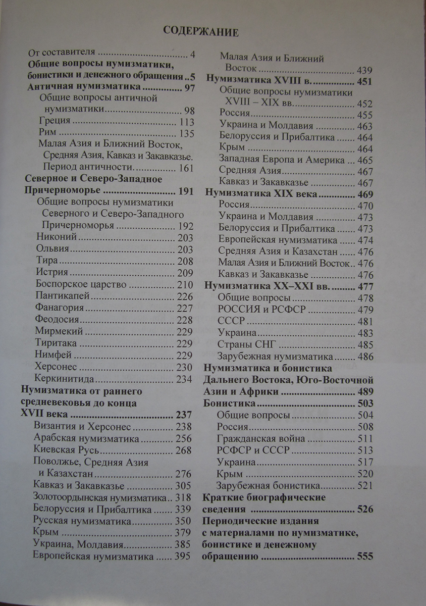 В справочнике перечислено более десяти тысяч работ и публикаций, посвященных нумизматике, бонистике и вопросам денежного обращения. Это работы отечественных и зарубежных историков, археологов, ученых-нумизматов и коллекционеров, посвятивших себя изучению и исследованию монет, бумажных денежных знаков, истории денежного обращения. Кроме того, приводятся краткие биографические сведения о 293 ученых-нумизматах, историках, коллекционерах. Перечислено около двухсот изданий, постоянно публикующих материалы по нумизматике и бонистике.