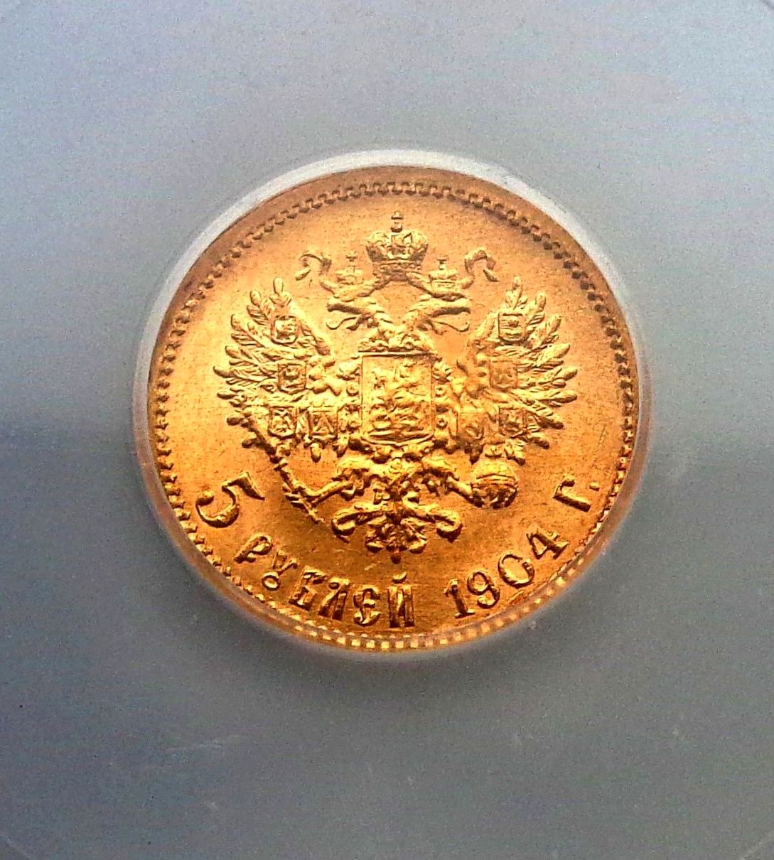 В продаже 5 рублей 1904 - UNC Штемпельный блеск. Слаб ICQ - MS 65