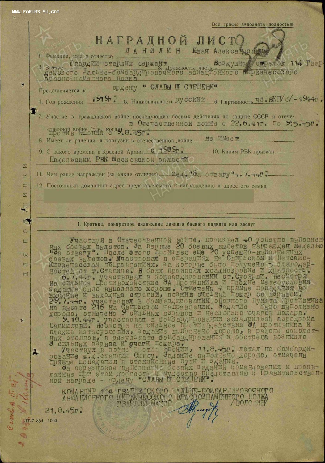 Кавалер получил Славу 3 степени после Парада Победы за Японию.