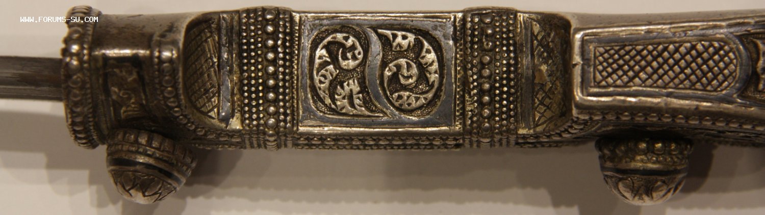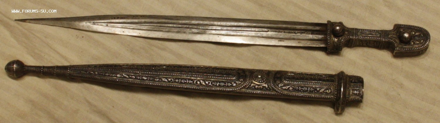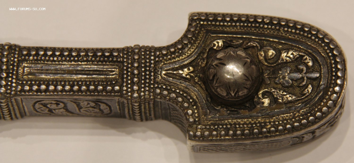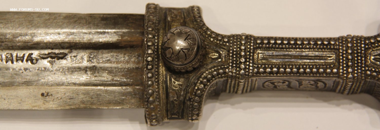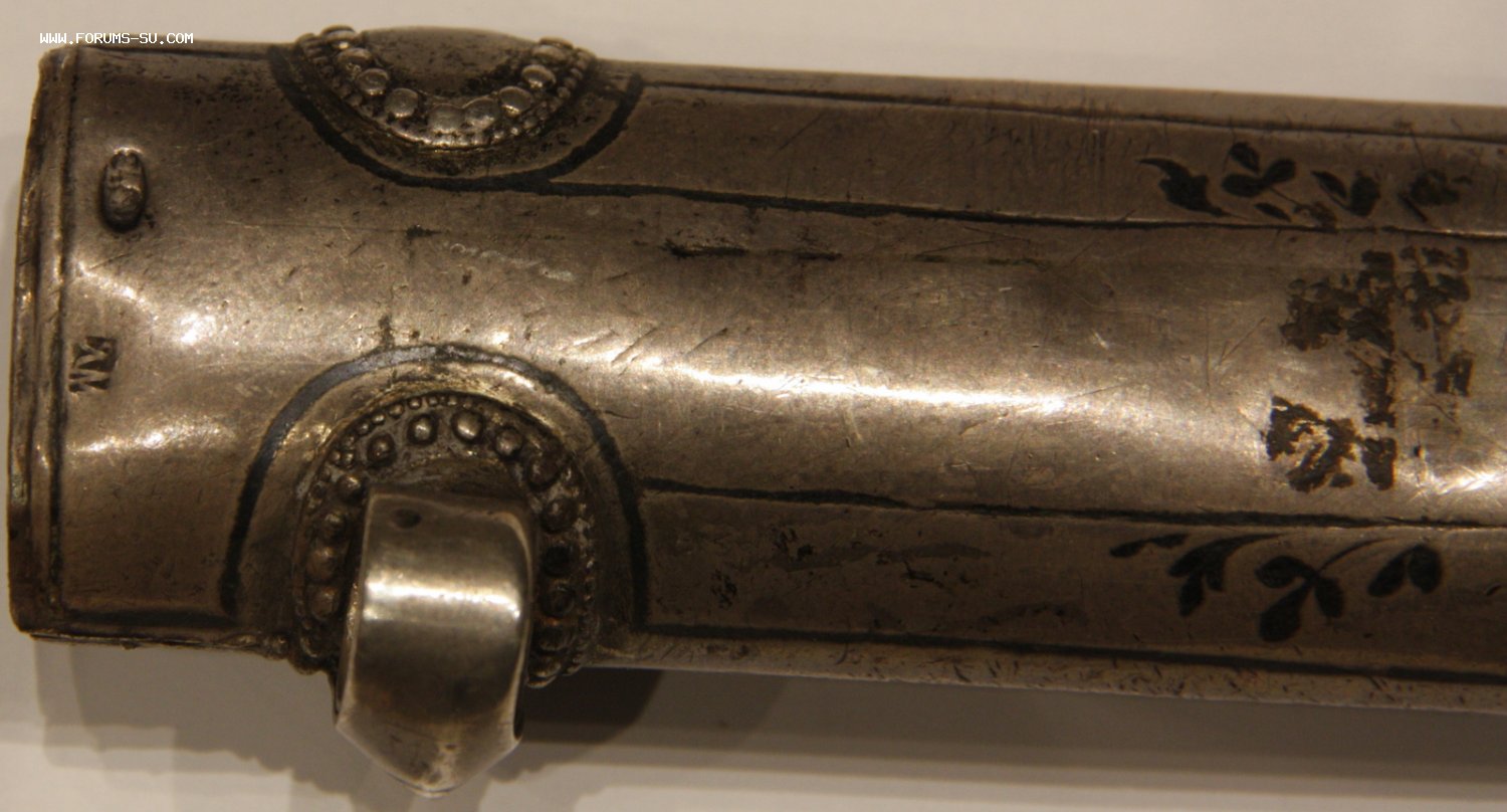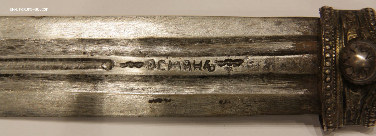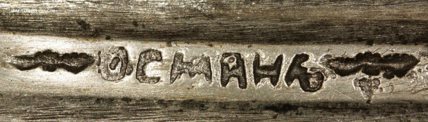 Материал, техника - сталь, ковка, дерево, серебро, чернение, гравировка. У основания клинка клеймо "ОСМАНЪ". В верхней части ножен проба серебра "84" и клеймо "ЯМ".