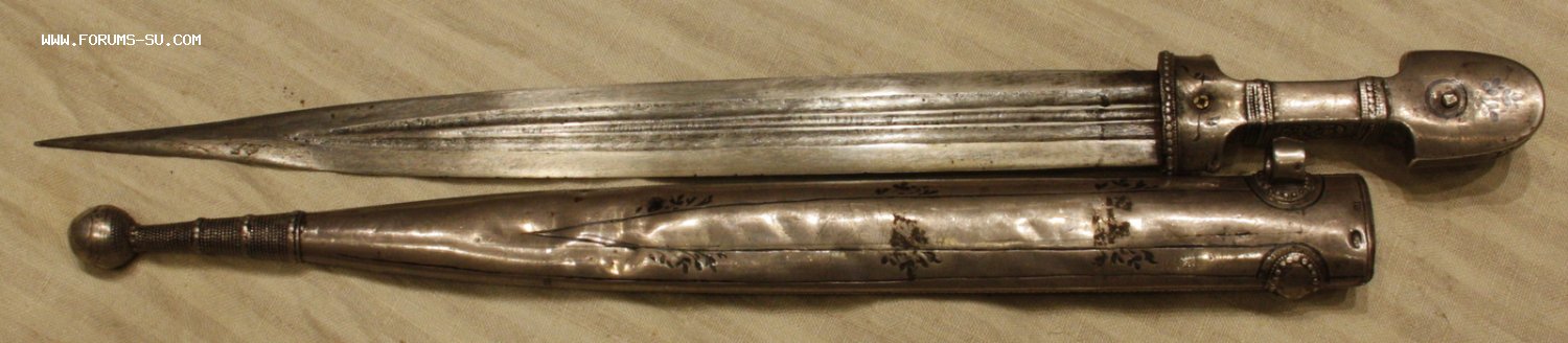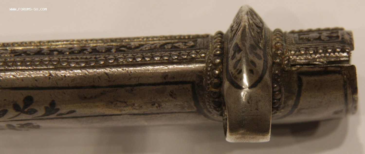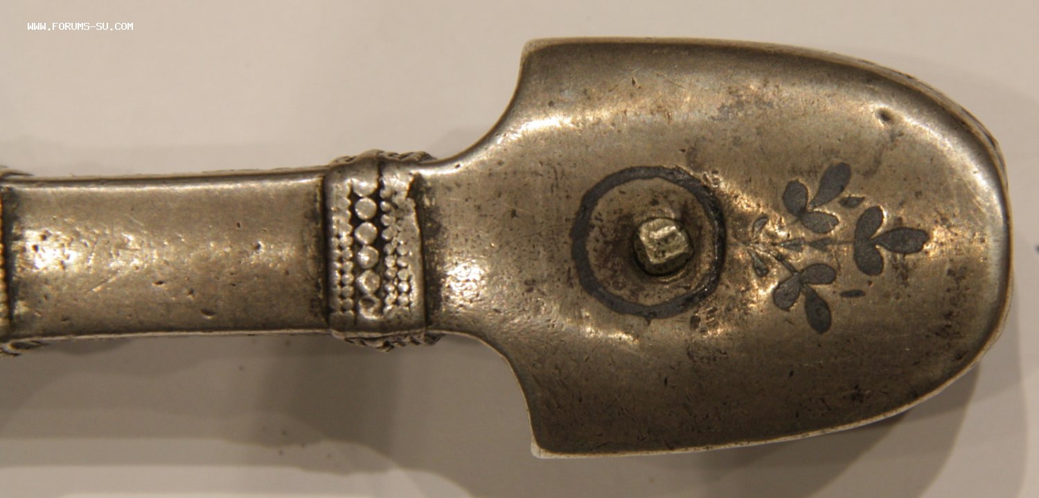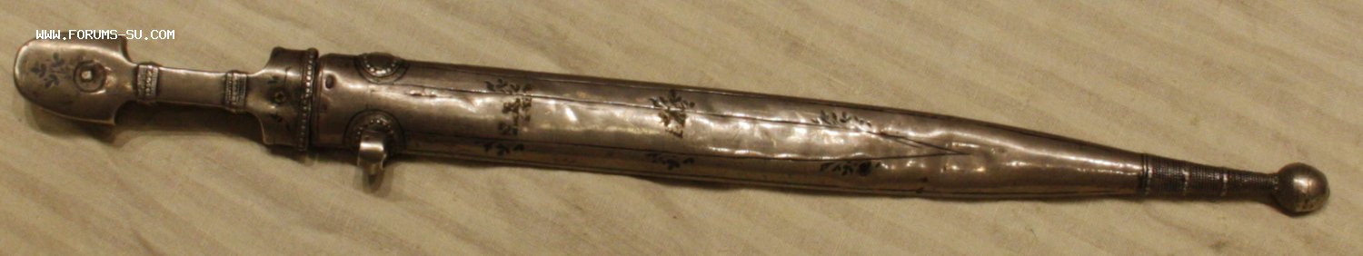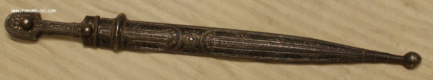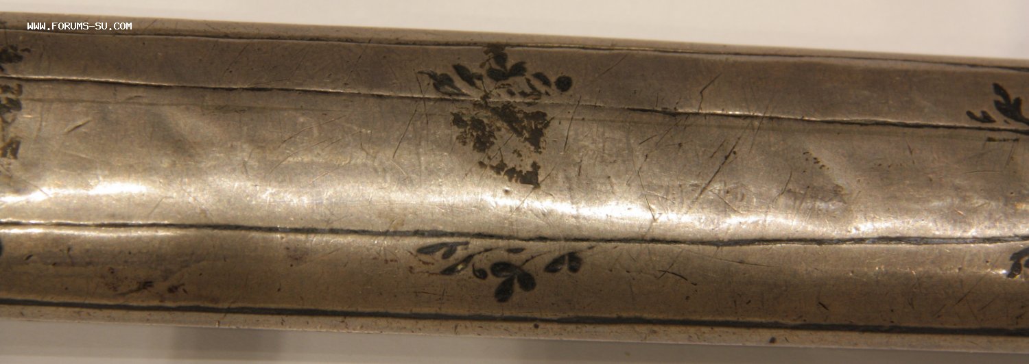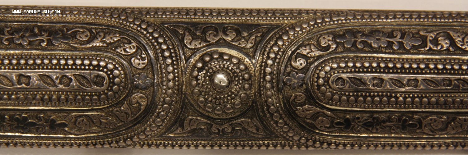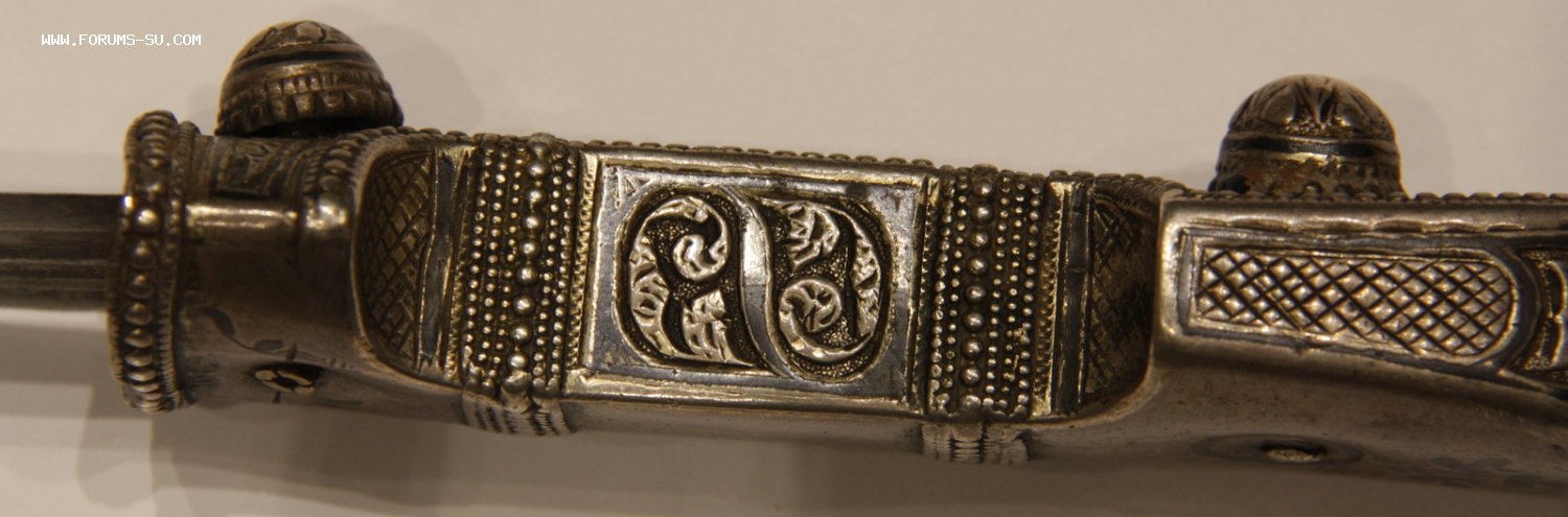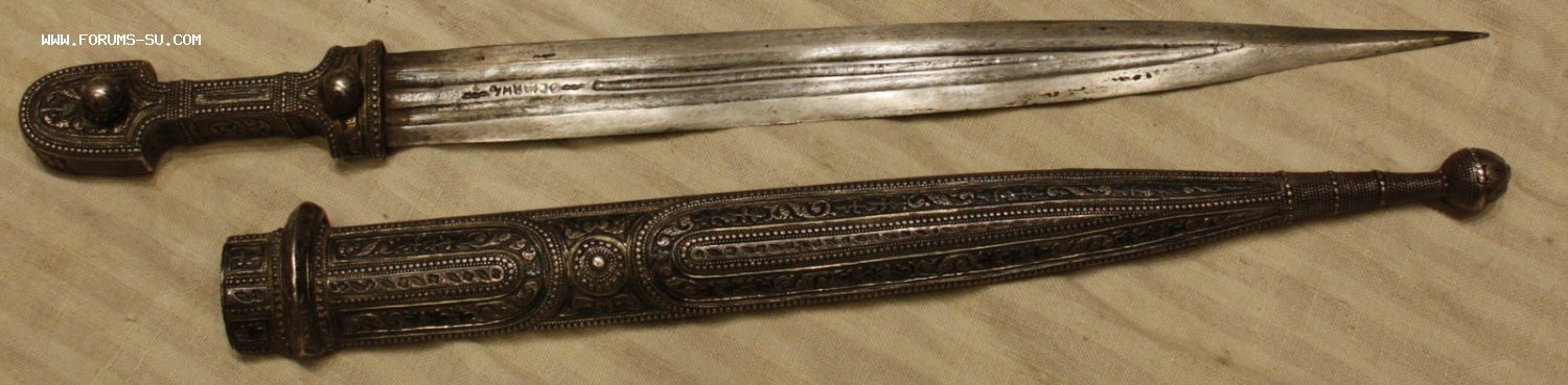 Материал, техника - сталь, ковка, дерево, серебро, чернение, гравировка. У основания клинка клеймо "ОСМАНЪ". В верхней части ножен проба серебра "84" и клеймо "ЯМ".