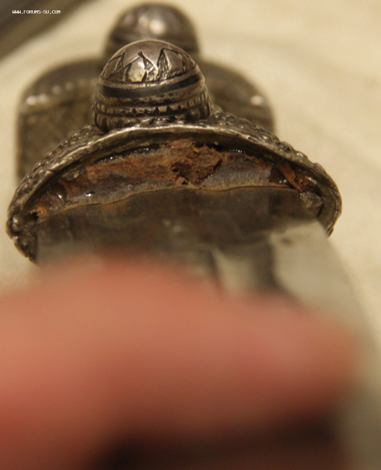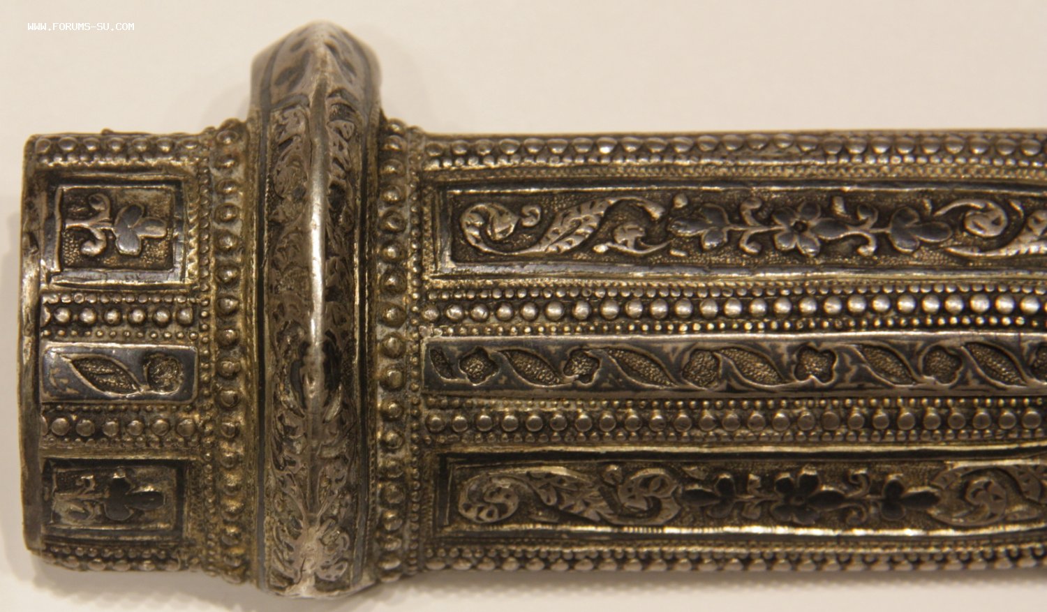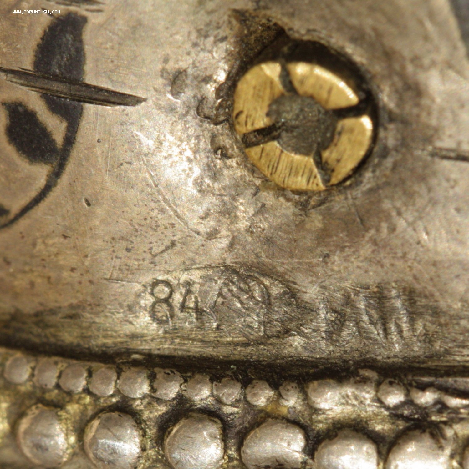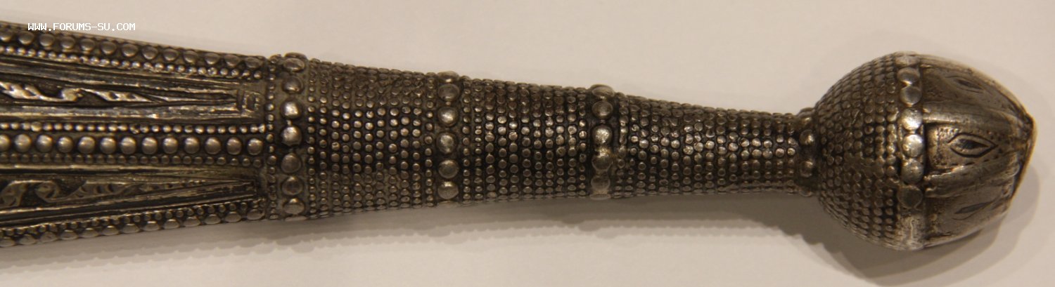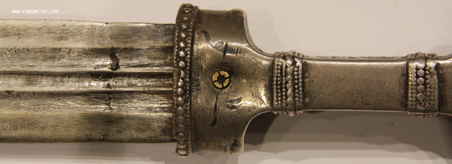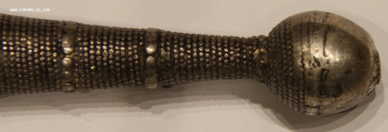 Материал, техника - сталь, ковка, дерево, серебро, чернение, гравировка. У основания клинка клеймо "ОСМАНЪ". В верхней части ножен проба серебра "84" и клеймо "ЯМ".