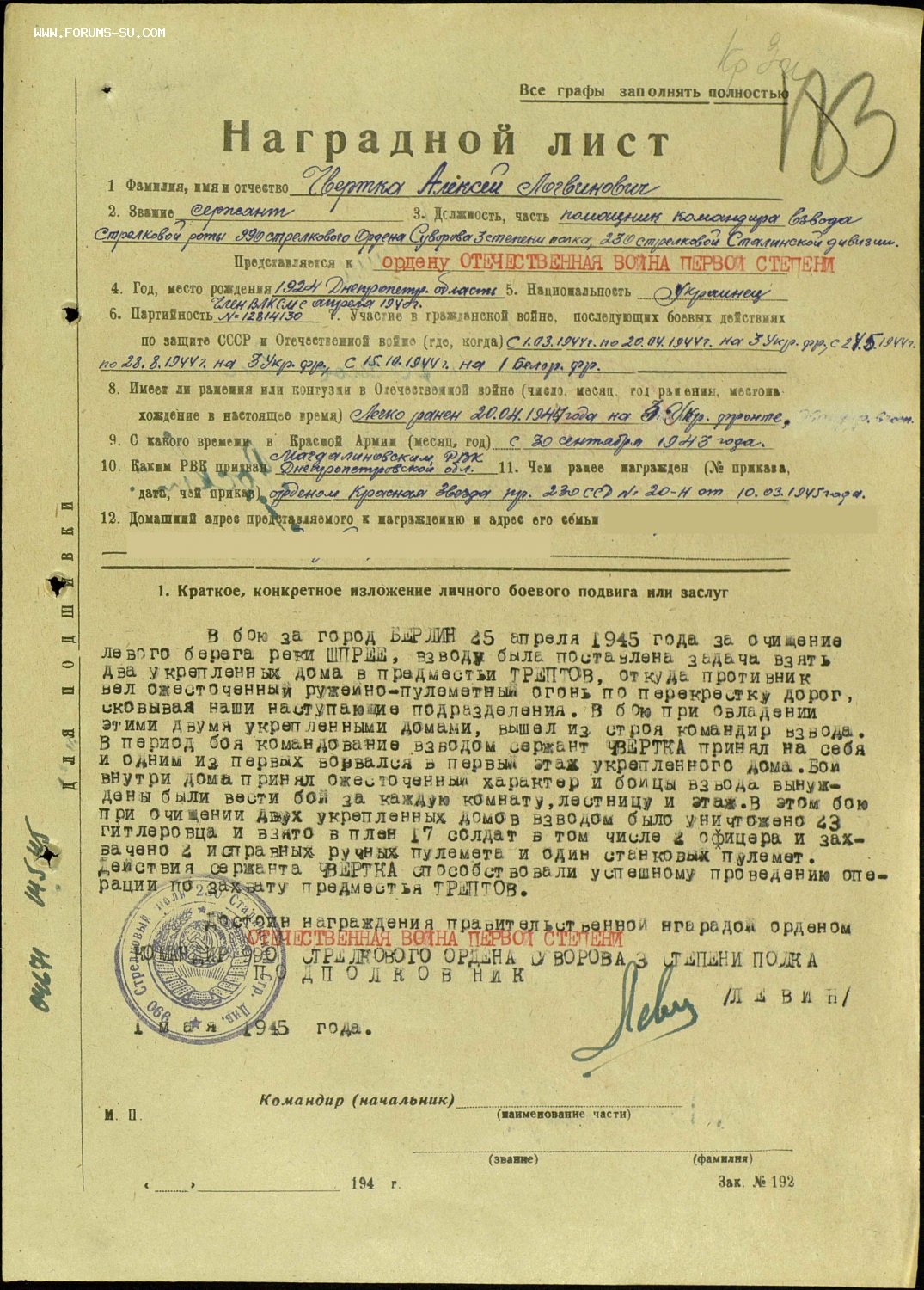 В целом, бои за Берлин в памяти сливаются в один непрекращающийся ни днем, ни ночью бой: в домах, подвалах, на этажах. Запомнился бой за большую городскую электростанцию Клингенберг, в пригороде Руммельсбург. Во взятии электростанции участвовали все части дивизии. Командир дивизии Герой Советского Союза полковник Шишков Даниил Кузьмич получил от командарма приказ не допустить взрыва электростанции гитлеровцами, уже подготовленной к взрыву. Решением командира дивизии мощным огнем был блокирован эсэсовский гарнизон электростанции, а группа разведчиков и саперов, при содействии рабочих, проникла в машинный зал, им были показаны места закладки взрывчатки и провода. Электростанция была спасена, и сыграла большую роль в послевоенной жизни города. За проявленный героизм и отвагу при выполнении боевого задания командования при спасении электростанции Клингенберг командиру 990-го стрелкового полка подполковнику Левину Александру Ивановичу, командиру 988-го стрелкового полка подполковнику Ожогину Андрею Матвеевичу, заместителю командира дивизии полковнику Галкину Федору Ульяновичу и командиру 2-го батальона 990-го стрелкового полка майору Нестеренко Павлу Антоновичу были присвоены звания Герой Советского Союза. С овладением электростанцией полк сразу же приступил к форсированию реки Шпрее. Непосредственно перед электростанцией это оказалось невозможным из-за плотного огня противника на противоположном берегу. Наш 2-й стрелковый батальон совершил бросок на 1,5 км вверх по течению, где уже начал форсирование соседний полк, и на катерах и резиновых лодках переправились на другой берег реки, захватили плацдарм и повели наступление вдоль реки по опушке Трептов-парка, отражали контратаки. Бои не прекращались и ночью. С продвижением к центру сопротивление нарастало. Однажды ночью оказались под бомбежкой наших союзников. Благо, мы находились в это время в каком-то подвале большого здания и потерь не имели. Запомнился бой за здание имперского патентного управления. В нем находился большой гарнизон. Под прикрытием огня мы бросились в пролом в стене на помощь третьему отделению нашего взвода под командованием сержанта Шмыга Ивана Николаевича, уроженца села Чернобай Полтавской области, прочесав перед собой огнем из автоматов, бросилось вперед. Опять пошли в дело гранаты. Много гитлеровцев было уничтожено, а десятка полтора побросали оружие и сдались. Бой продолжался в течение всего дня, и к его исходу все здание было в наших руках. За этот бой сержант Шмыга И.Н. был представлен к званию Герой Советского Союза, которое ему было присвоено Указом Президиума Верховного Совета СССР ко дню Победы в мае 1946 года, а за другие отличия он был награжден вторым орденом Красной Звезды. Другой памятный бой 28-29 апреля за здание государственной типографии на Альте Якобштрассе, где печатались геббельсовская «Фелькишер беобахтер» и другие газеты и журналы гитлеровского рейха. Здание занимало полный городской квартал, и силы гитлеровцев были значительными. Надо сказать, что на оборону центра Берлина, где располагались важнейшие государственные учреждения, были стянуты остатки самых отъявленных гитлеровских головорезов из СС, гестапо и др., которым уже нечего терять, и они сражались с отчаянностью и упорством обреченных. Штурмовые отряды 230-й стрел