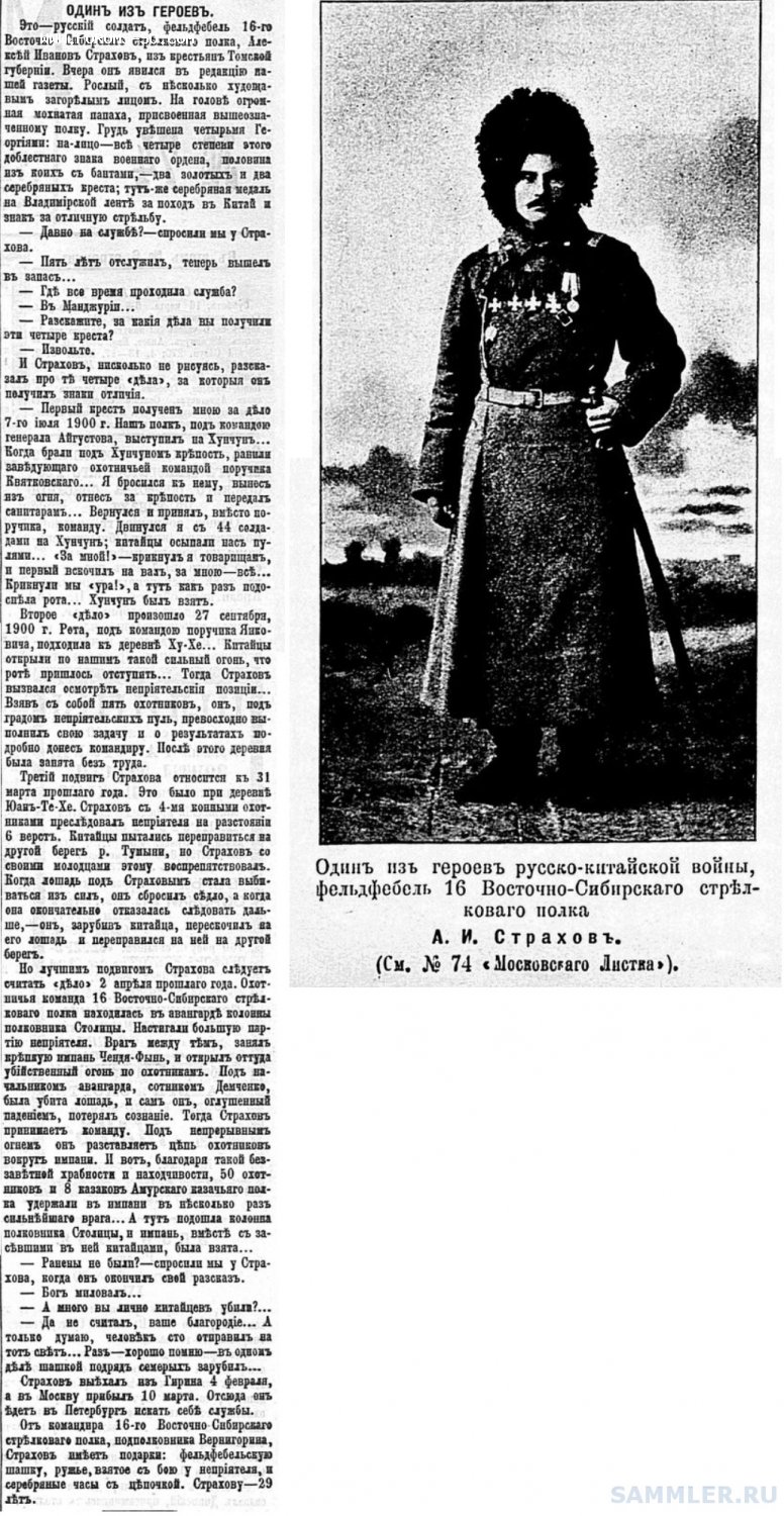 Фельдфебель этот - уроженец Томской губ., Мариинского уезда, является одним из замечательных героев последней Китайской кампании, в течении которой он получил все четыре степени ЗОВО.