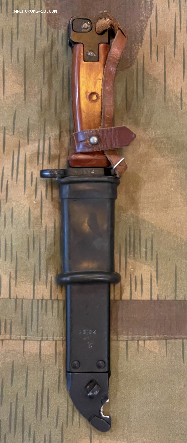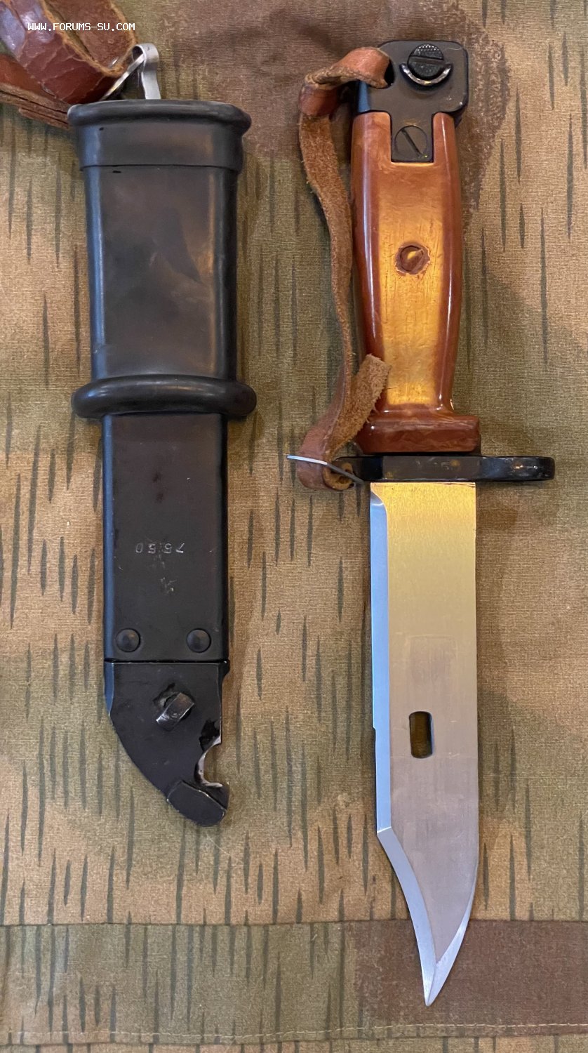 От советского образца штык отличается прежде всего отсутствием пилы на обухе клинка. Поставляется с ножнами от 6х3.