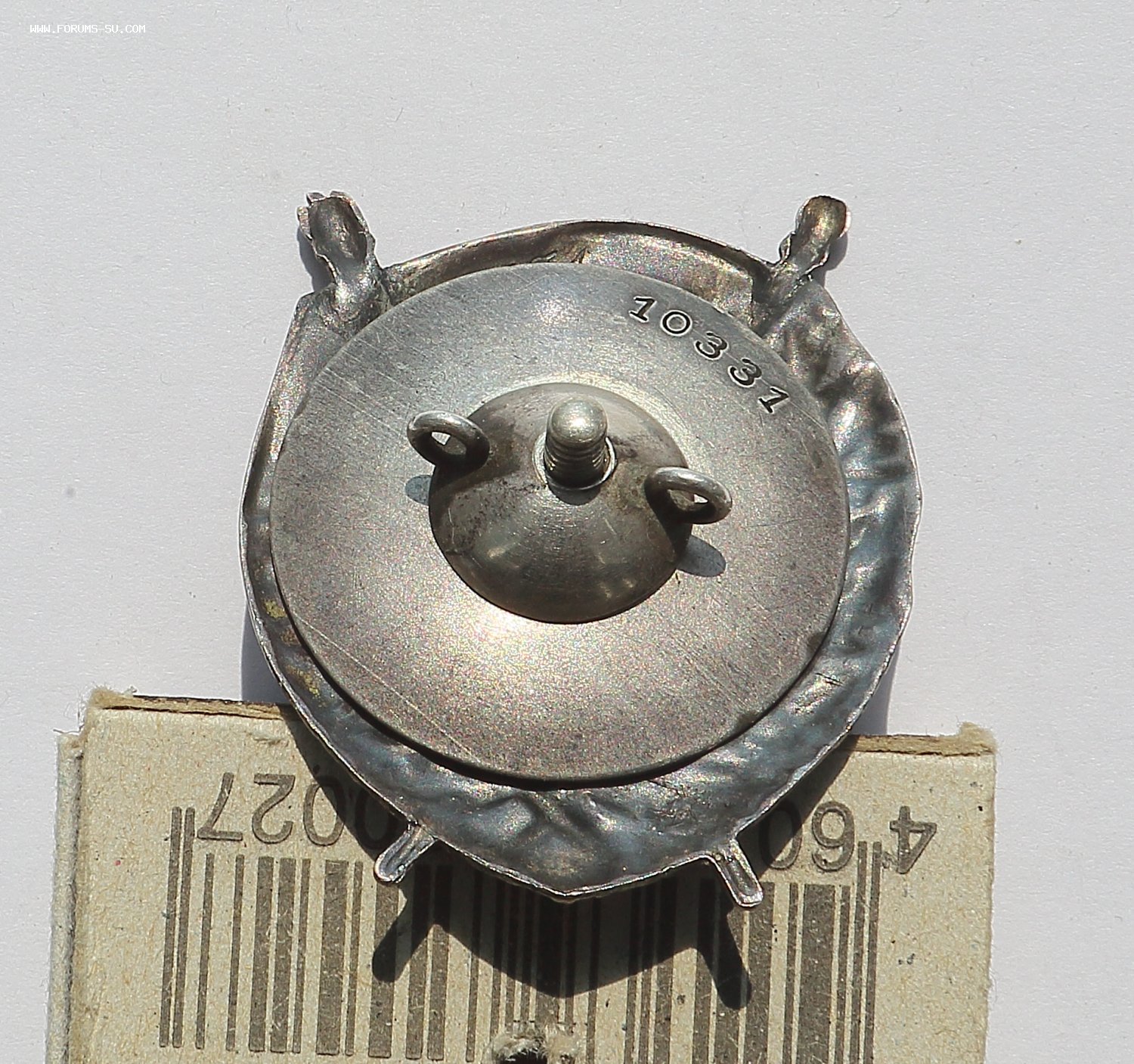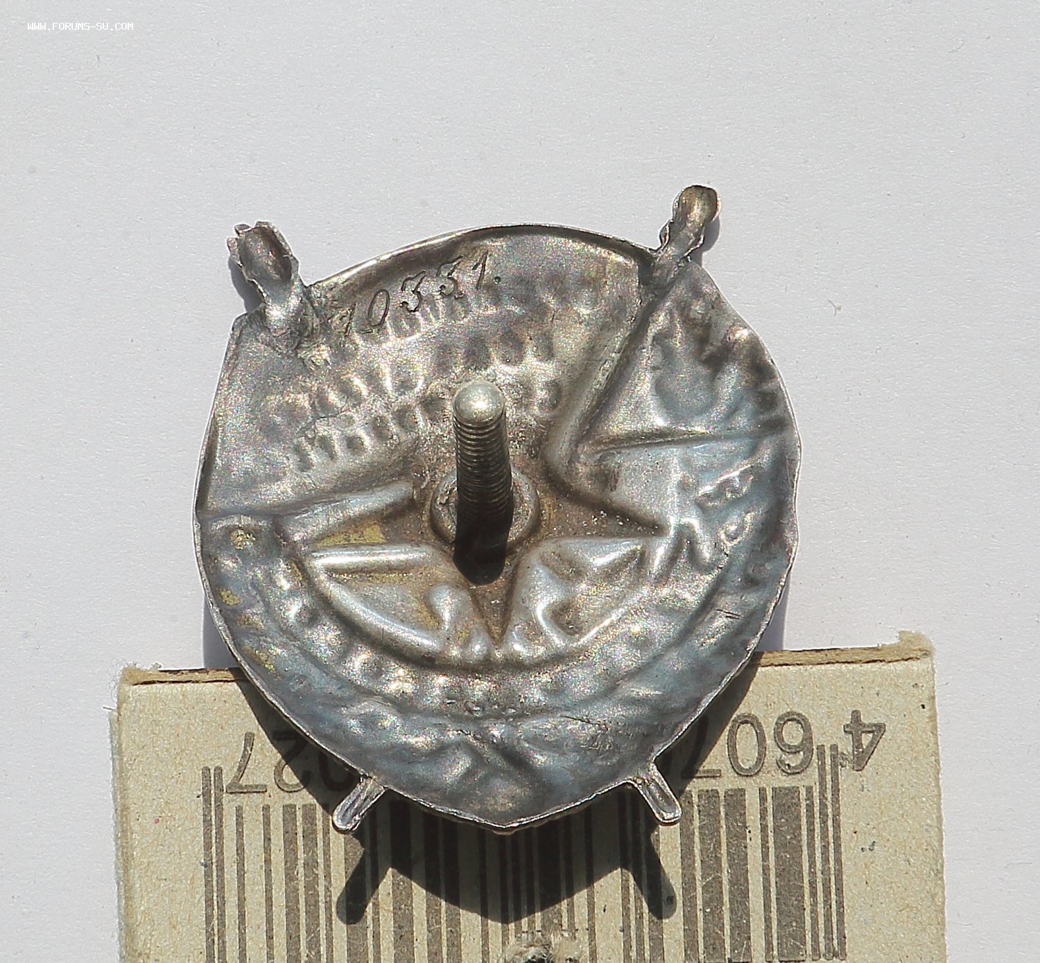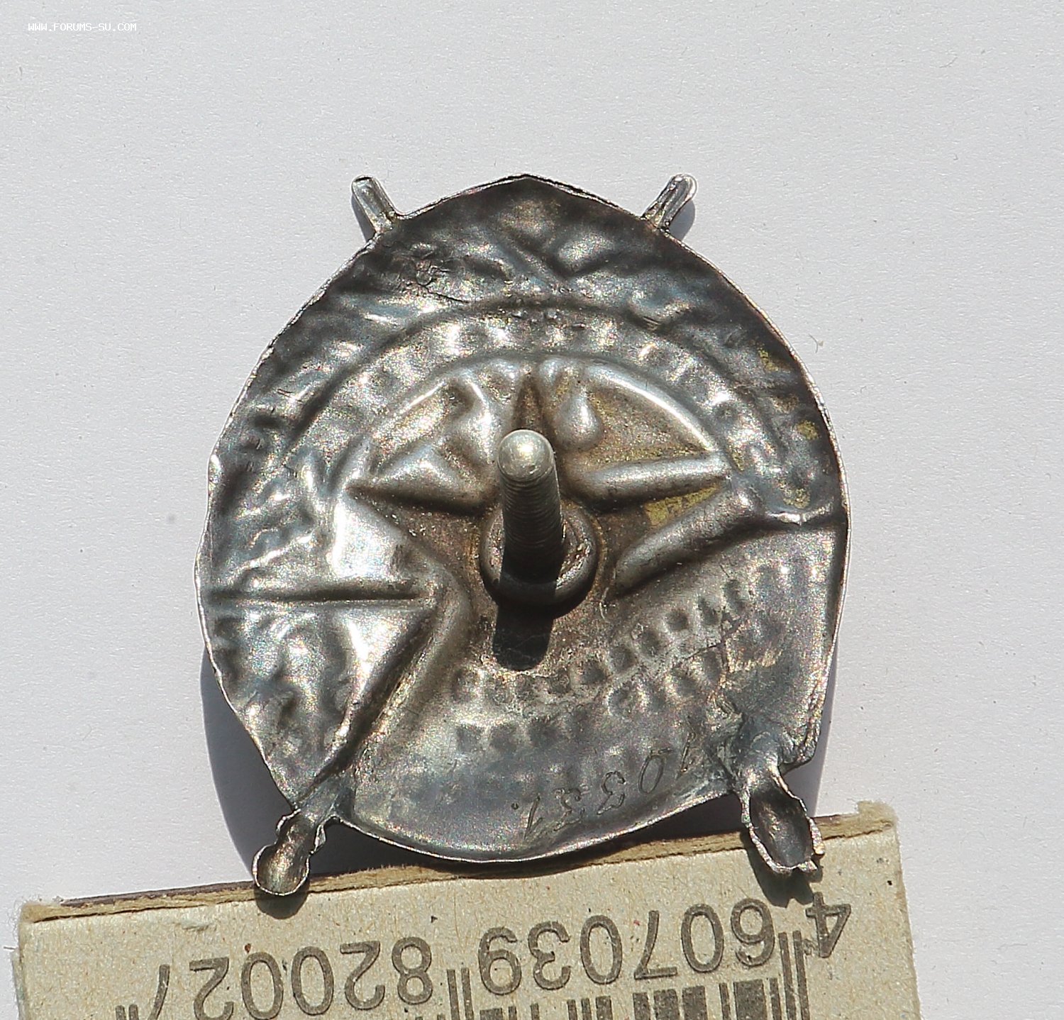 Добрый день уважаемые форумчане. Аверс хорошо виден на фото: верхняя часть знамени подмазка, сколы эмали. Реверс: рога либо укрепляли, либо подпаивали, следы припоя, левое копыто- трещина, у винта трещинка, брак при штамповке. Гайка люфтит, резьба на винте несколько сработана.