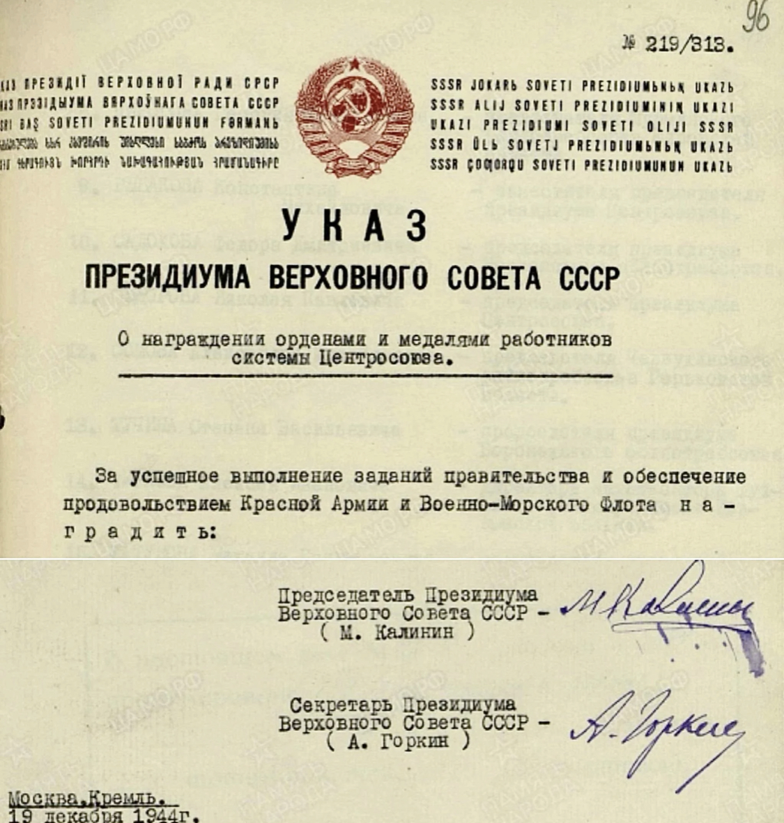 Награждение 1944 г, за выполнение заданий по обеспечению Красной Армии и ВМФ