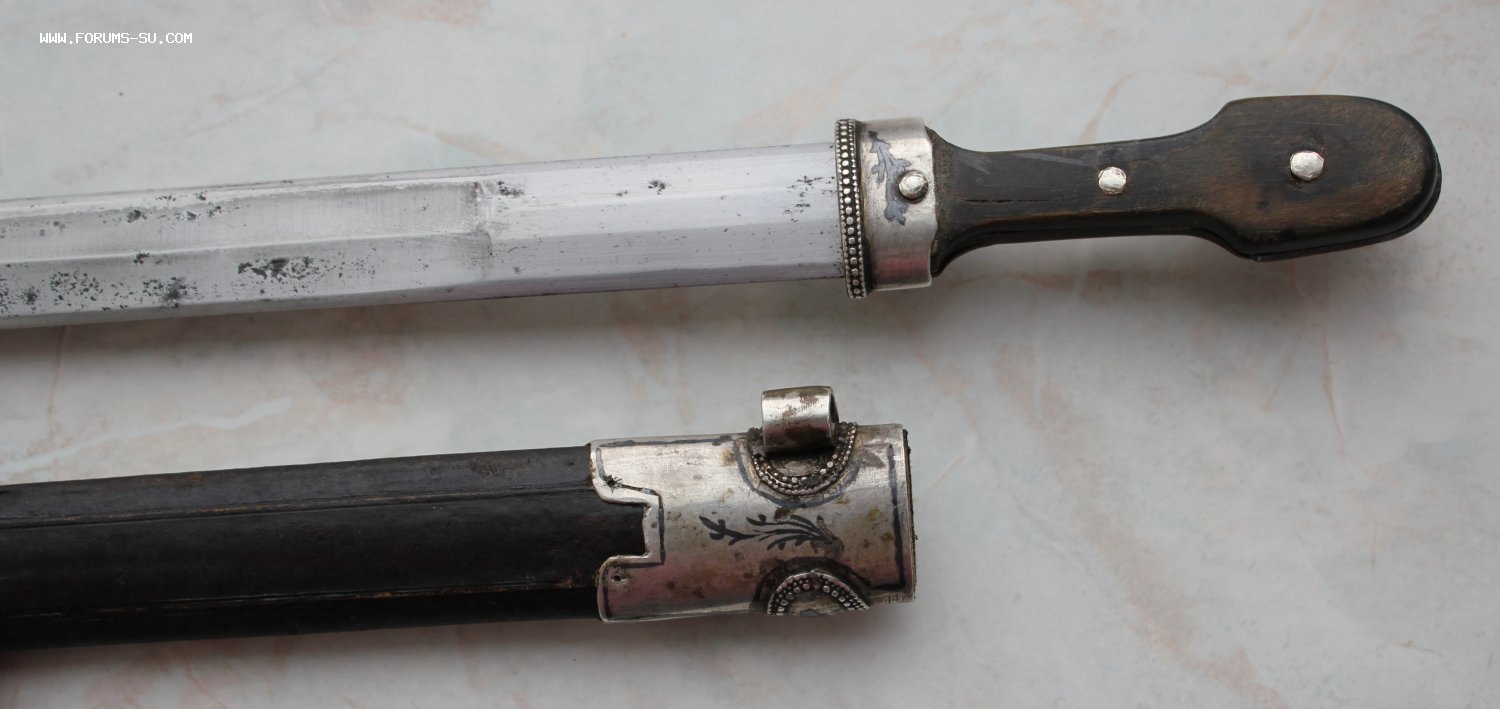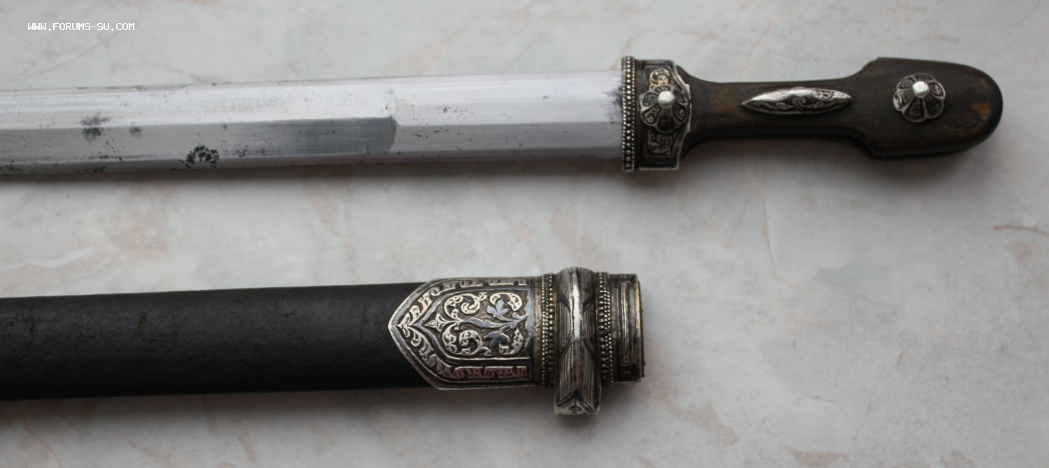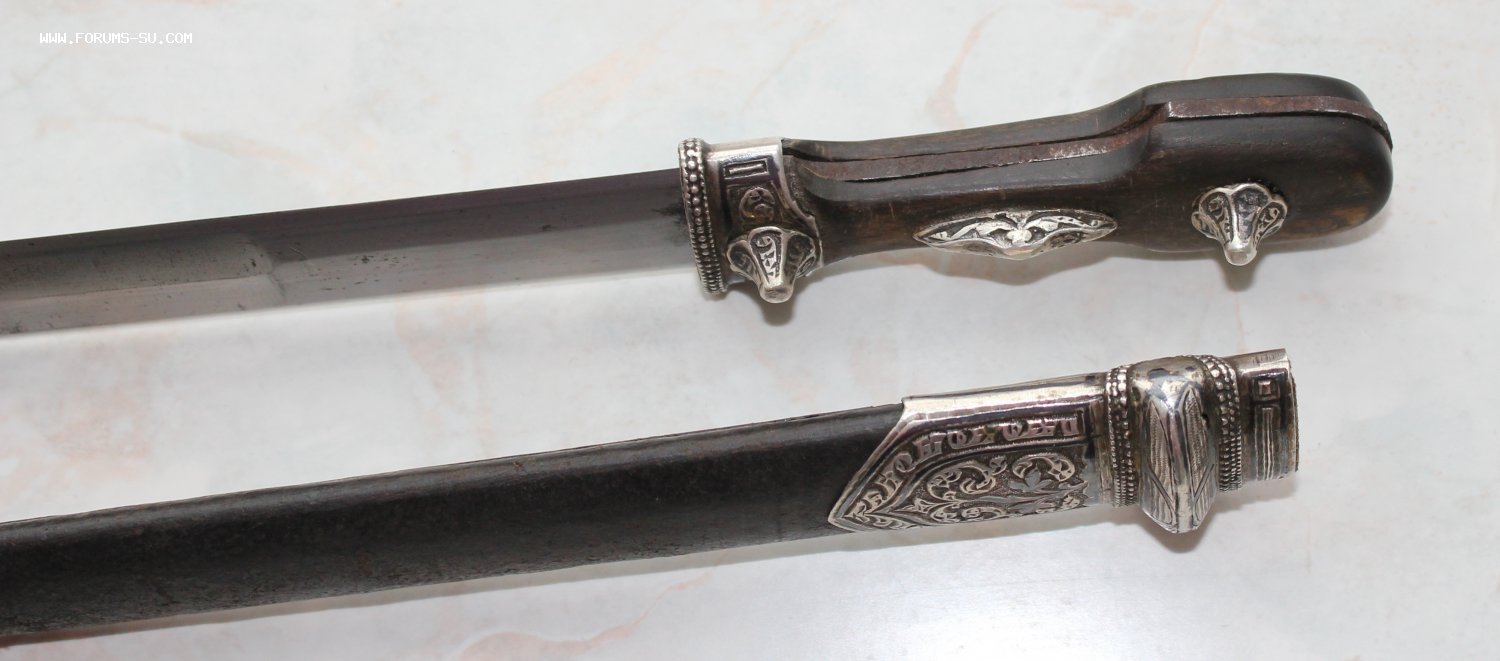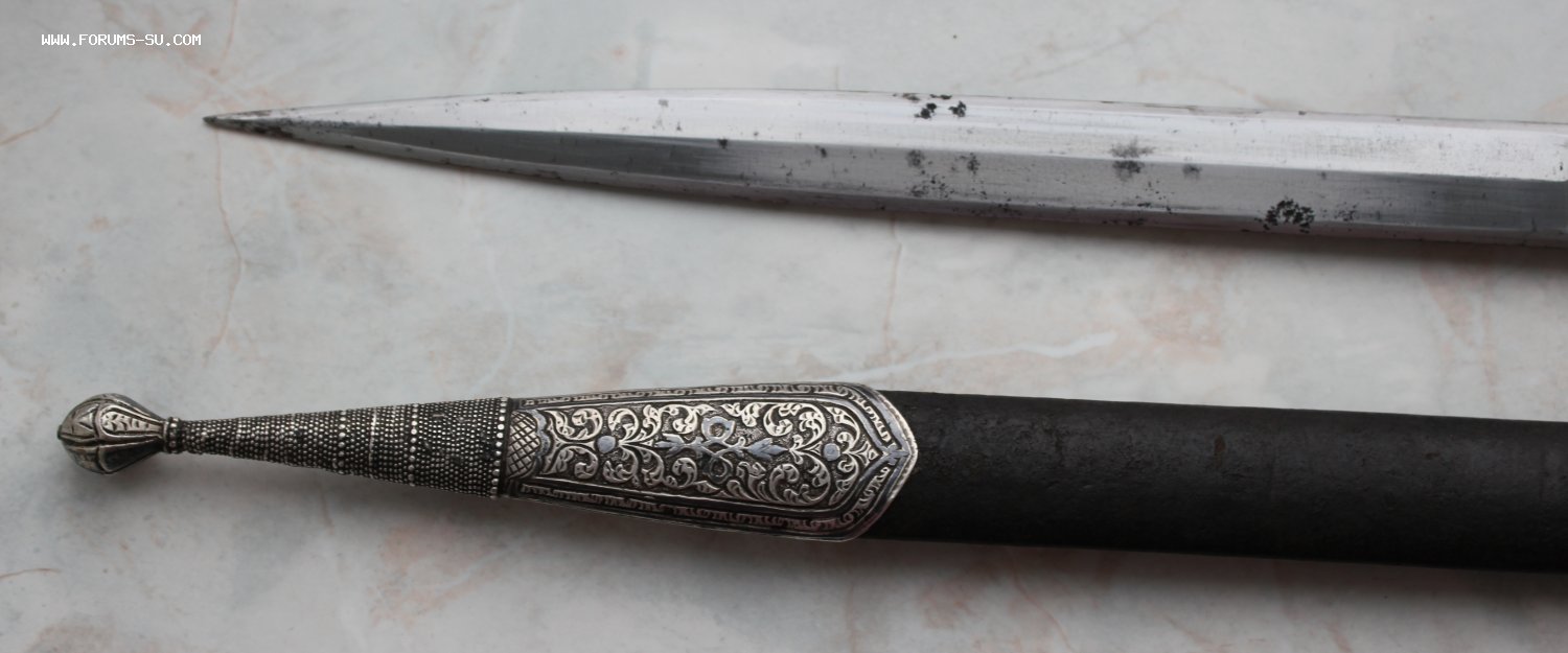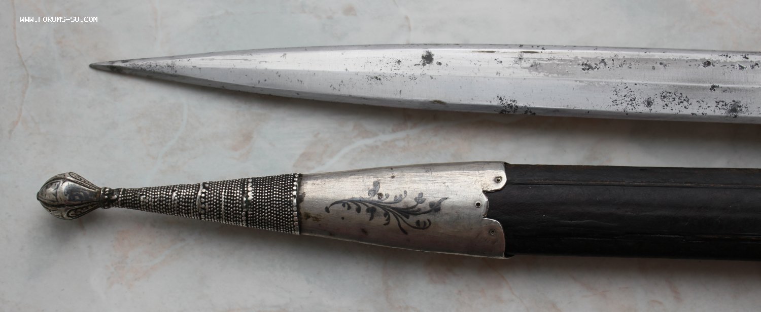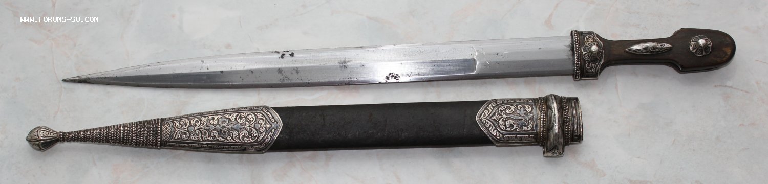 Описание: Кавказский кинжал в родном сборе. Ромбовидный красивый клинок. Специальная вытянутая форма клина была создана для способности поражать кольчуги. Длина кинжала - 45 см. Длина и ширина клина - 33 и 2,5 см.