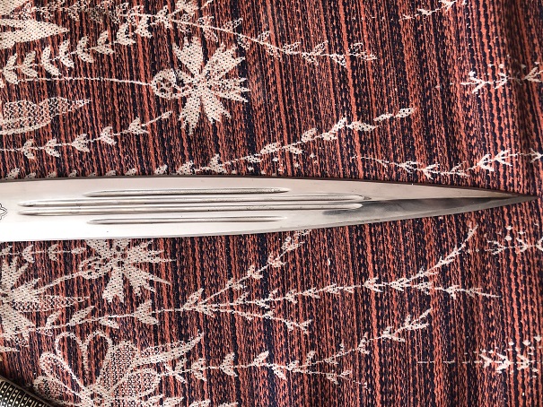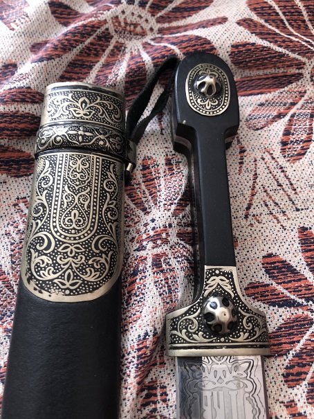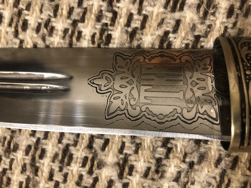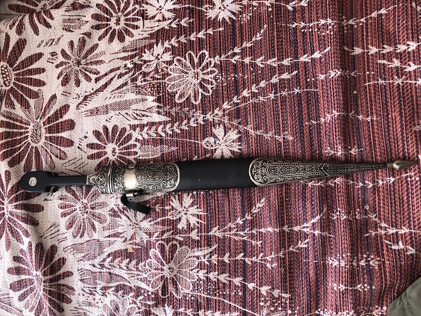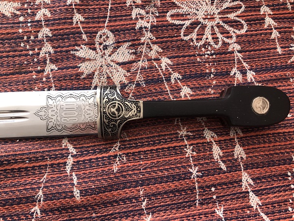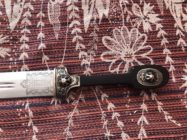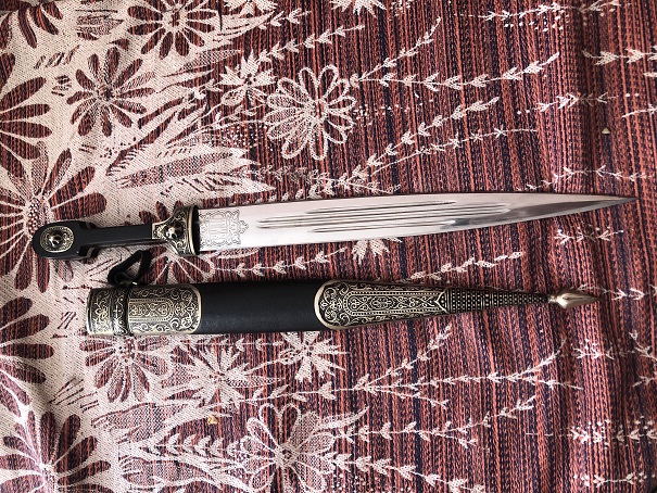 Длинна без ножен 48см, ширина у рукояти 3.9см, длинна с ножнами 54.5 толщина рукояти в центре 2.5см. Острый, и заточен неплохо, забоин на лезвии нету.