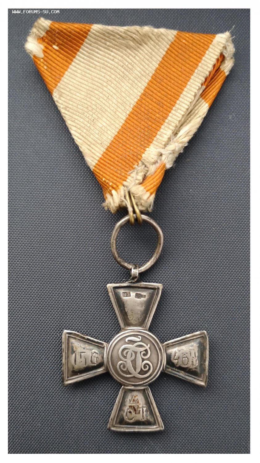В таком сборе крест попал ко мне. Это и объясняет дефект ушка. Кто-то носил или экспонировал на австрийском типе ленты. Ленту выкинул.
