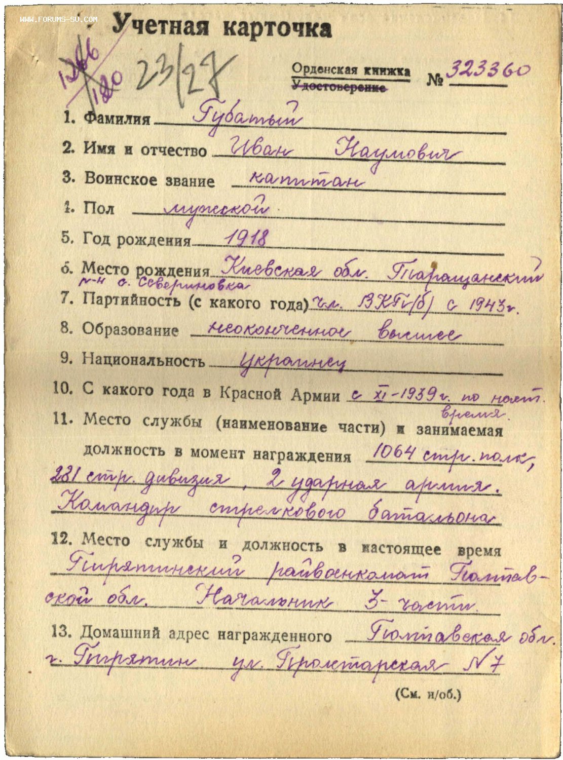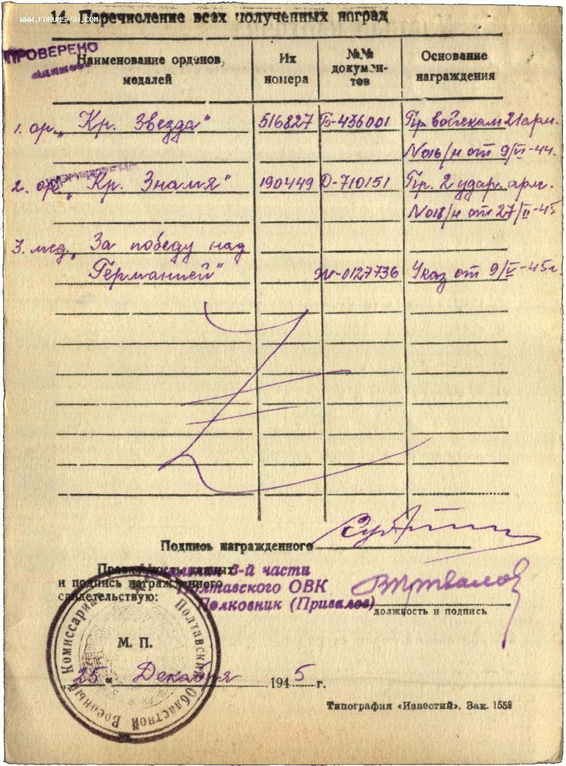 Красного Знамени, Суворова, Кутузова, Богдана Хмельницкого, Александра Невского, Ушакова, Нахимова, Отечественной Войны, Красной Звезды, Славы, За Службу Родине в ВС СССР