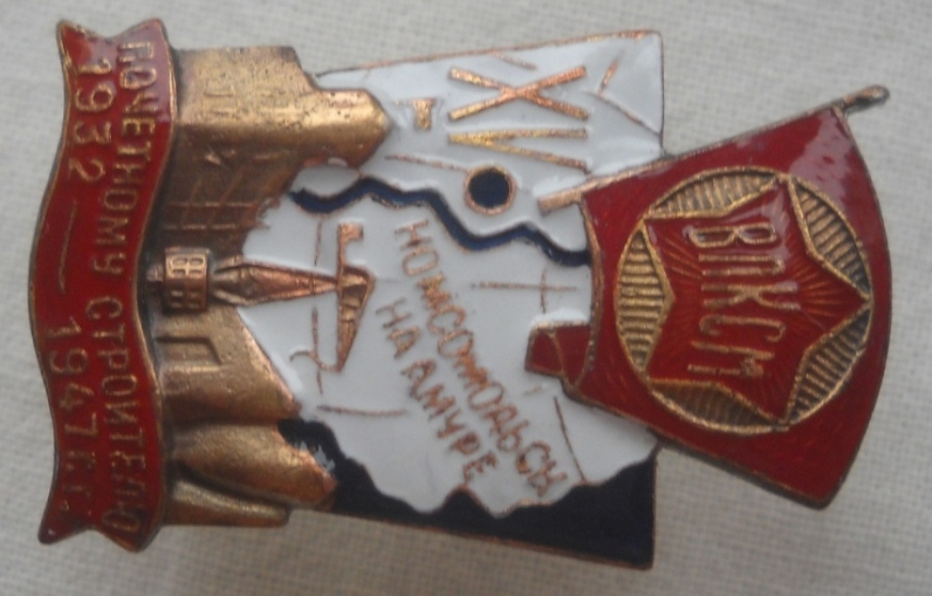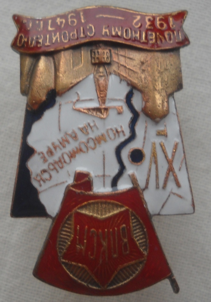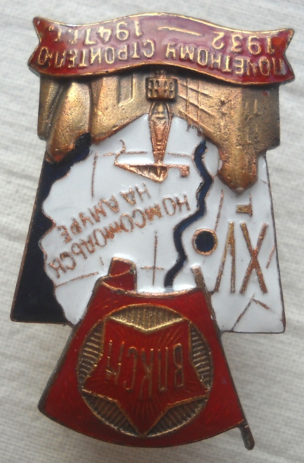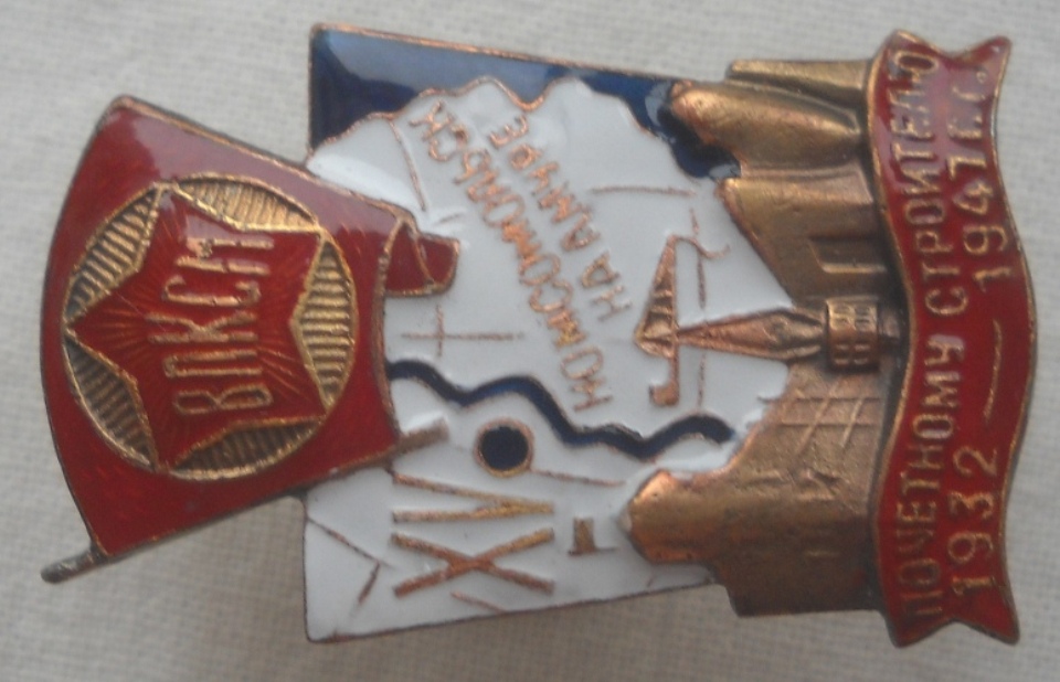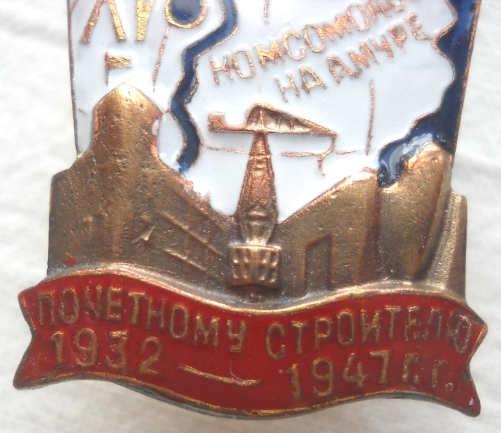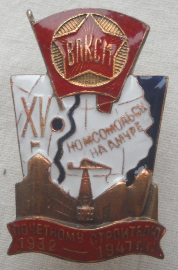 ЗНАК ВЛКСМ ПОЧЕТНОМУ СТРОИТЕЛЮ КОМСОМОЛЬСКА НА АМУРЕ. 1932 - 1947 ГОД. XV Знак подлинный, но реставрирована красная эмаль.