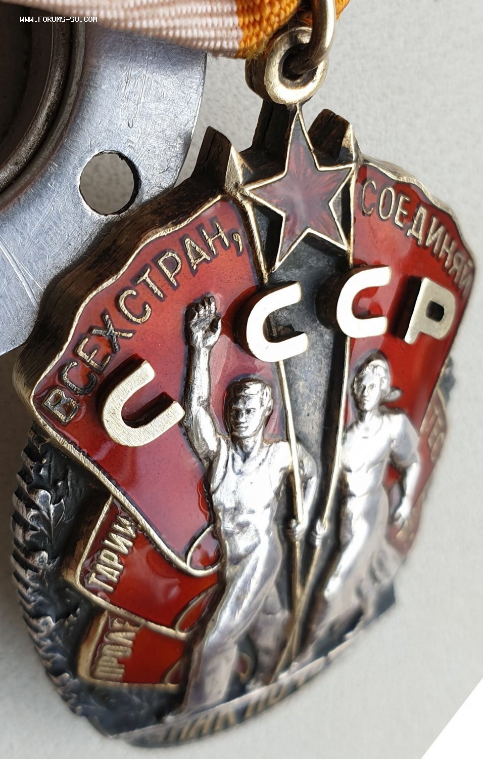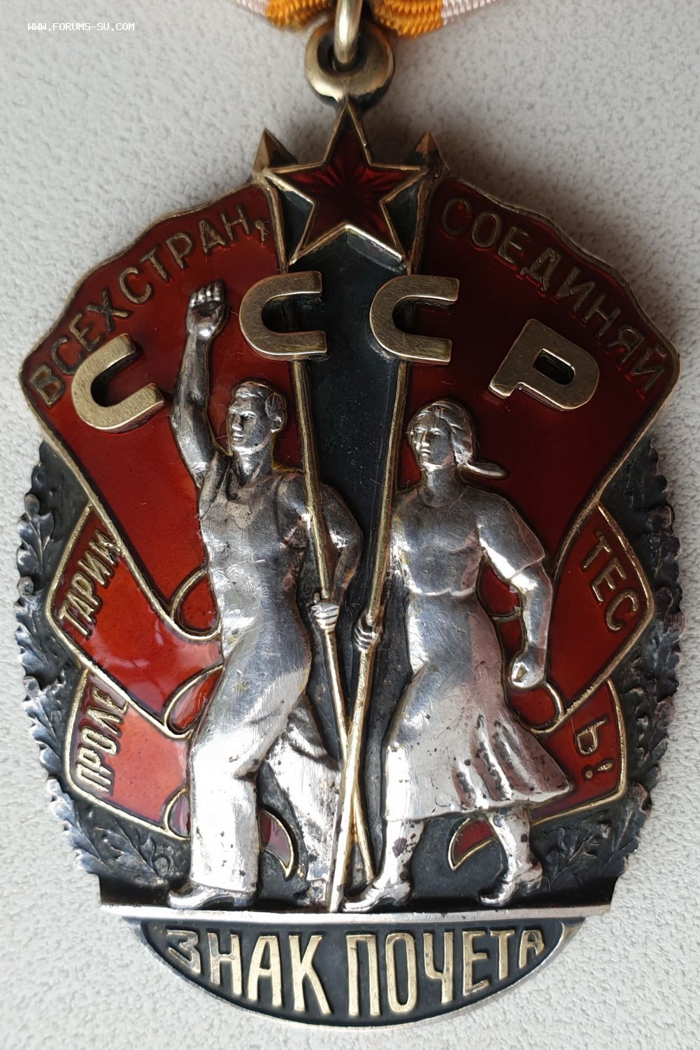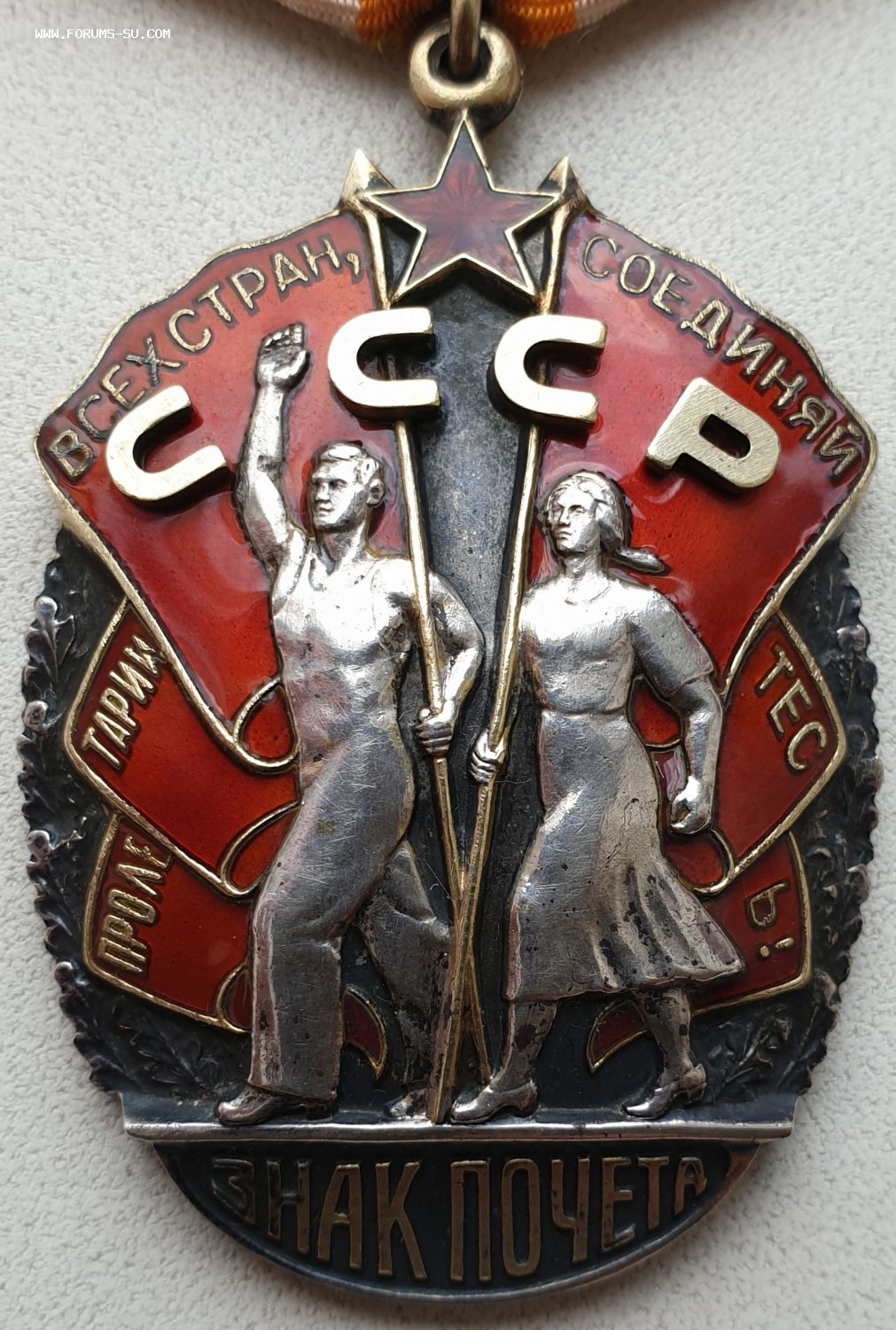 Тип 3 , вариант 5 , Разновидность 2. Голова рабочего несколько уменьшилась, лицо “повзрослело”, вырез комбинезона приобрел округлую форму. Пальцы поднятой вверх руки полусогнуты, колхозница охватывает древко знамени изнутри. Данные особенности фигур рабочего и колхозницы характерны и для следующего типа ордена. Минимальный известный номер – 160094, максимальный – 169458. http://mondvor.narod.ru/OZnPoch3.htm
