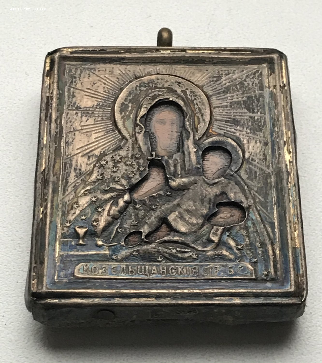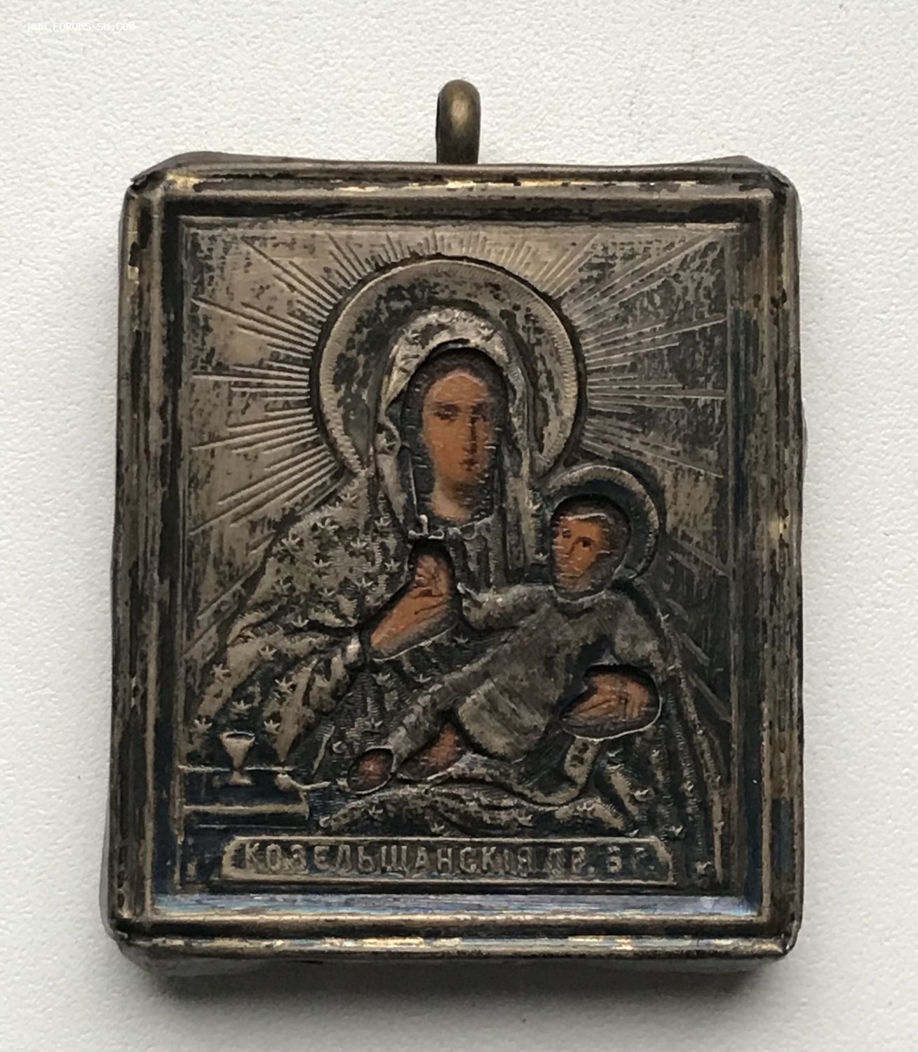 Икона Козельщанская Богородица в окладе. Серебряный оклад 84 пробы. Размер 4 х 4,5 см.
