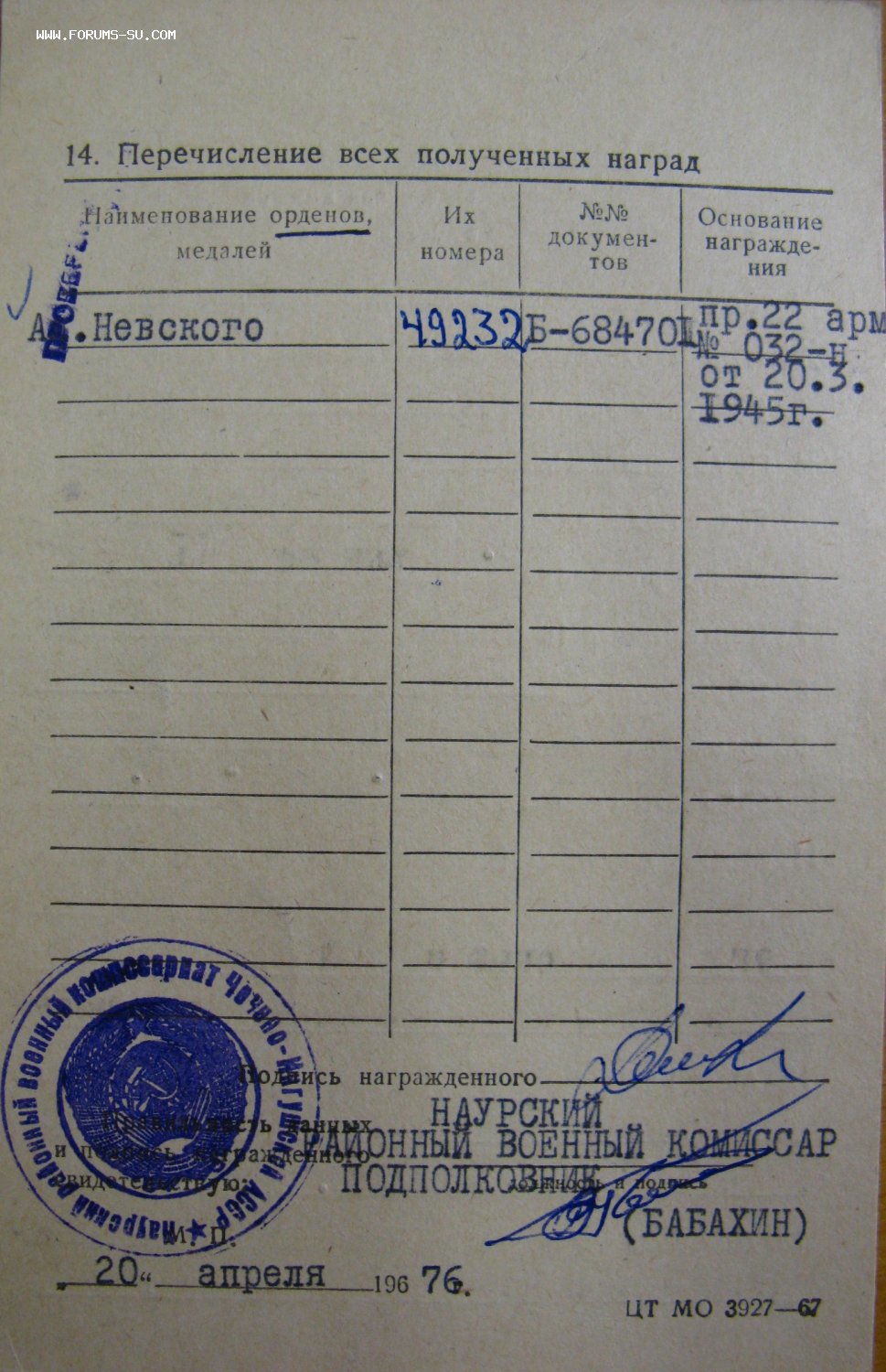 Кавалер орден Александра Невсконо получил спустя 30 лет после войны.