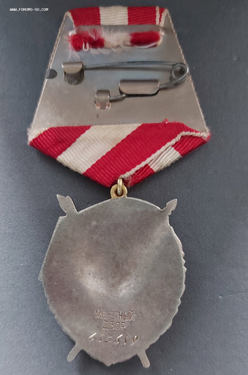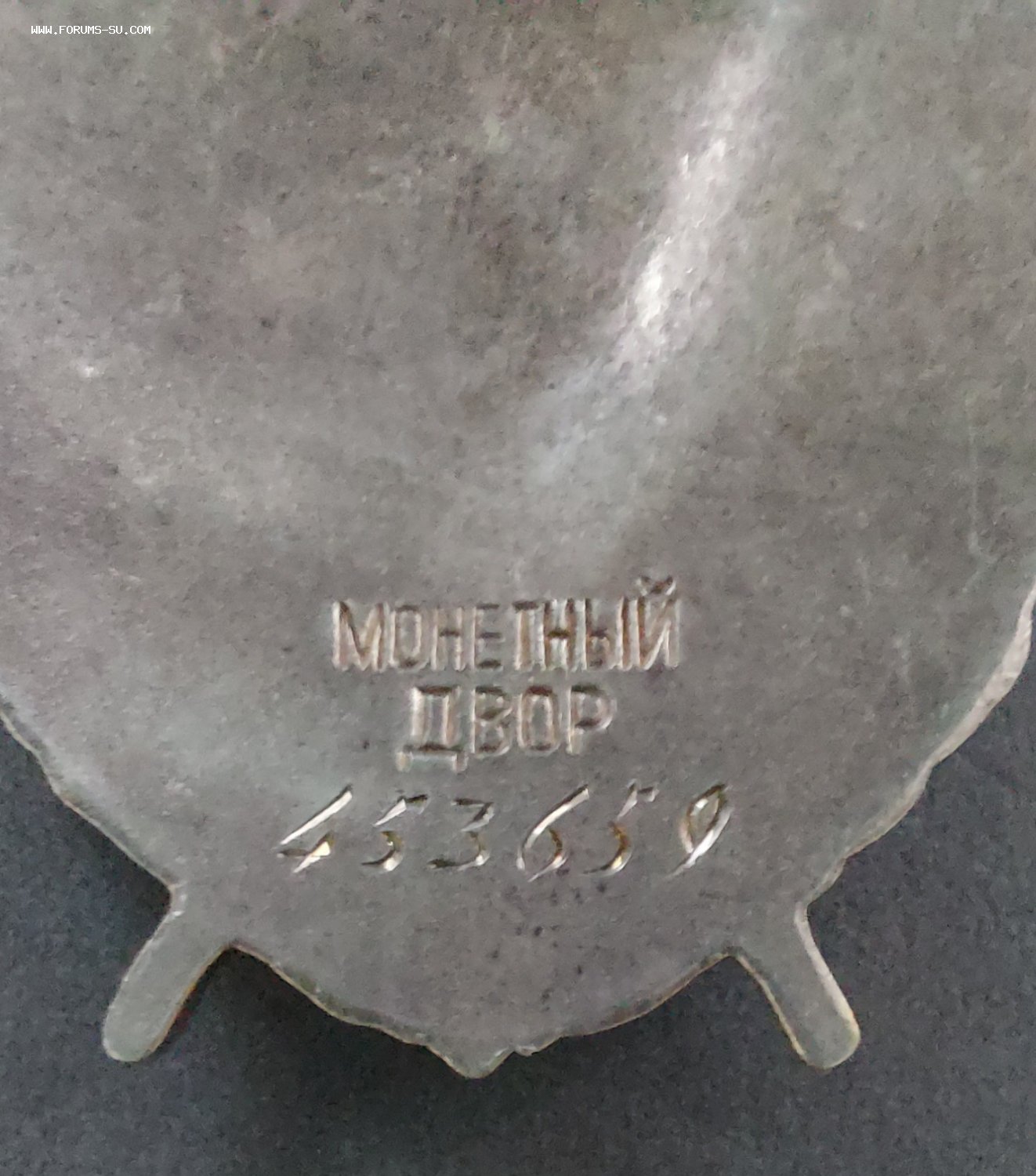 Вариант 6. Шестой вариант производился на ММД в начале 1951 года. Поверхность реверса гладкая, в центре реверса находится округлое пальцевидное вдавление. Буквы клейма низкие, высота обеих строк клейма около 3 мм. Высота букв в слове ДВОР больше, чем в слове МОНЕТНЫЙ. Минимальный известный номер ордена - 351378, максимальный - 359059.