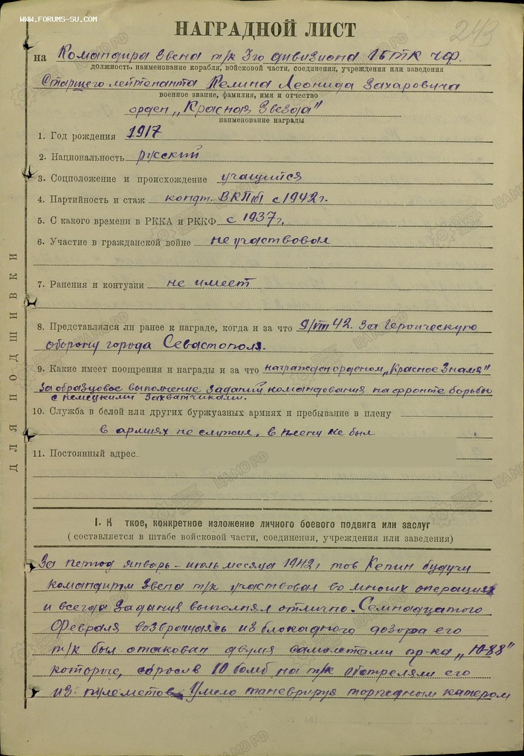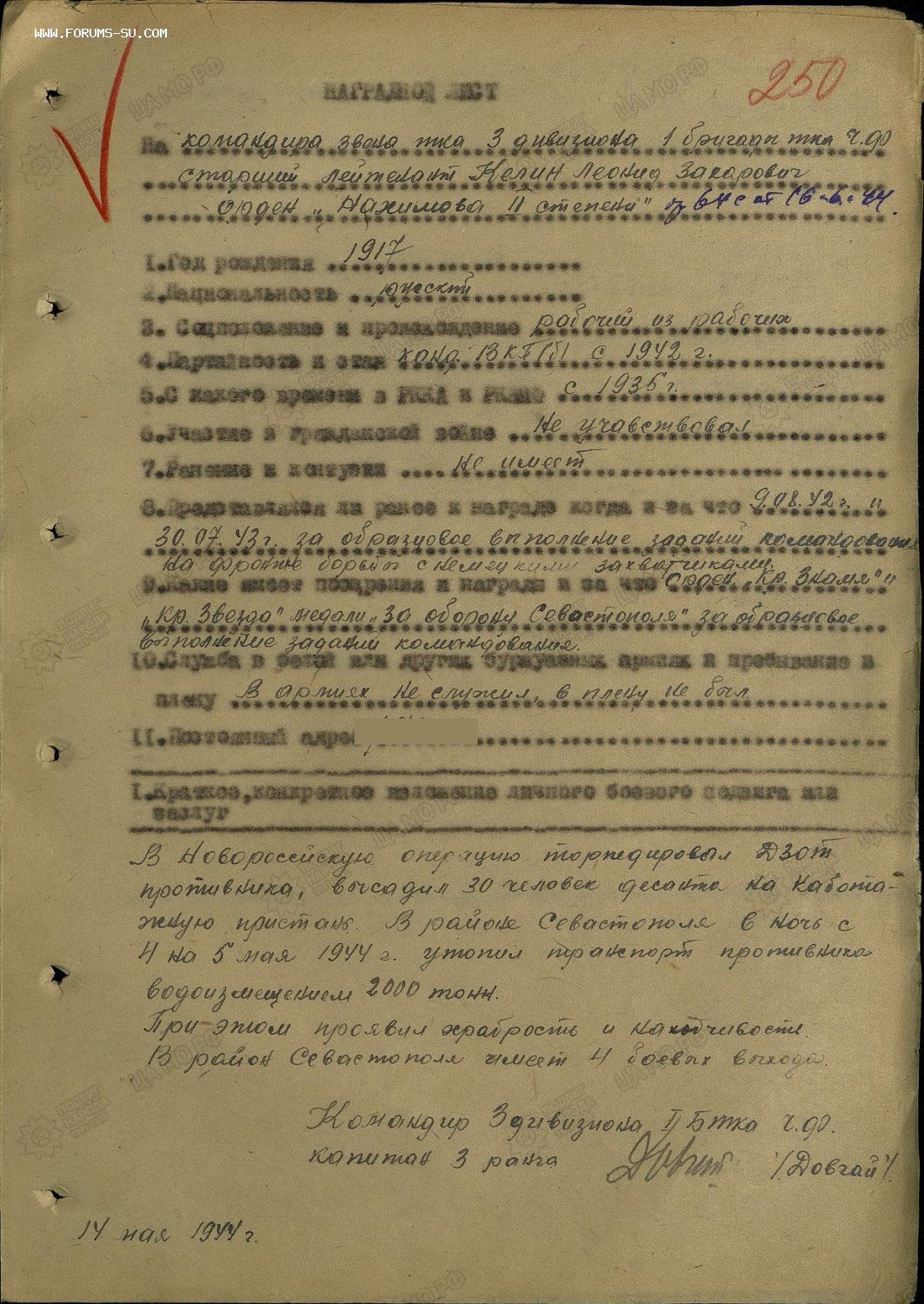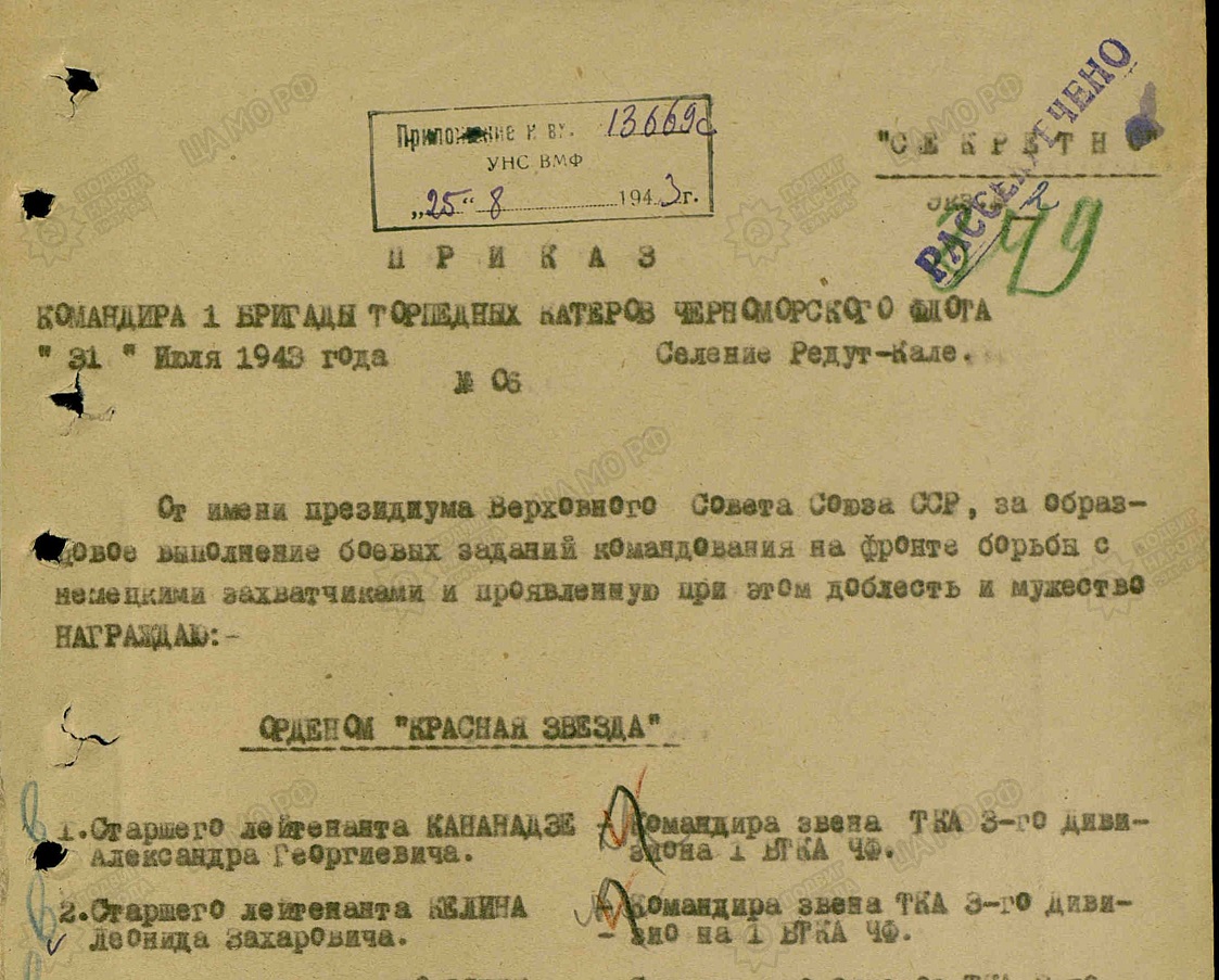 Для информации в мае 1944 г представлялся на Нахимова за транспорт 2000т дали ОВ 2 ст
