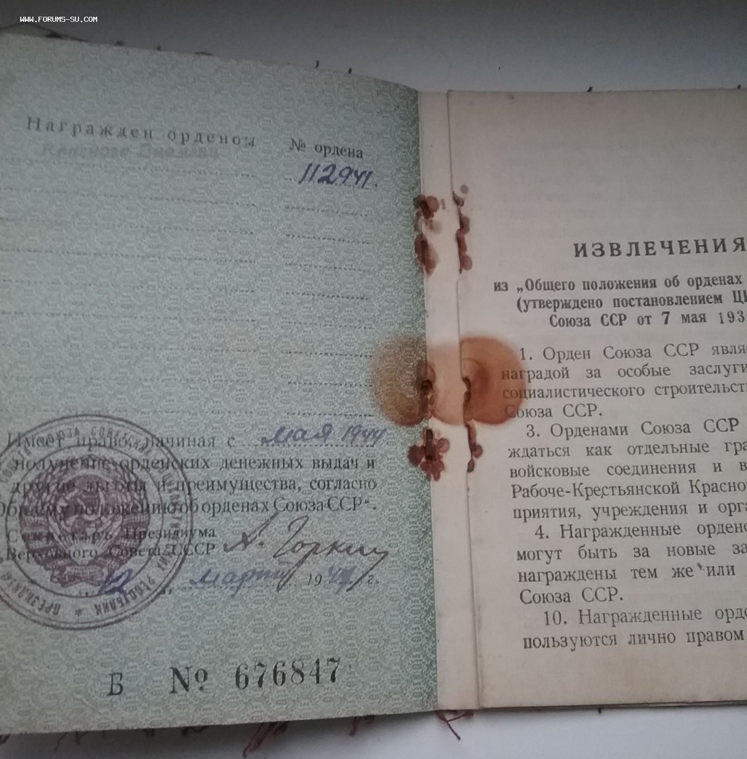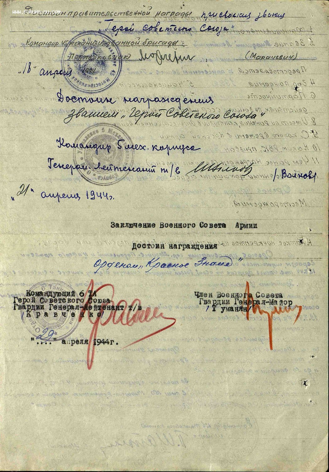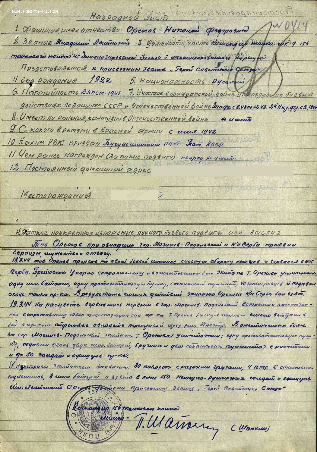 Знак на орденской книжке на командира танка за то, что первым ворвался на танке в г.Могилев-Подольский ( Украинская ССР )