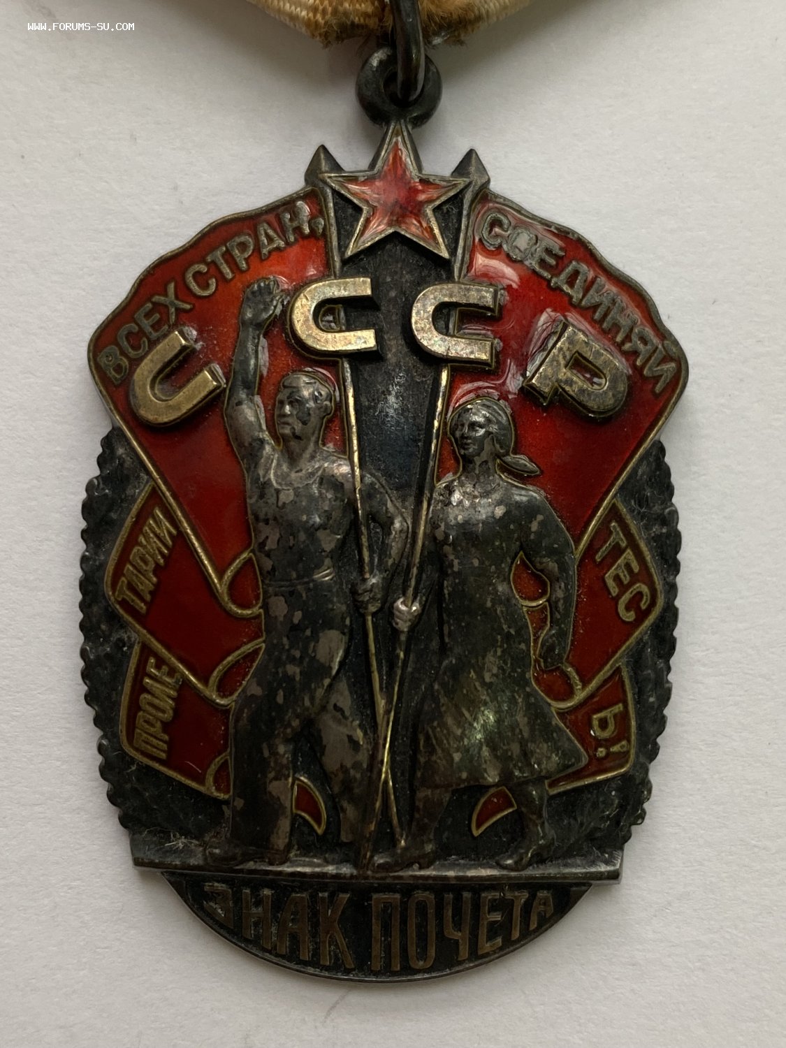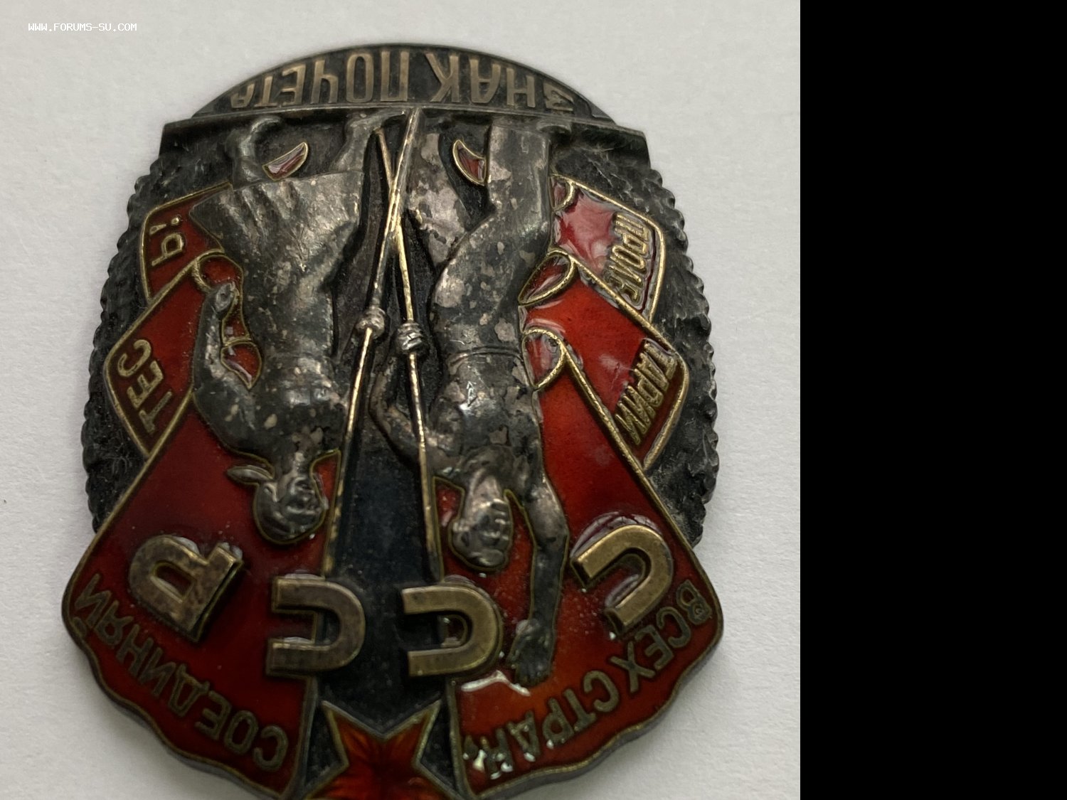 Гайки утрачены. На знаке скол эмали на ленте. На ЗП на первых трёх фото на знамени около "Р" светлая точка -это грязь, далее на фото её нет.