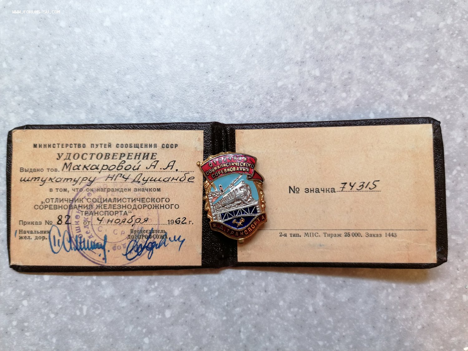 Отличник соц соревнования ЖД транспорта. МПС СССР 1962 год. НГЧ Душанбе. 74315