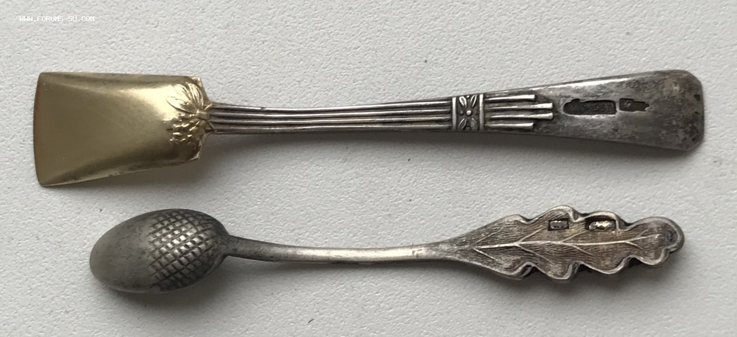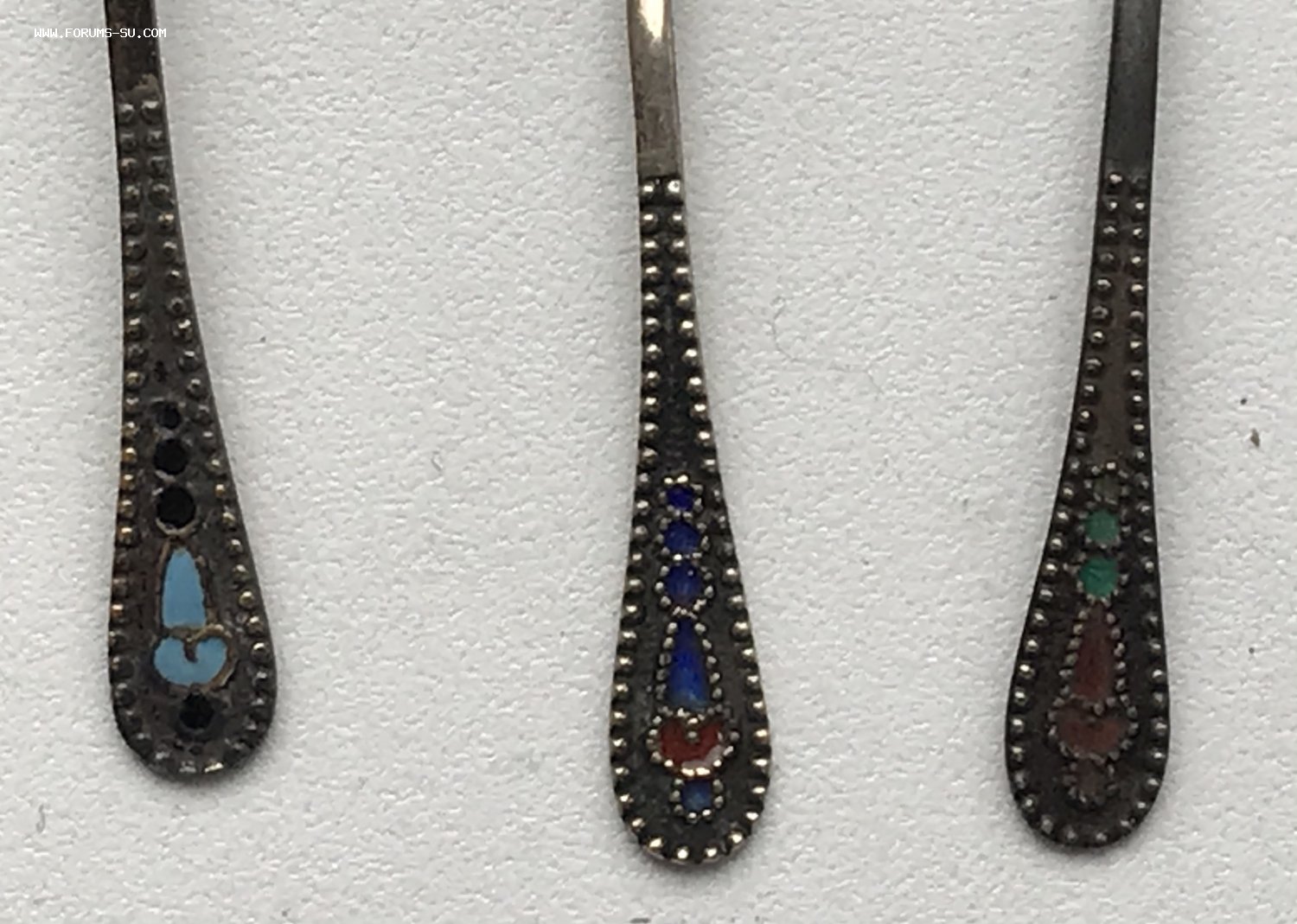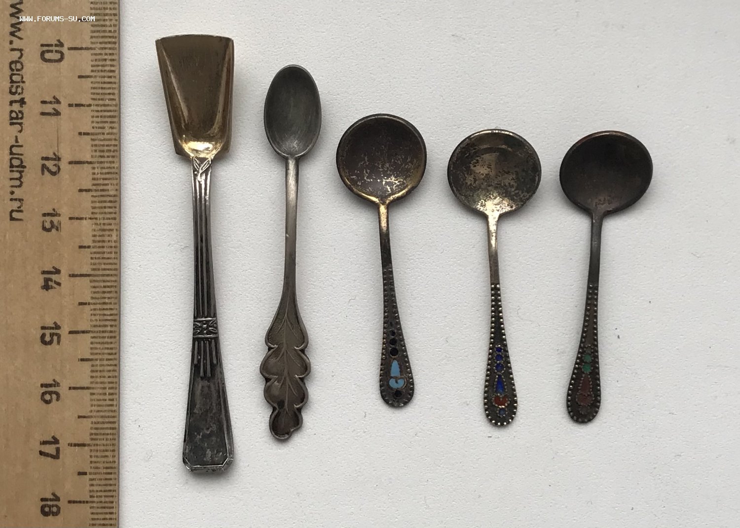 Пять серебряных ложечек для солонок. Золочение, эмаль Серебро 875 проба. Вес - 20 грамм.