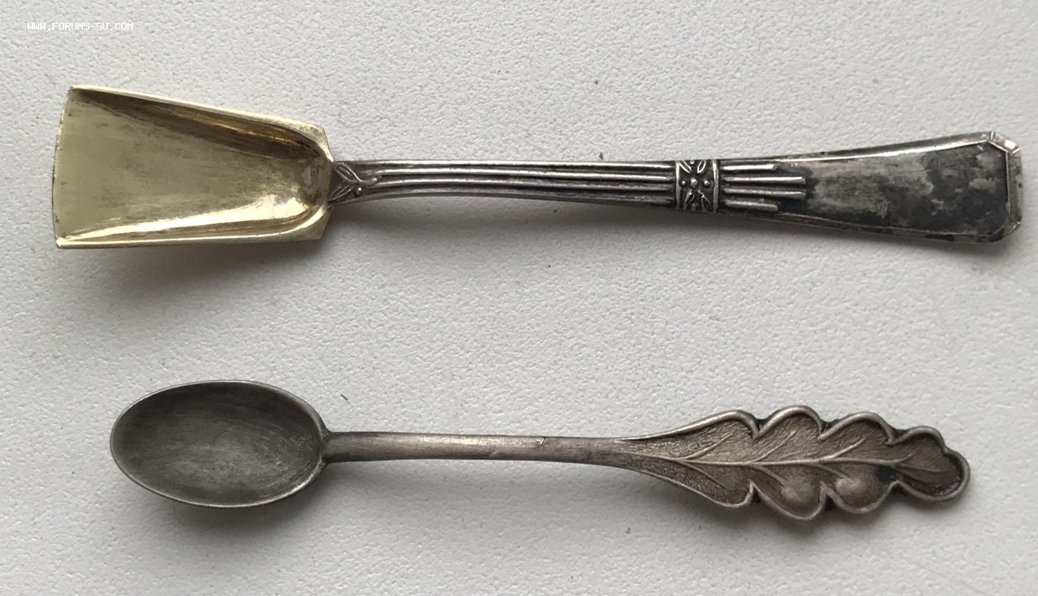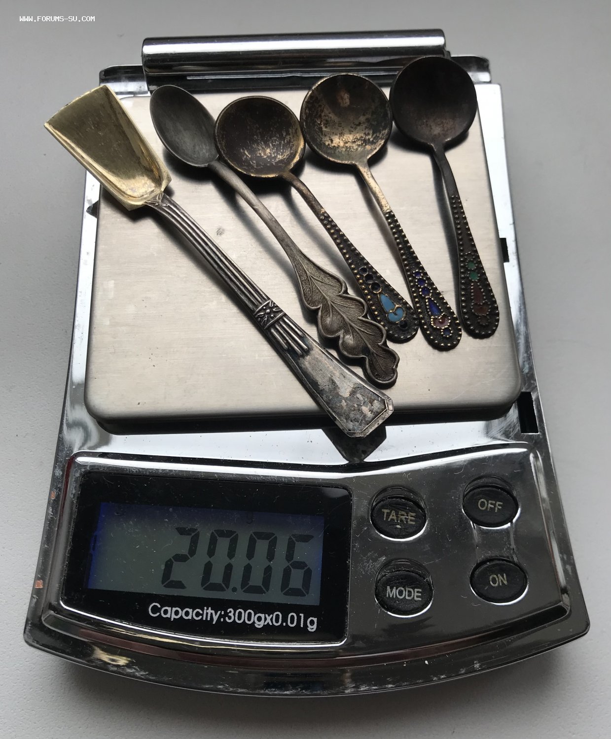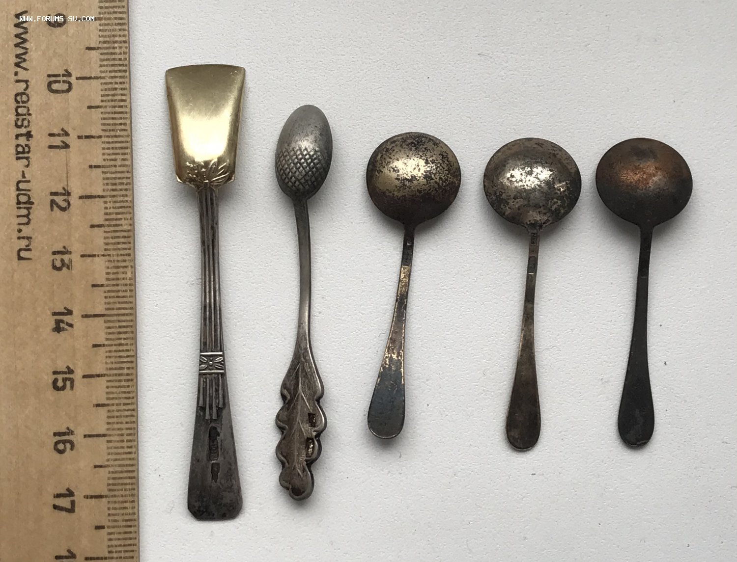 Пять серебряных ложечек для солонок. Золочение, эмаль Серебро 875 проба. Вес - 20 грамм.