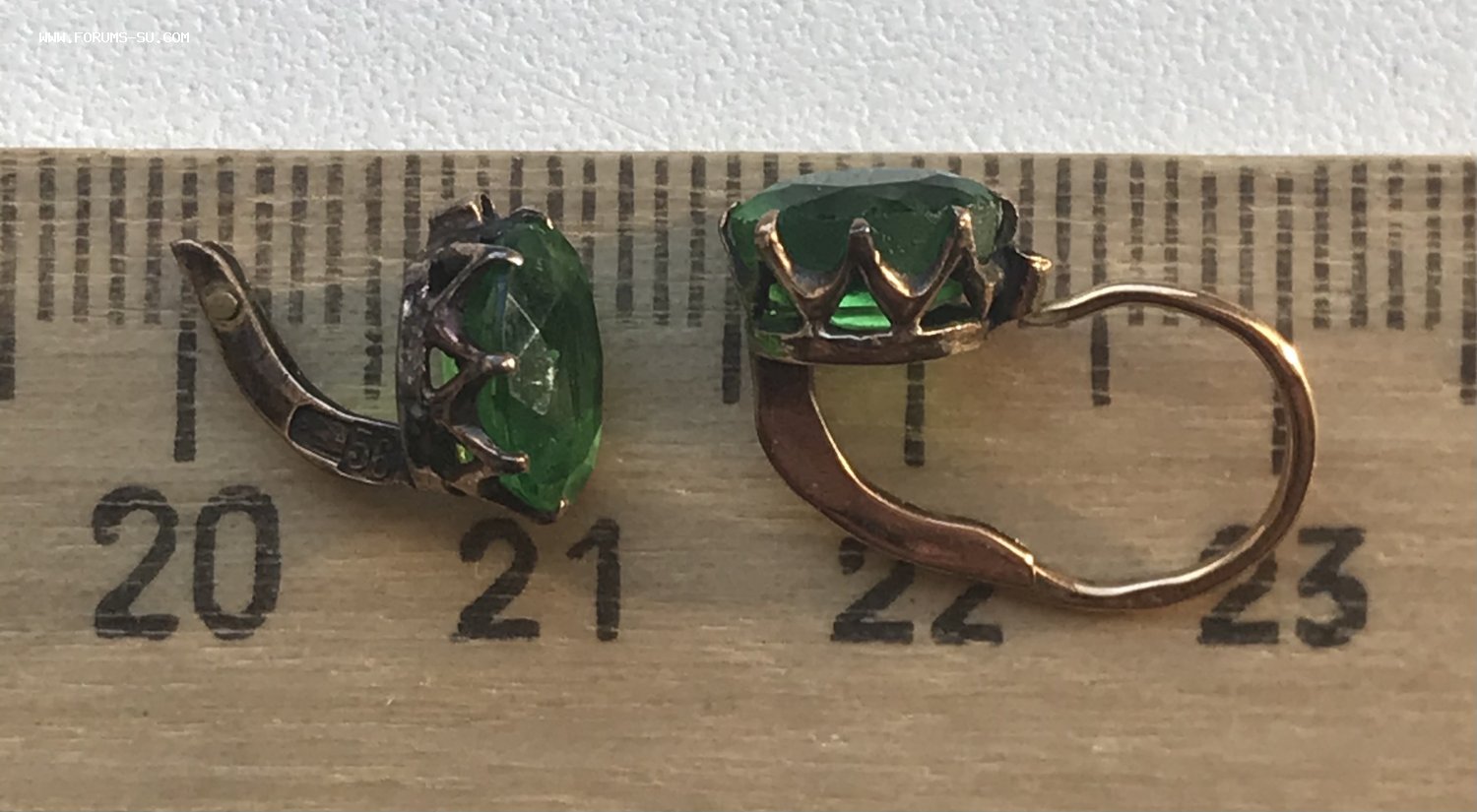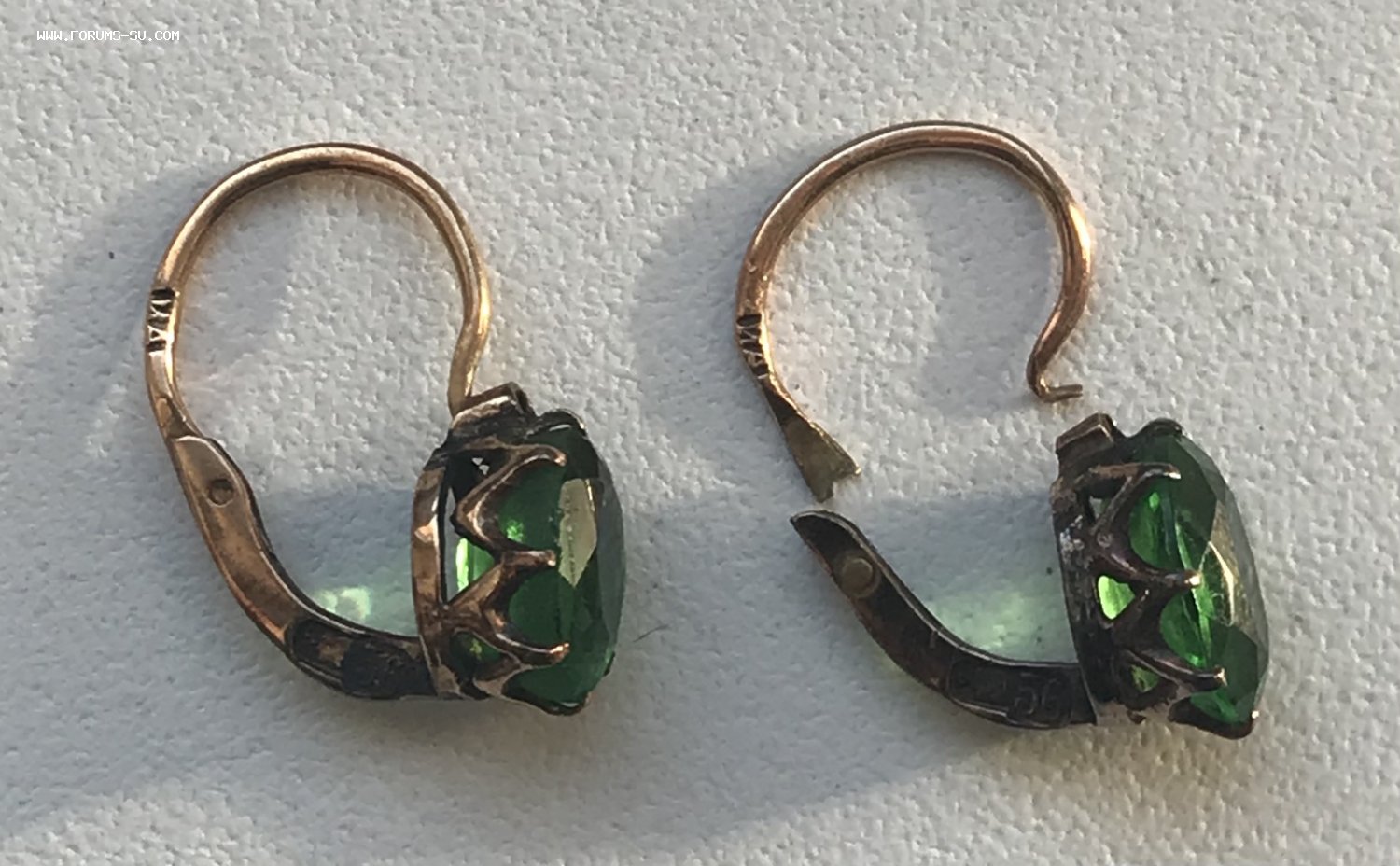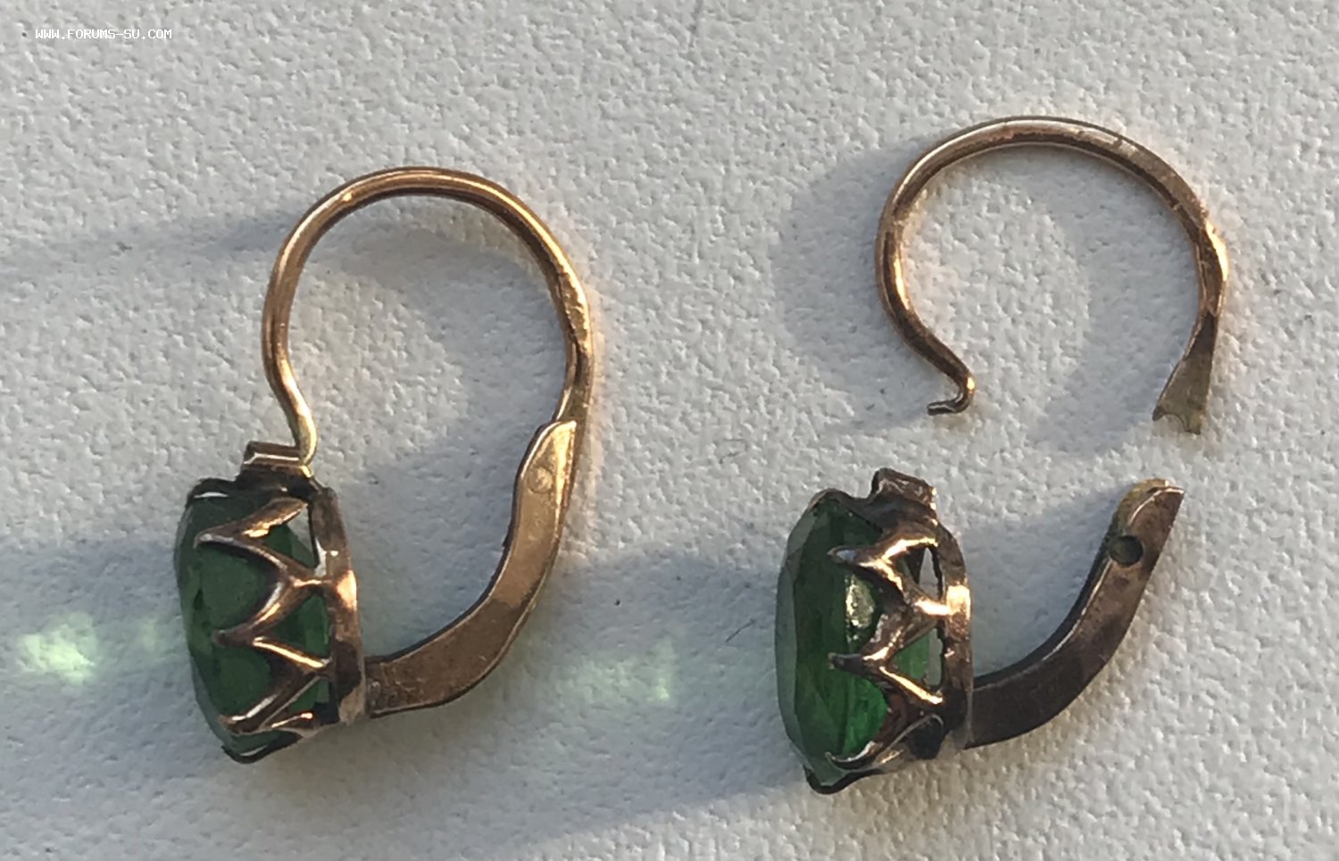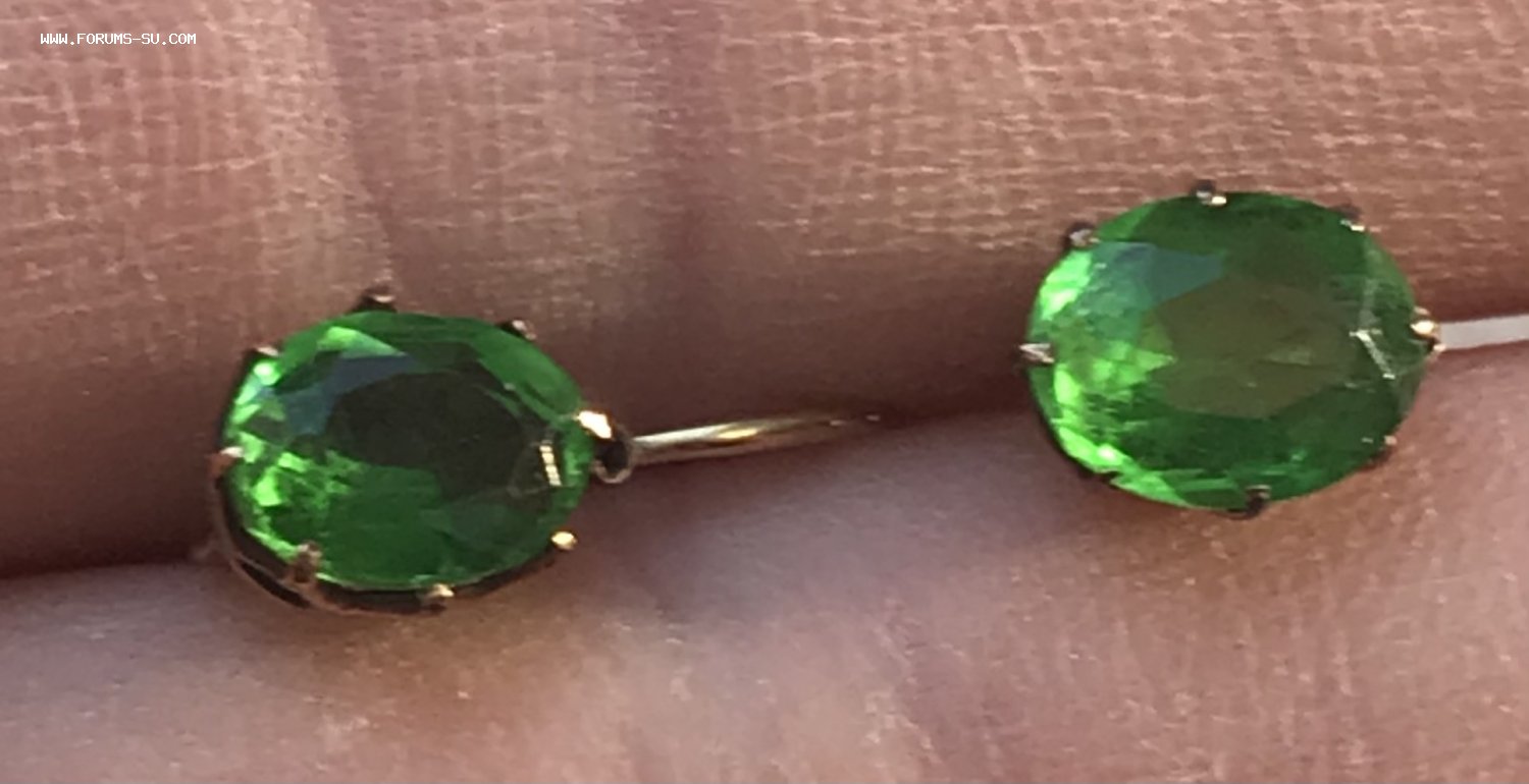 Золотые серьги 56 пробы с зелёным камнем. Вес 1,75 грамма. Сломано крепление дужки у одной из серёжек.
