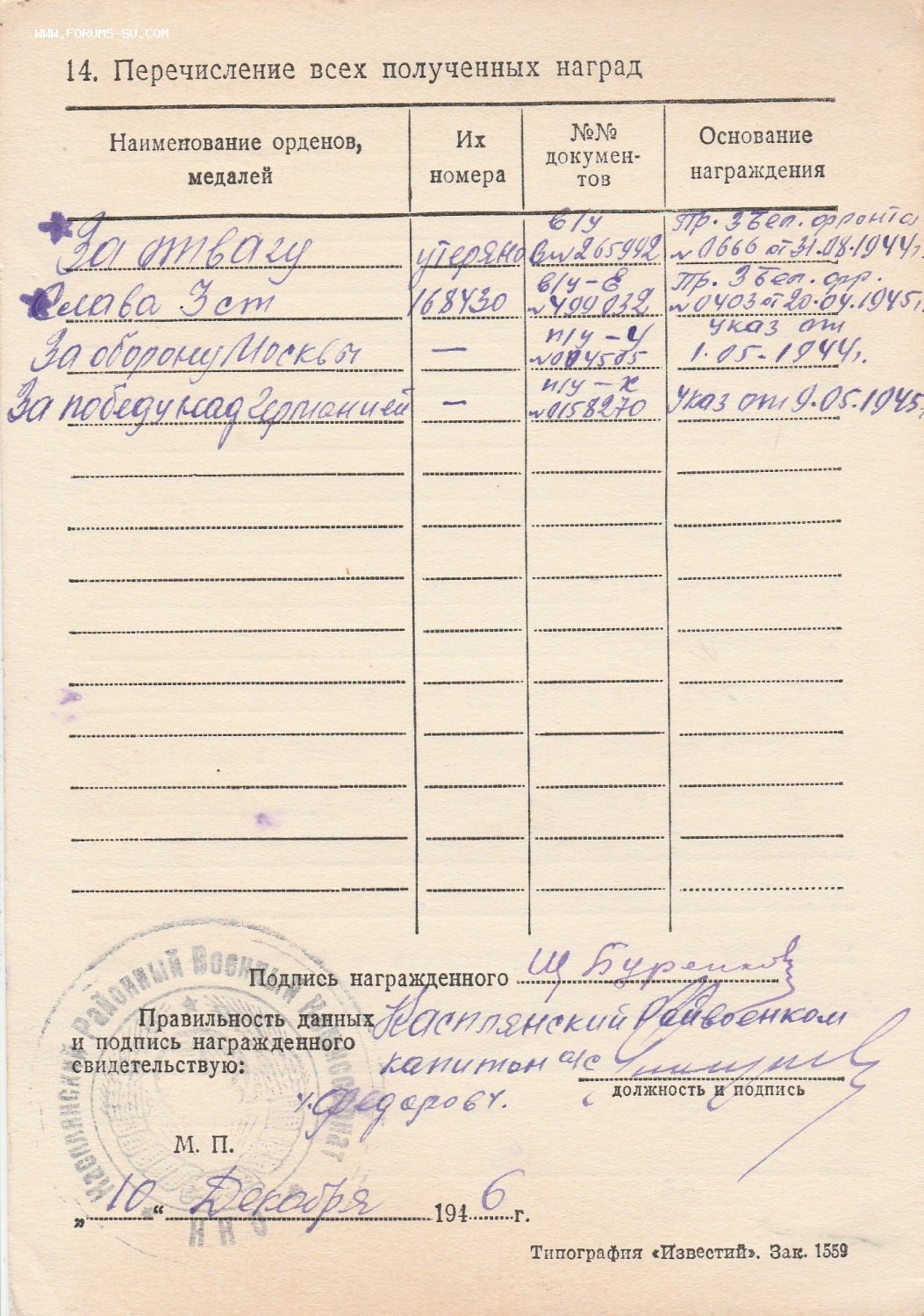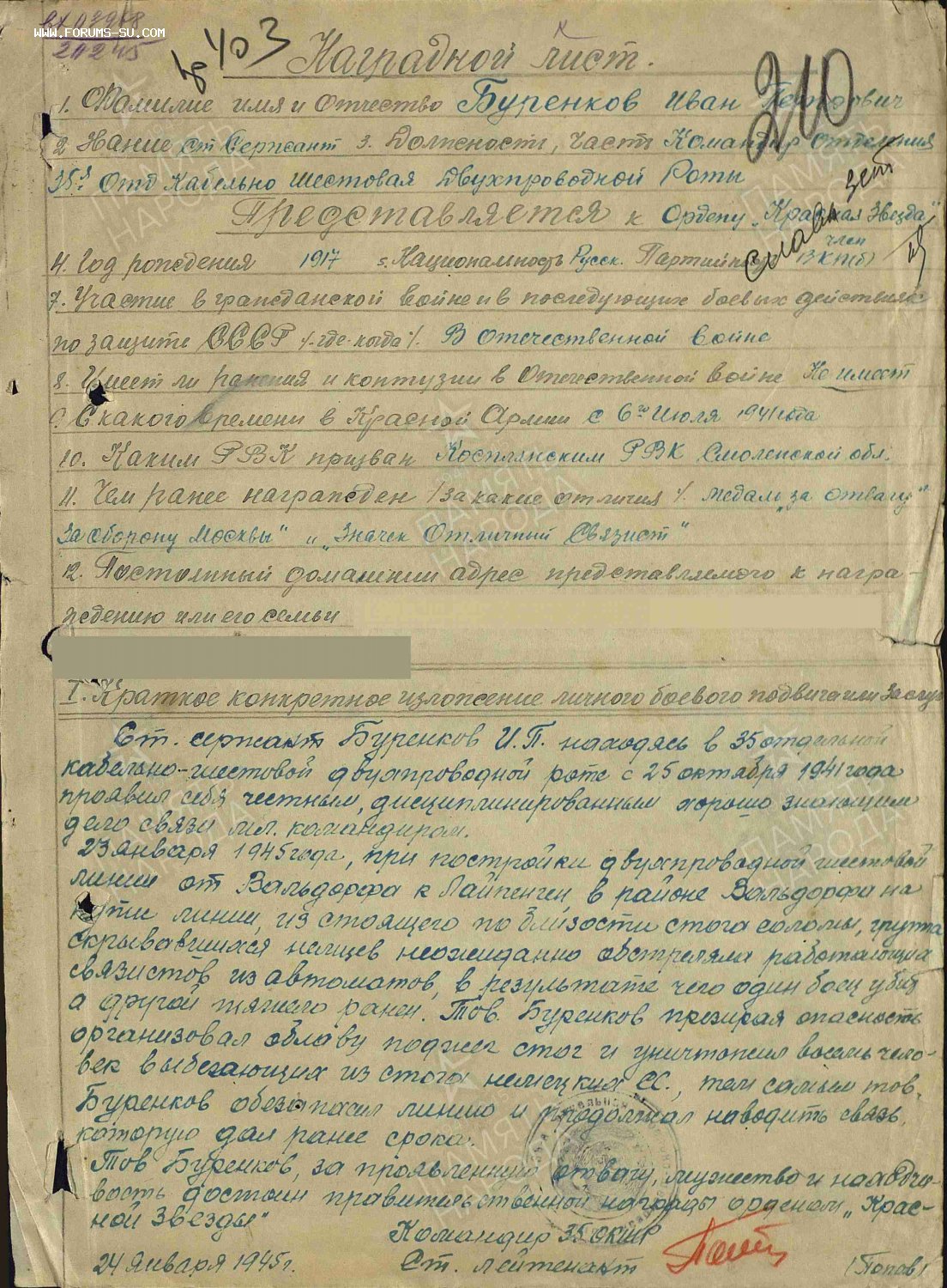Кавалер был награжден знаком "Отличный связист", в январе 1945 года при прокладке линии связи с товарищами попал в засаду, остался жив и отомстил за своих, в стогу сена спалил 8 солдат "СС". ( см. наградной лист).