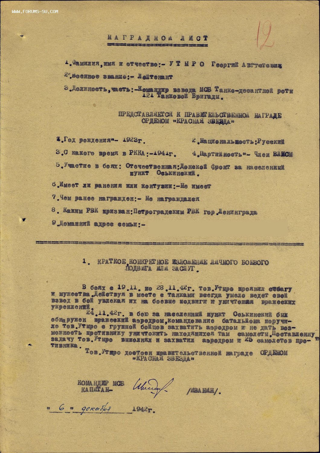 Награждение за Сталинград. Кавалер л-нт Утыро Георгий Августович