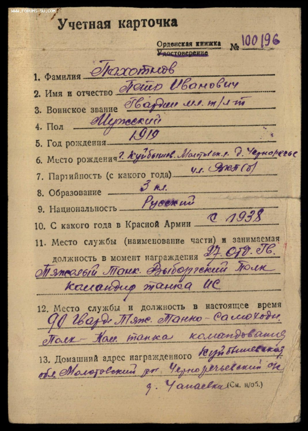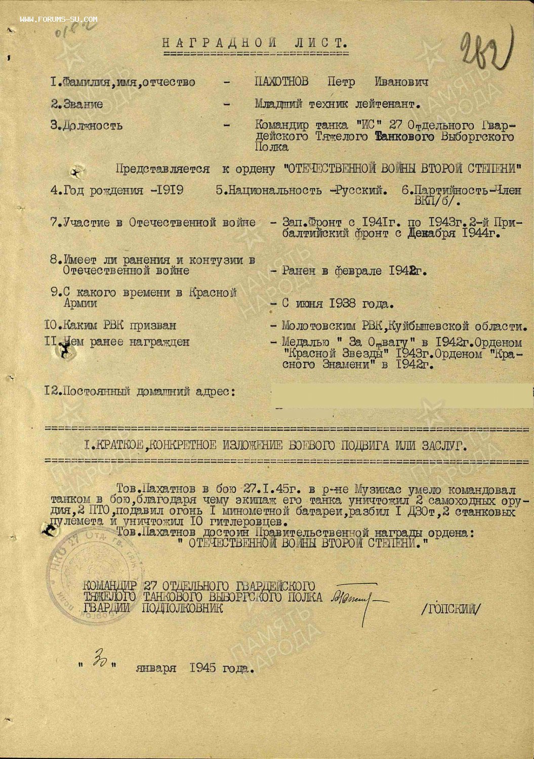[b]Командир танка ''ИС''27,01,45г. в районе Музикас умело командовал танком в бою,благодаря чему экипаж его танка уничтожил 2 самоходных орудия,2 ПТО,подавил огонь одной минометной батареи,разбил один ДЗОТ,2 станковых пулемета и уничтожил 10 гитлеровцев.[/b]